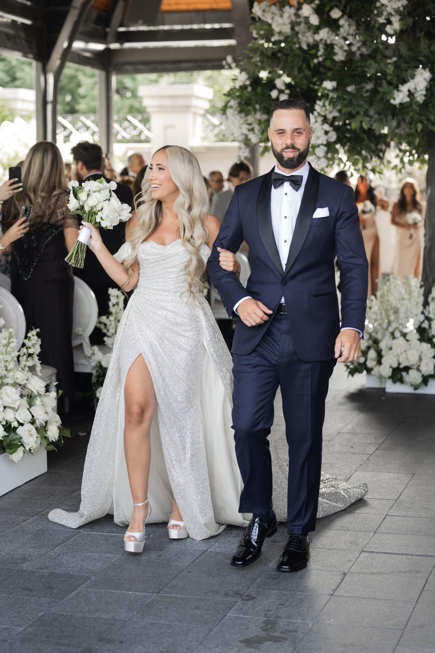 A bride and groom walk arm in arm down an aisle adorned with white flowers at their garden wedding at Château Le Parc. The bride wears a shimmering gown with a high slit, holding a bouquet, while the groom is in a navy tuxedo. Guests are seated in the background, witnessing their special moment.