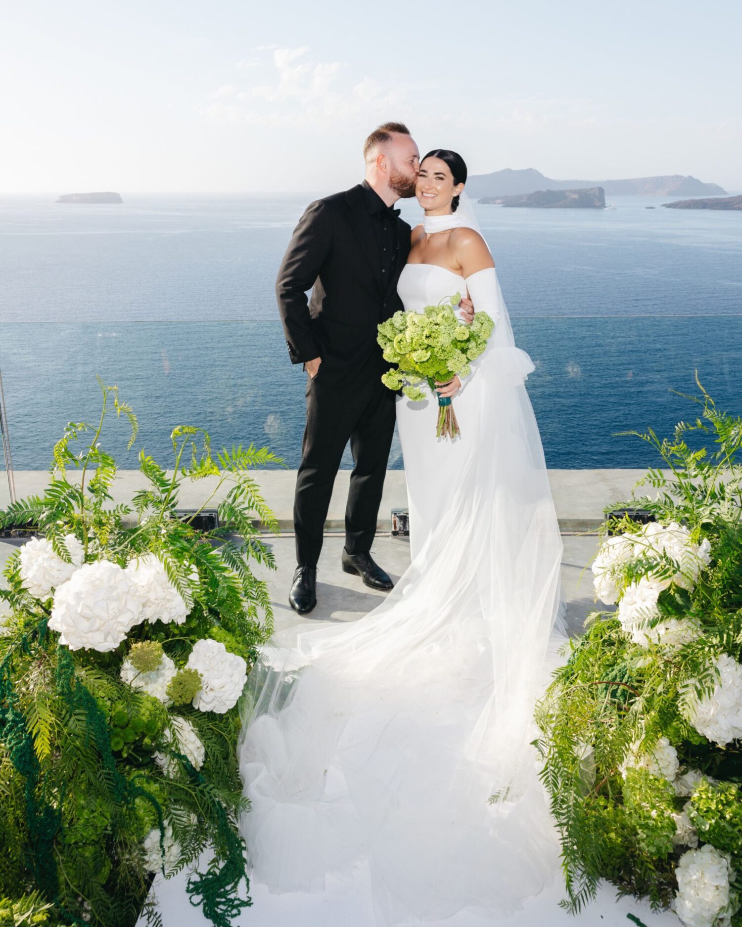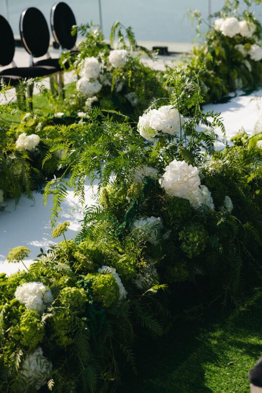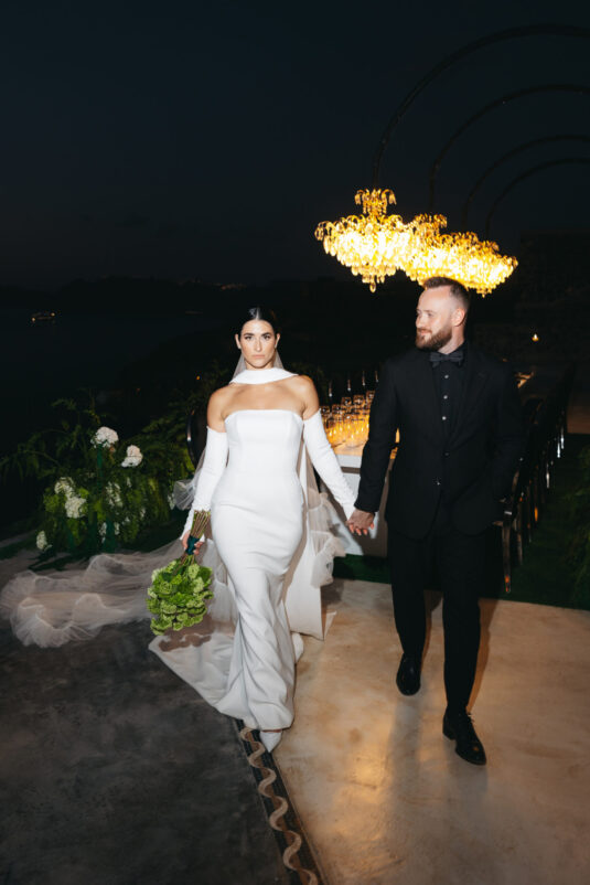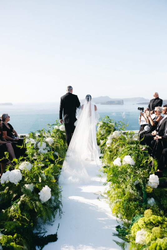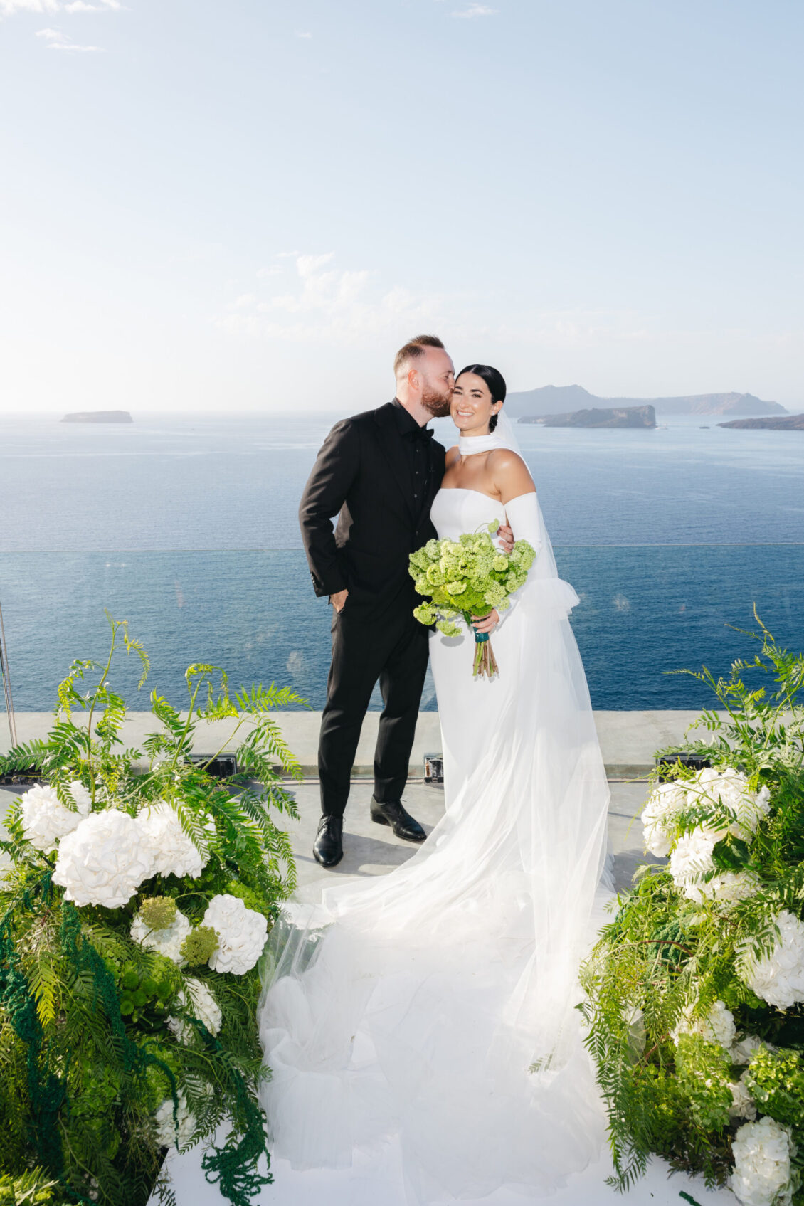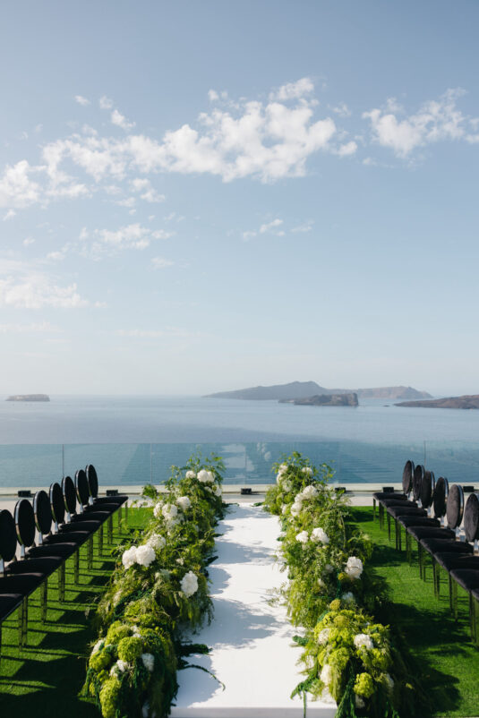 The couple exchanged vows in a serene ceremony that felt at once modern and timeless. The soft white and blue hues of the island served as a natural canvas, elevated by a palette of soft green accents and silver details. The ceremony space was designed to enhance the beauty of the surroundings, with lush greenery and clean, modern lines creating a sense of understated elegance. It was a moment suspended in time—peaceful, heartfelt, and completely unforgettable.