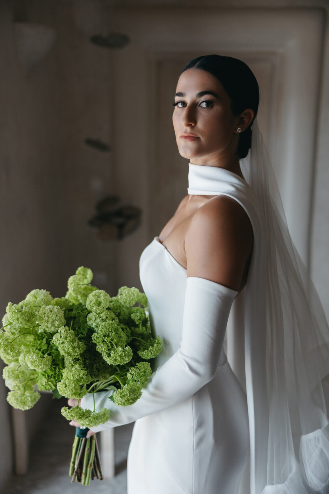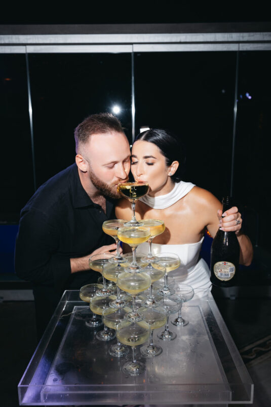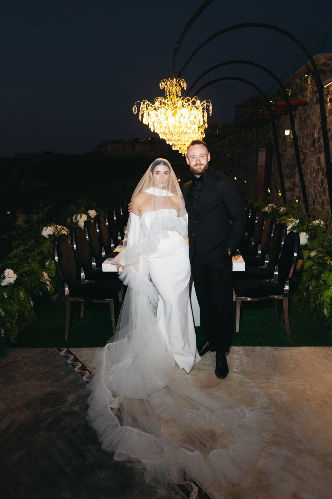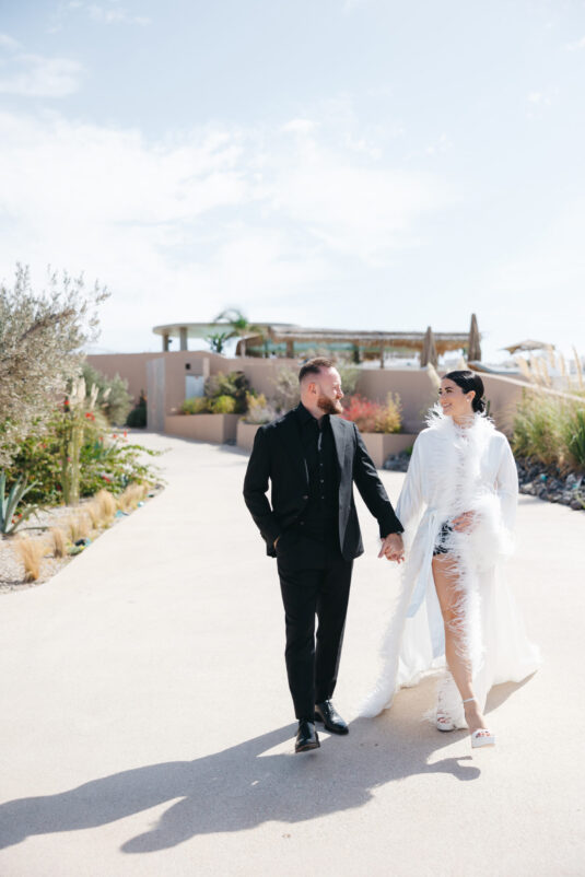 The couple exchanged vows in a serene ceremony that felt at once modern and timeless. The soft white and blue hues of the island served as a natural canvas, elevated by a palette of soft green accents and silver details. The ceremony space was designed to enhance the beauty of the surroundings, with lush greenery and clean, modern lines creating a sense of understated elegance. It was a moment suspended in time—peaceful, heartfelt, and completely unforgettable.