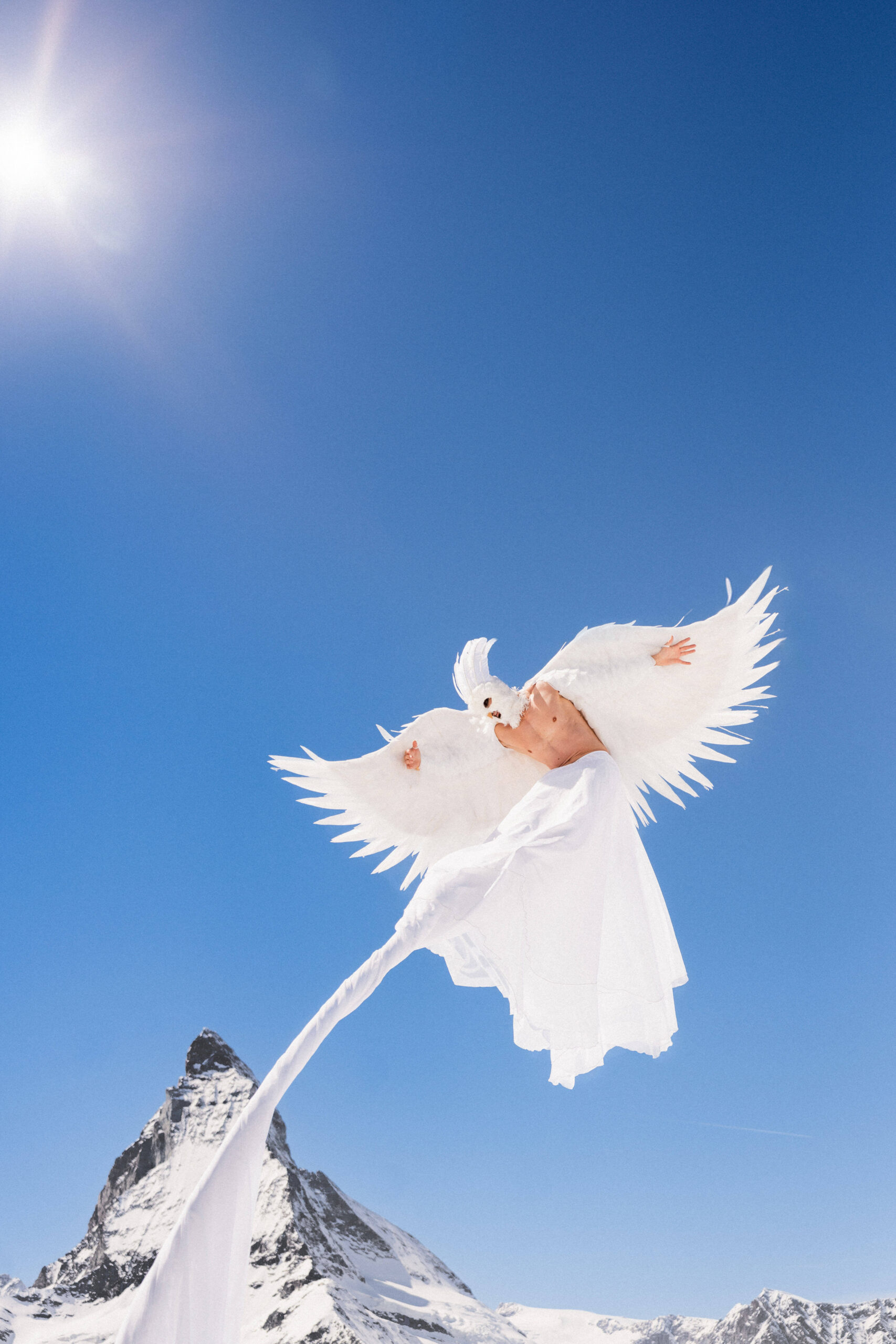 A person dressed in white, resembling an angel with outstretched feathered wings, floats in a clear blue sky above Zermatt. Below, a snow-covered mountain peak gleams as sunlight streams from the top left corner, capturing the magic of a Happily Ever Altitude scene.