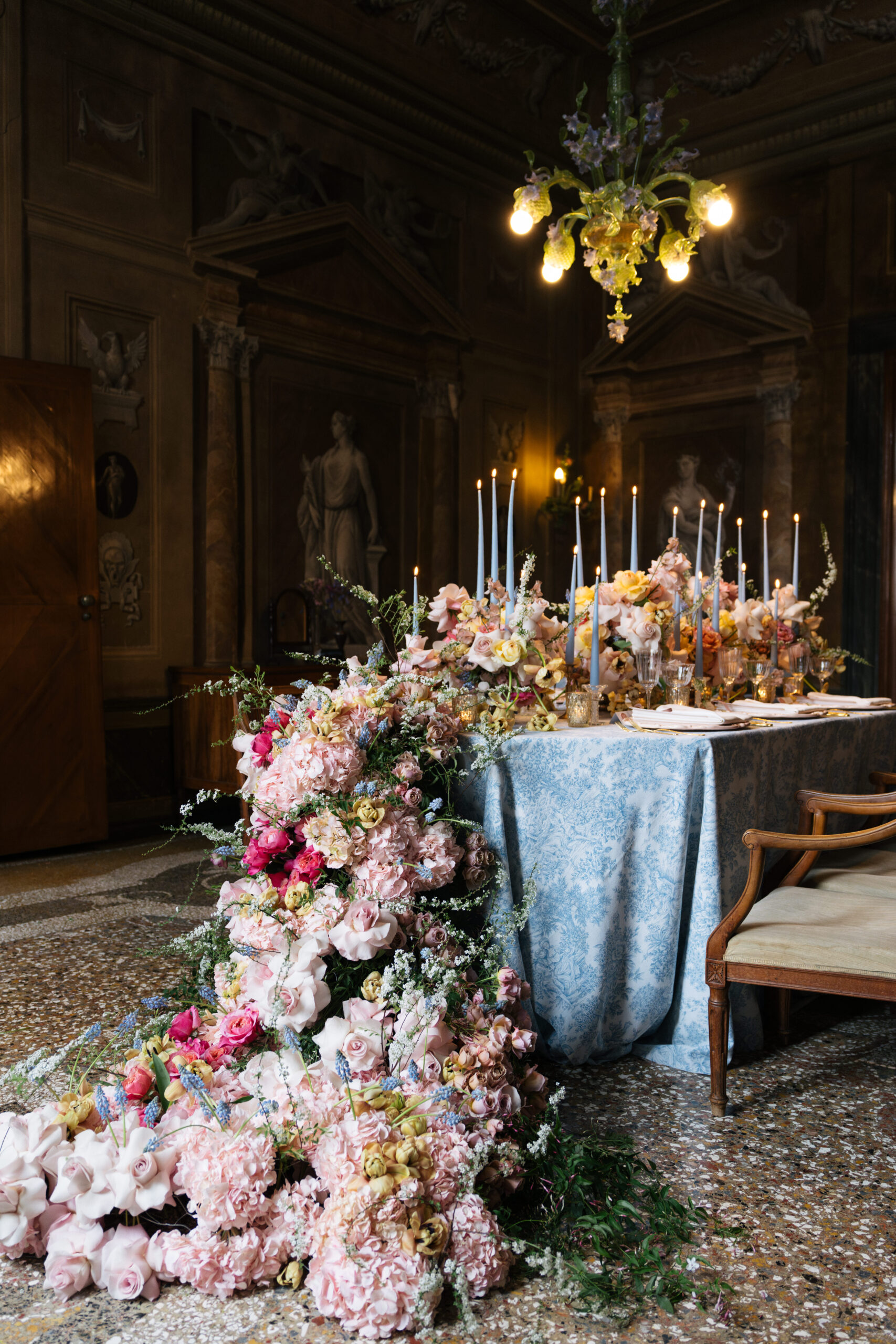A lavishly decorated dining table with a blue tablecloth, tall taper candles, and an opulent cascading floral arrangement evokes the allure of a seductive Venice wedding celebration in an elegant, ornate room.