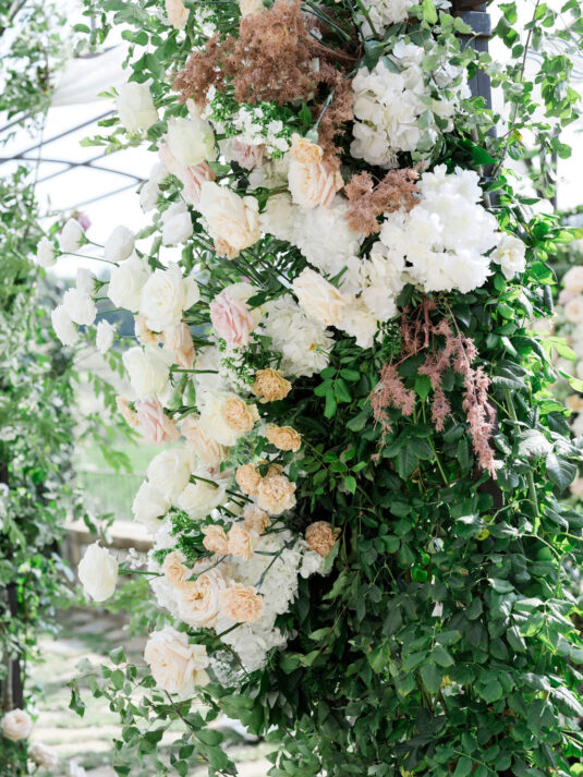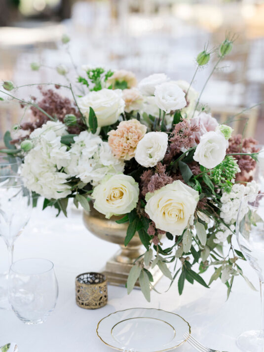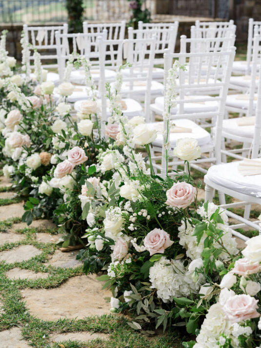 Set against the estate’s lush gardens and cypress-lined pathways, the couple exchanged vows in a heartfelt ceremony, framed by exquisite floral arrangements from Lilla Florals. The soft hues of blush, ivory, and greenery complemented the natural beauty of the venue, creating an ethereal setting for the moment they said, “I do.”