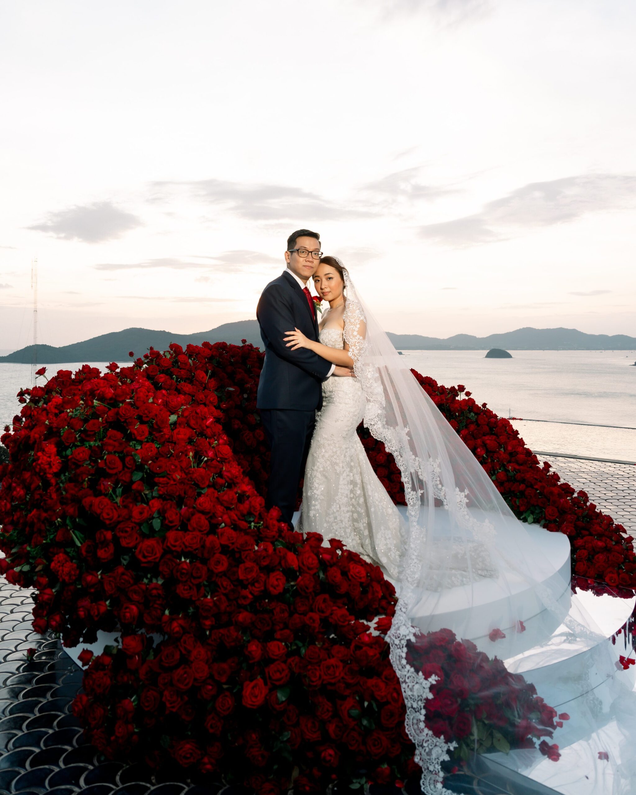 A bride and groom embrace on a platform covered with red roses, creating a magical red rose wedding scene against calm water and distant hills beneath a cloudy sky. The bride stuns in a long, lace gown and flowing veil.