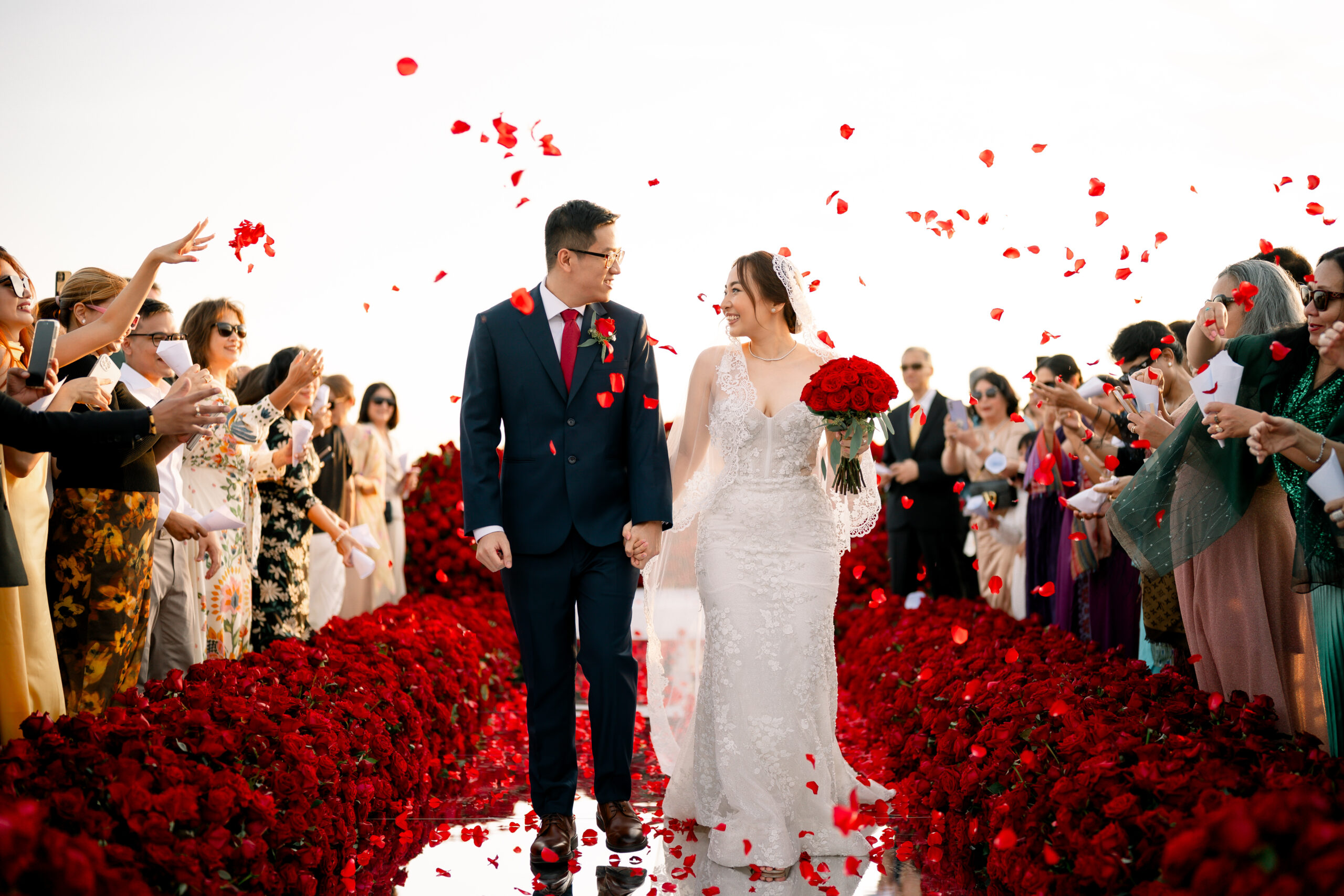A joyful couple walks down a red rose wedding aisle as guests shower them with petals. Smiling and hand-in-hand, they’re surrounded by well-dressed friends and family celebrating outdoors.