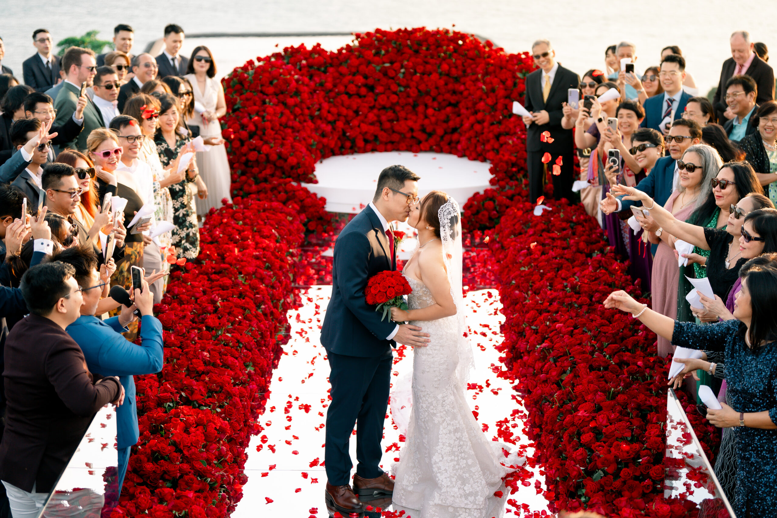 A bride and groom kiss at their red rose wedding ceremony, surrounded by guests snapping photos and tossing petals. The aisle is lined with vibrant red roses, forming a large heart shape around the happy couple.