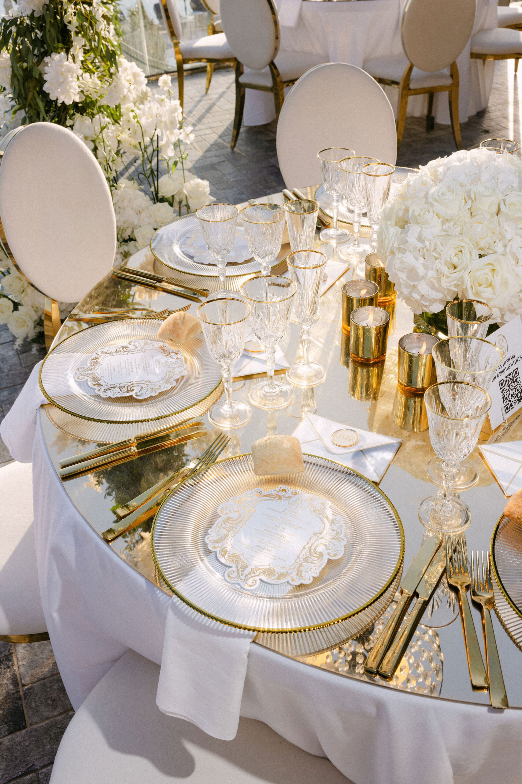 A round table set for a luxury wedding in Mykonos features gold-rimmed plates, crystal glasses, gold cutlery, white napkins, and a centerpiece of white flowers atop a shiny gold surface with elegant white chairs.