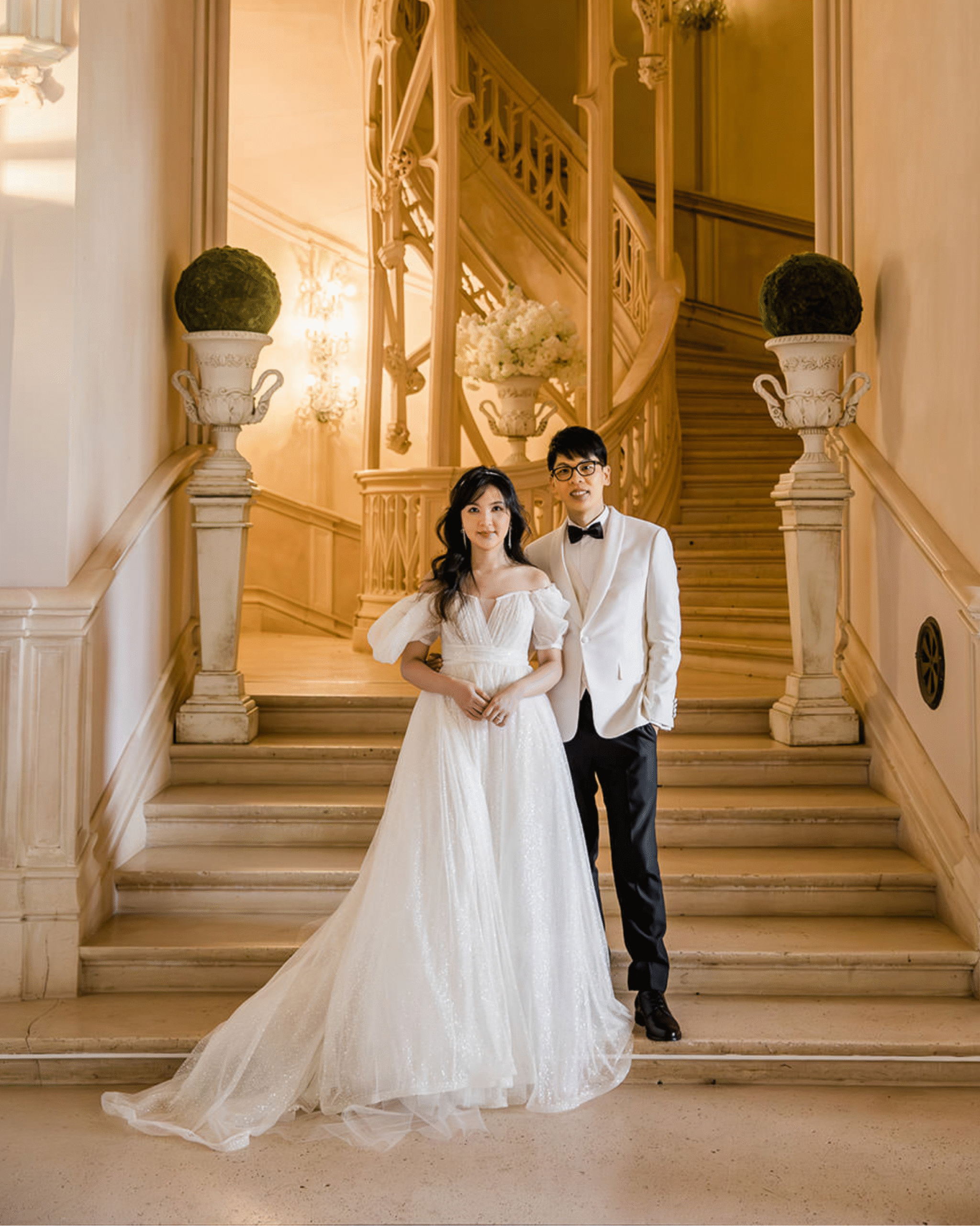 A bride in a white gown and a groom in a white tuxedo jacket stand together at the bottom of an elegant, curved staircase—a true fairy tale elopement at Château Challain in a grand, ornately decorated indoor setting.