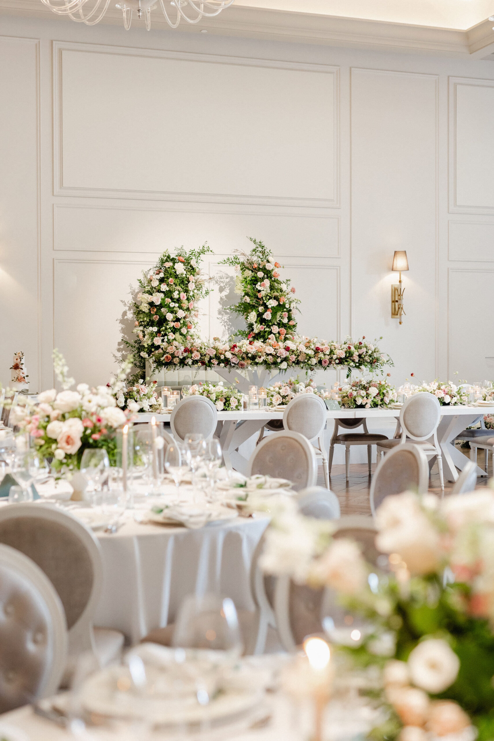 Elegant European garden wedding reception with round tables set in white linens, glassware, and blush blooms. The head table features lush pink and white flowers with greenery against a white paneled wall.