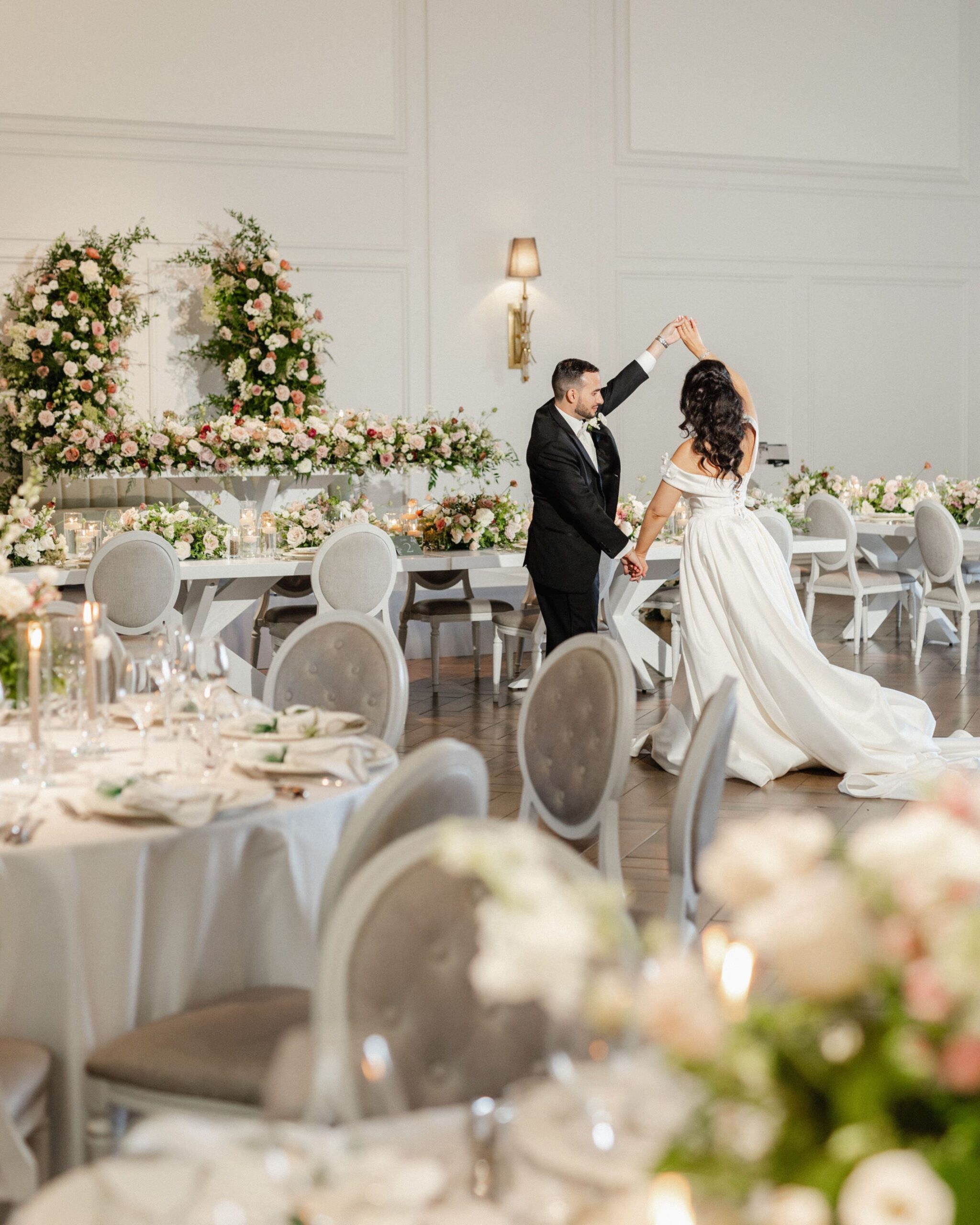 A bride and groom dance in an elegant, European garden-inspired wedding reception hall filled with flower arrangements, round tables, gray chairs, and candlelit centerpieces for a romantic celebration.