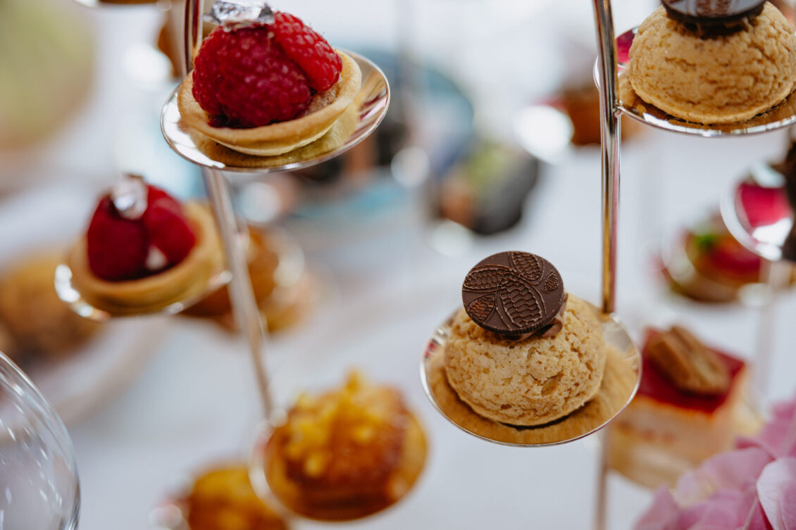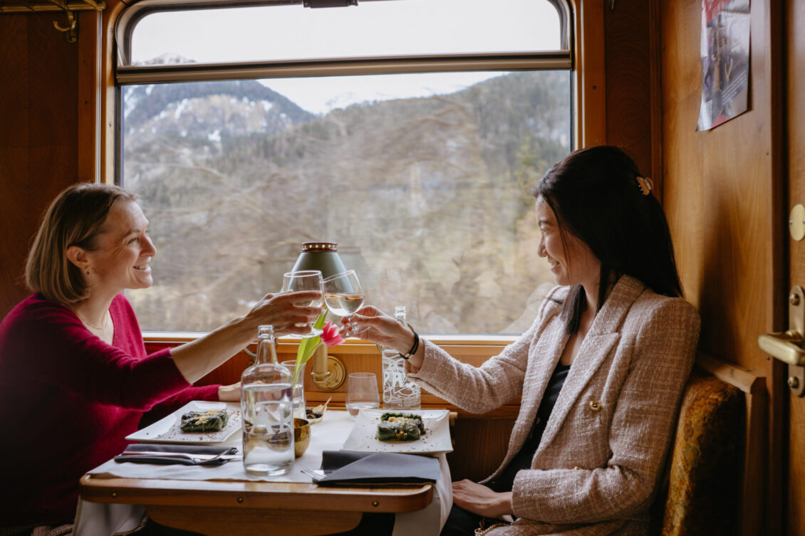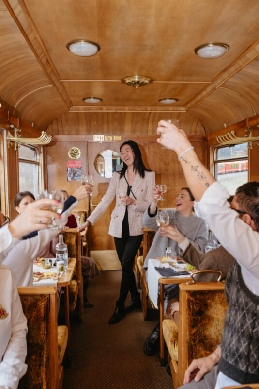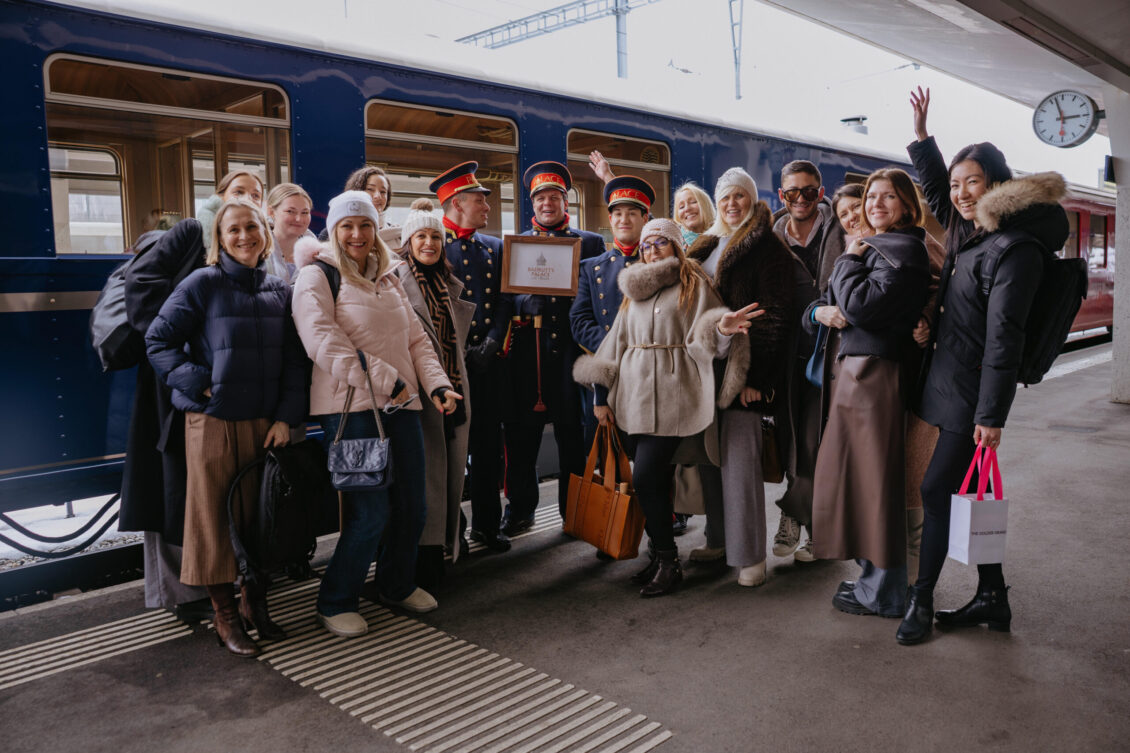 After a stylish breakfast networking event with local Swiss wedding vendors, hosted at the Dolder Grand—complete with panoramic views and elegant hospitality—the group was treated to a stunning cake display by A Cake Story, offering a sweet teaser of her incredible design talents. From there, the journey continued aboard the Grand Train Tour of Switzerland, winding through breathtaking mountain vistas en route to St. Moritz.