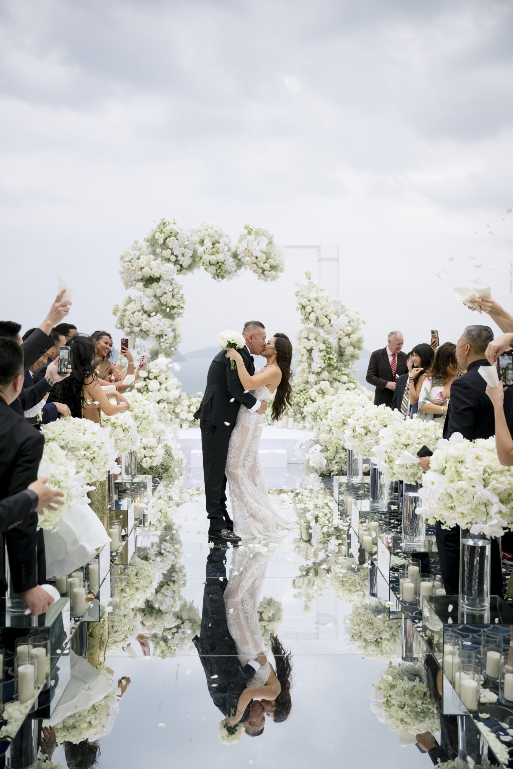 A bride and groom kiss at the end of a glass aisle, surrounded by white flowers and cheering guests. This modern luxury wedding scene features a cloudy sky and a heart-shaped floral arch behind the couple.