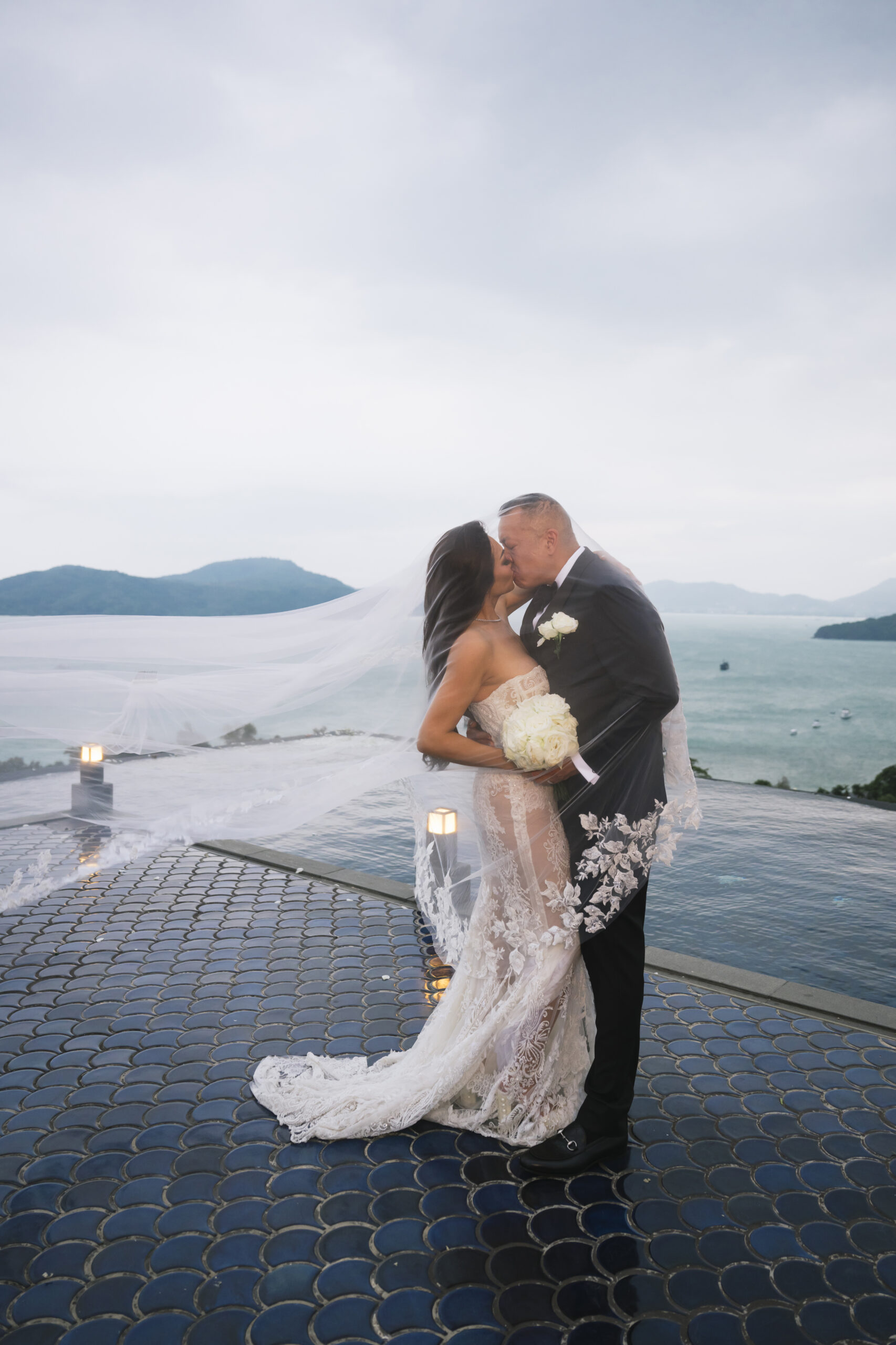 A bride and groom share a kiss outdoors by the water, with mountains behind them. In this modern luxury wedding scene, the bride’s lace gown and flowing veil complement her white flowers, while the groom looks sharp in a black suit.