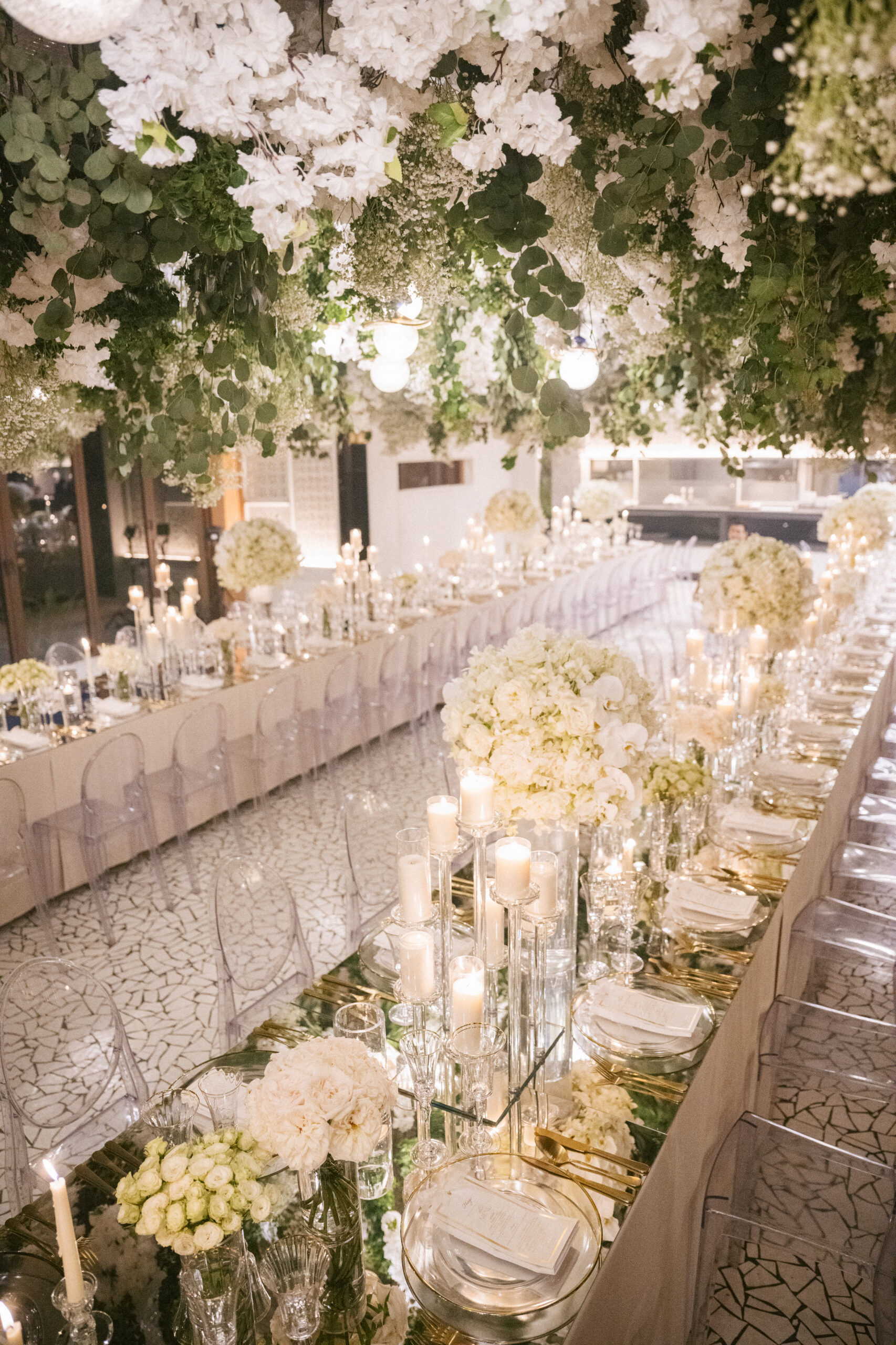 Elegant, modern luxury wedding reception with long tables decorated with white flowers, glass candle holders, clear chairs, and lush floral arrangements hanging from the ceiling. The setting is bright and romantic.