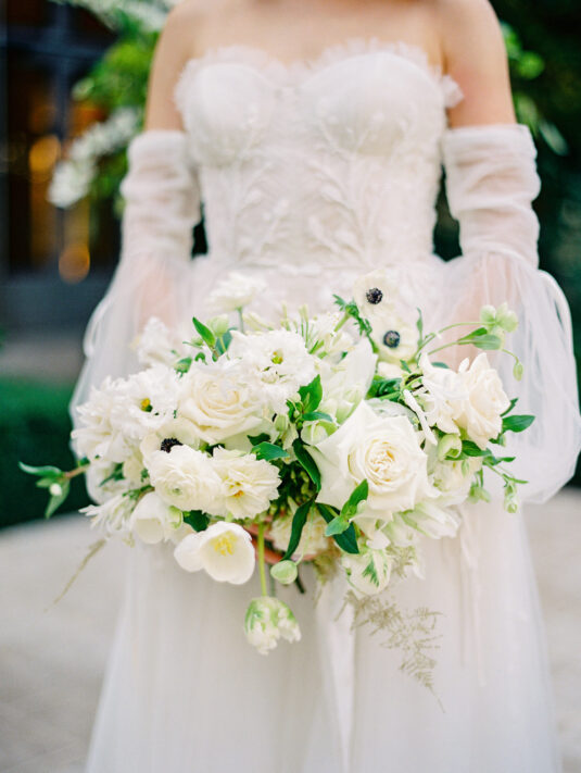 The bride’s style was nothing short of couture magic—her off-the-shoulder princess gown featured diamond and pearl bows, complemented by a striking red lip and emerald engagement ring. Her walk to the ceremony was as theatrical as it was touching, led by a graceful ballerina through an aisle of hydrangea-filled arches. For the vows, she carried a classic white bouquet that matched the refined detailing of her long-sleeved heart-shaped neckline gown. A delicate tiara sealed the fairytale look.