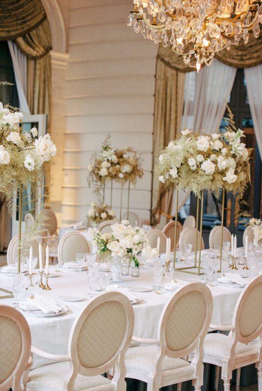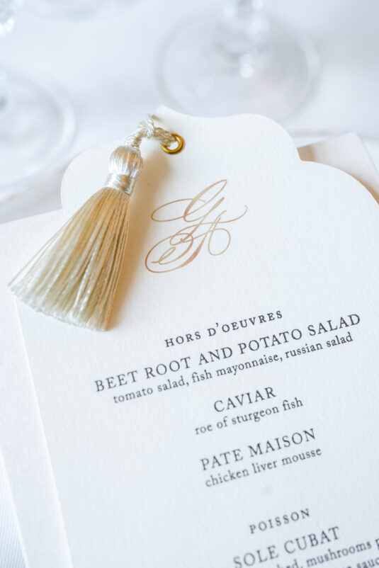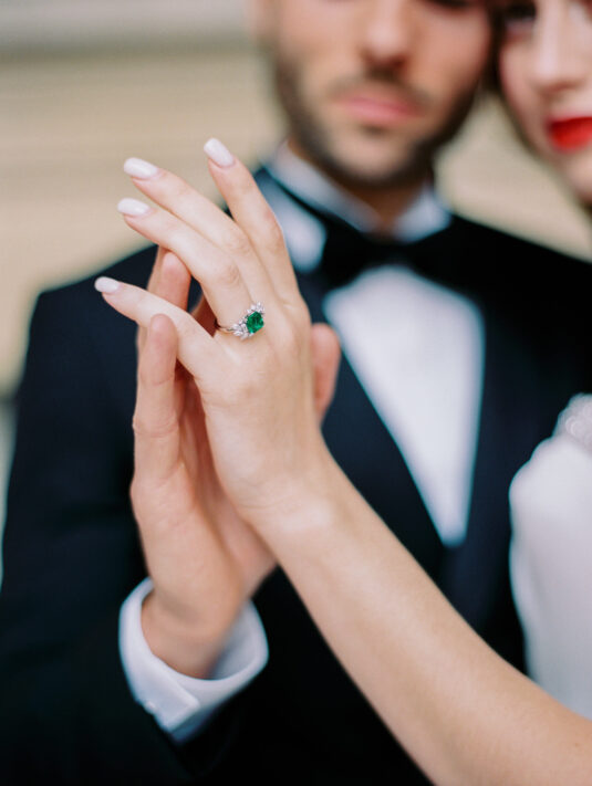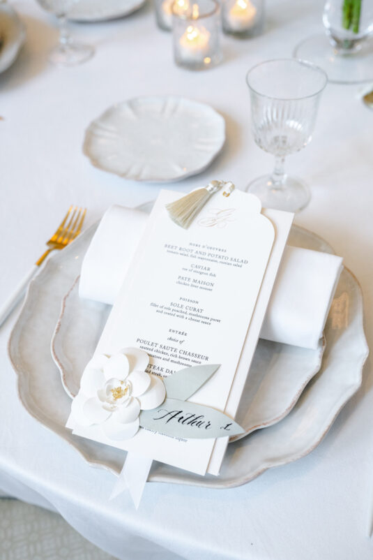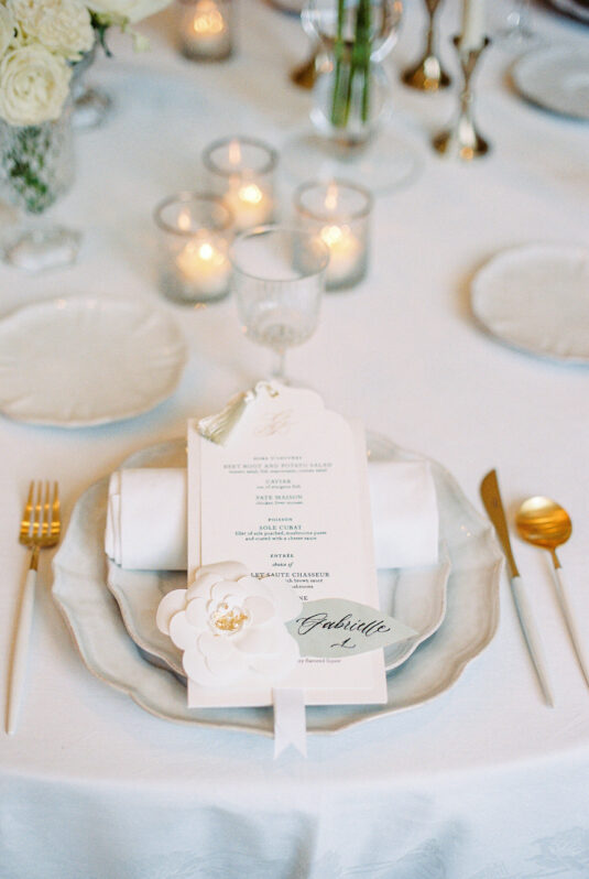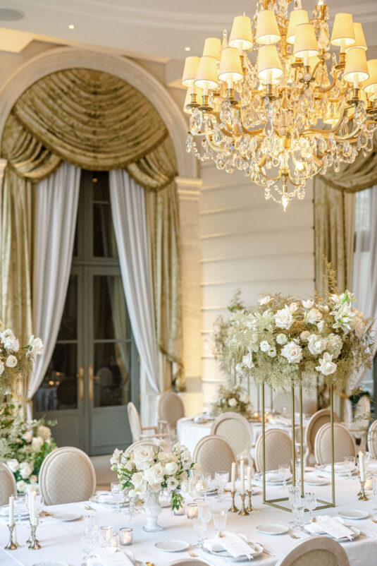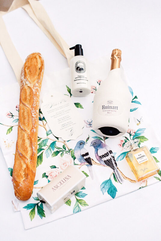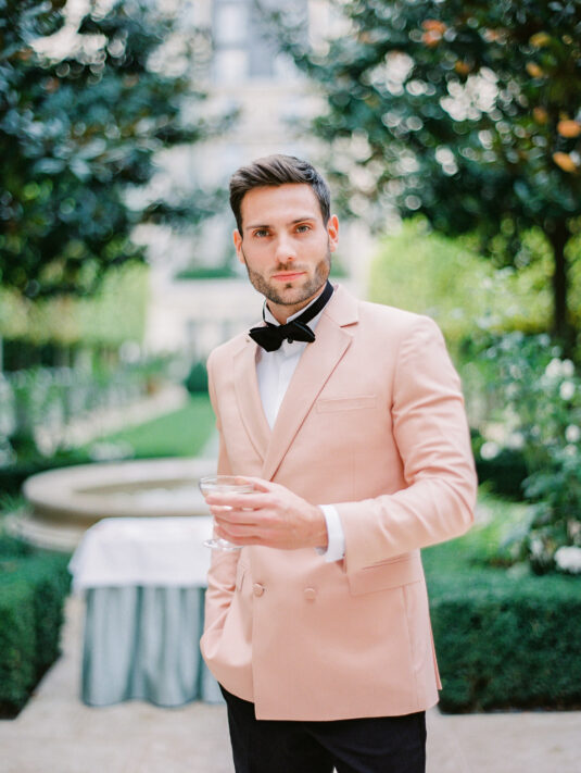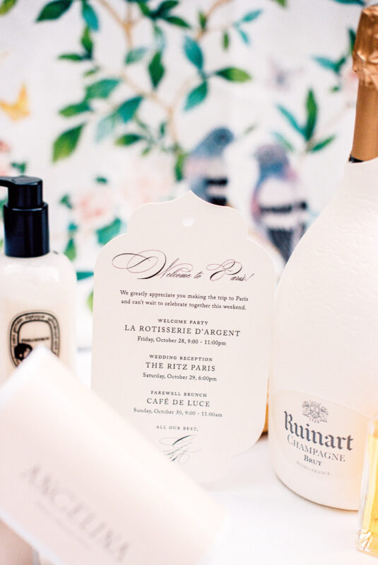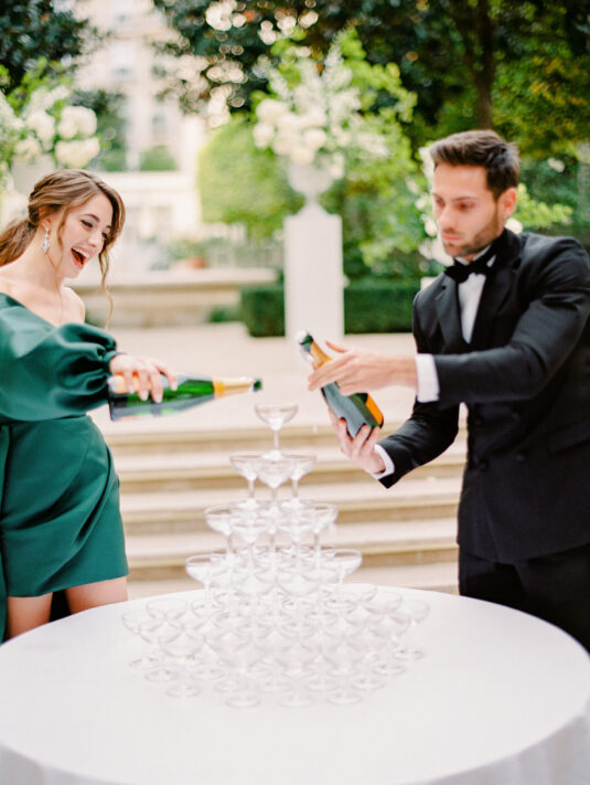 As the day transitioned into evening, so did the fashion. The bride changed into a jaw-dropping emerald gown that mirrored her engagement ring, while the groom opted for a peach-salmon dinner jacket—a palette that felt as fresh as it was sophisticated. The reception design was infused with Coco Chanel-inspired touches, from white camellias adorning each table to custom welcome totes filled with Parisian treasures: Chanel No. 5, fresh baguettes, champagne, and sweets from Angelina’s. A ballerina performance and coupe champagne tower completed the scene.