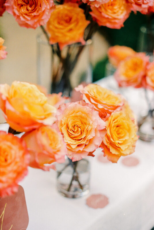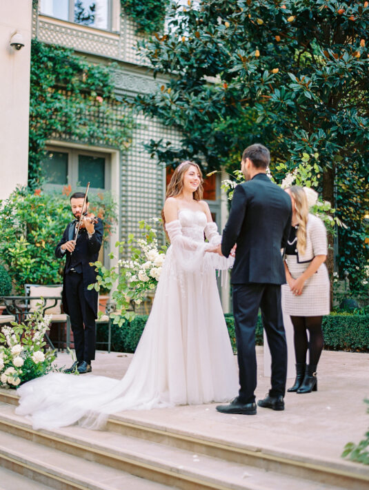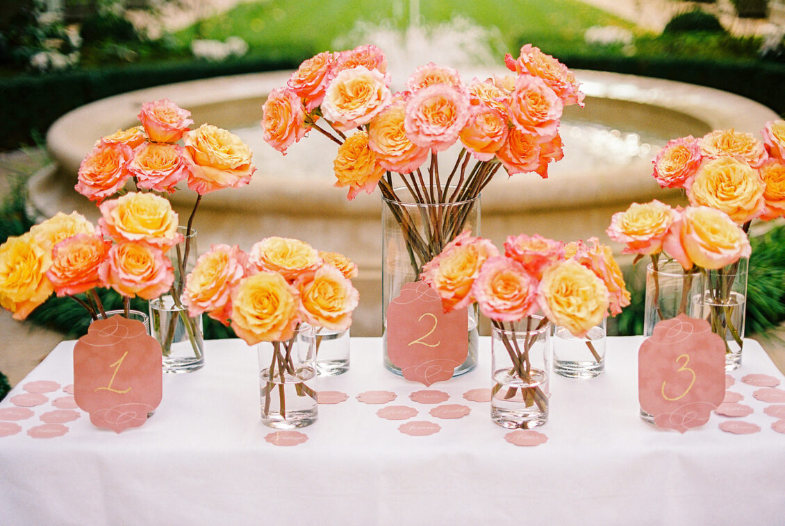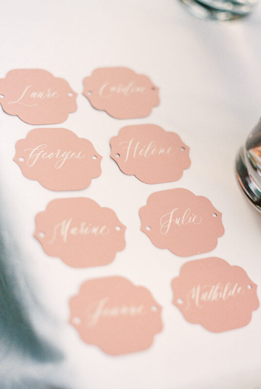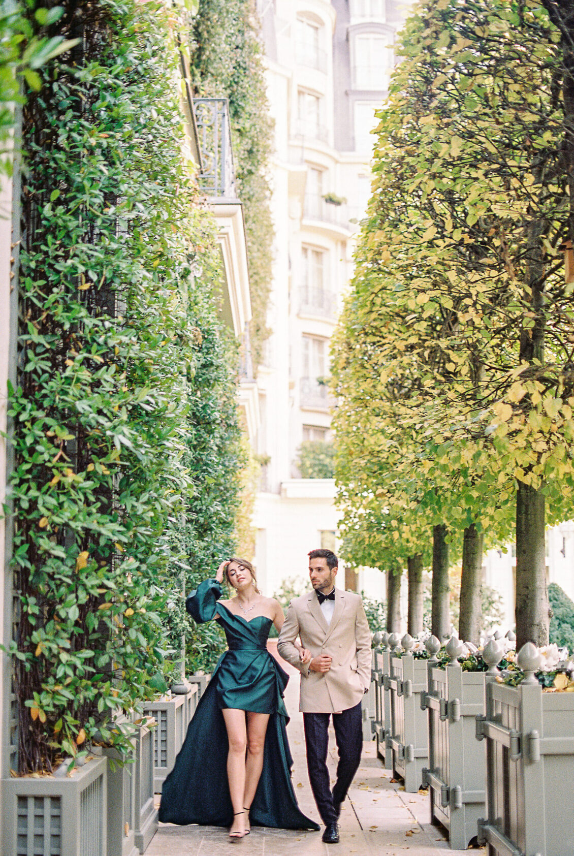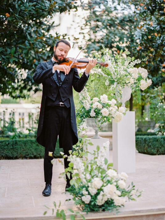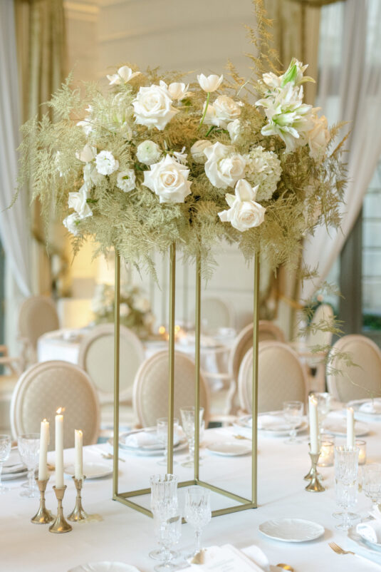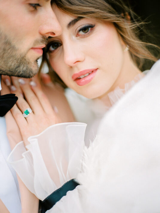As the day transitioned into evening, so did the fashion. The bride changed into a jaw-dropping emerald gown that mirrored her engagement ring, while the groom opted for a peach-salmon dinner jacket—a palette that felt as fresh as it was sophisticated. The reception design was infused with Coco Chanel-inspired touches, from white camellias adorning each table to custom welcome totes filled with Parisian treasures: Chanel No. 5, fresh baguettes, champagne, and sweets from Angelina’s. A ballerina performance and coupe champagne tower completed the scene.