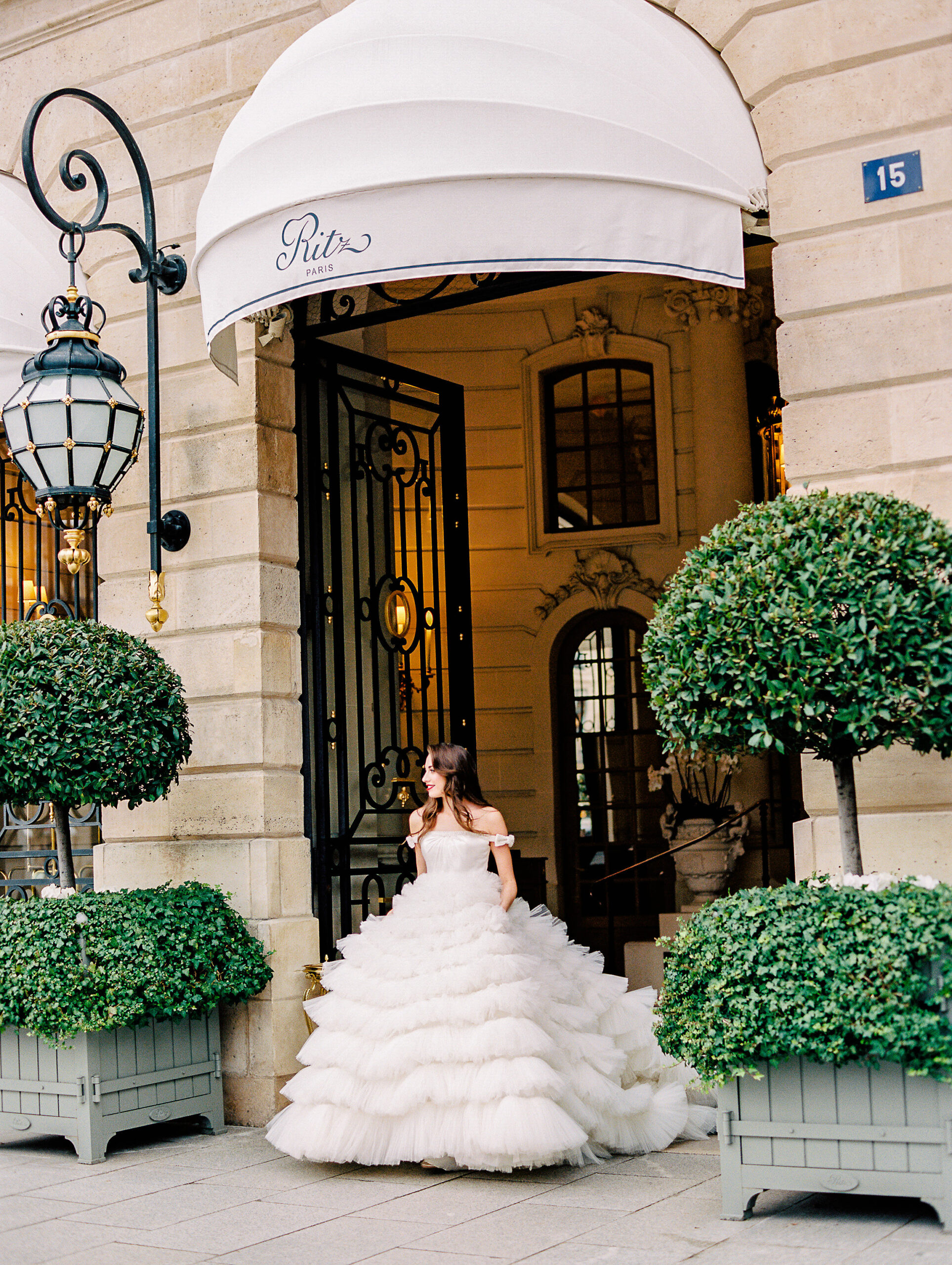 A woman in a voluminous, white, ruffled ball gown stands outside the entrance of The Ritz Paris, framed by manicured topiary trees and ornate wrought-iron doors—a stunning scene from a Paris wedding at The Ritz.