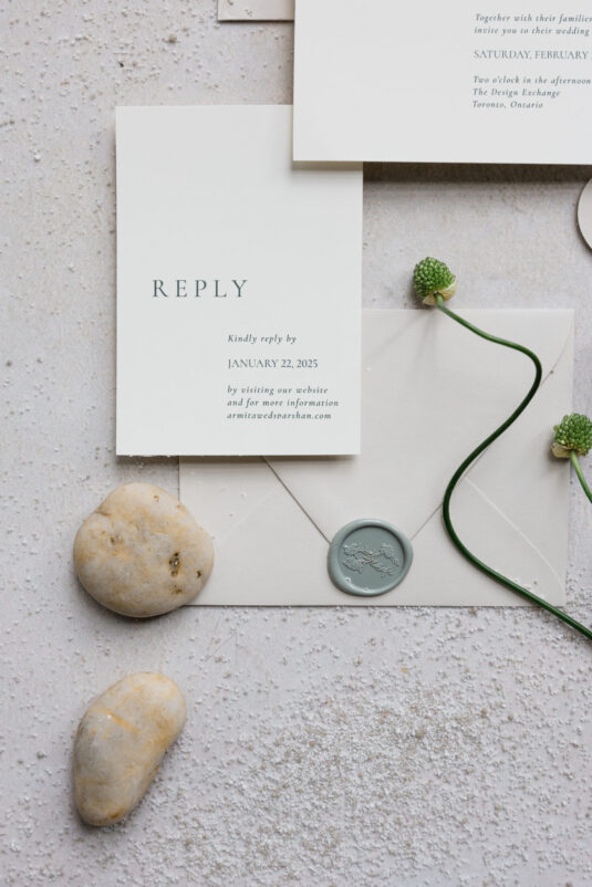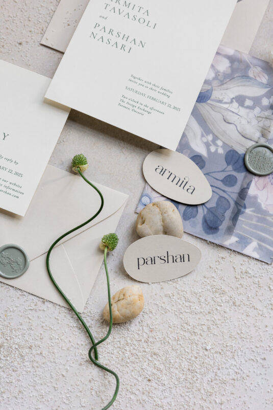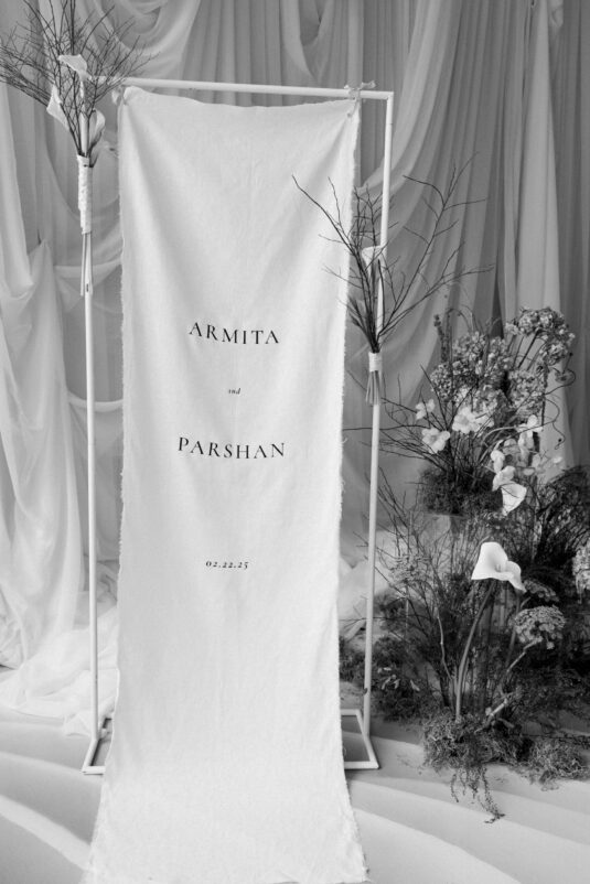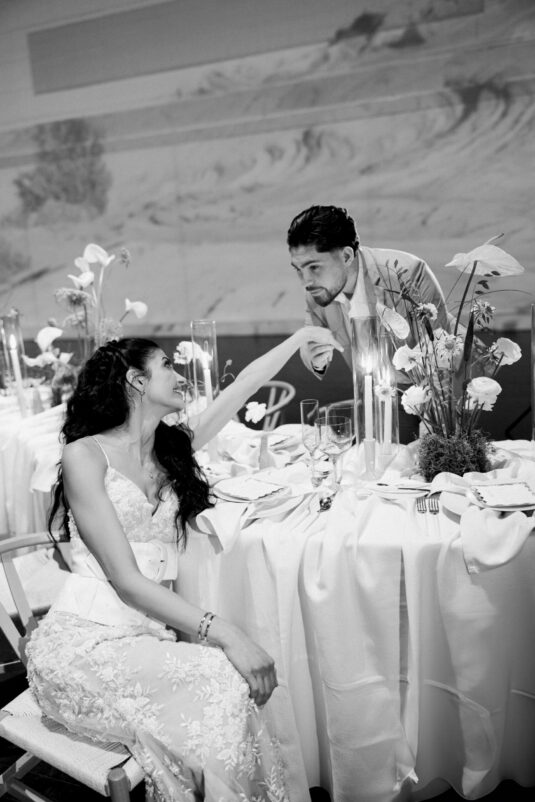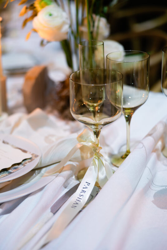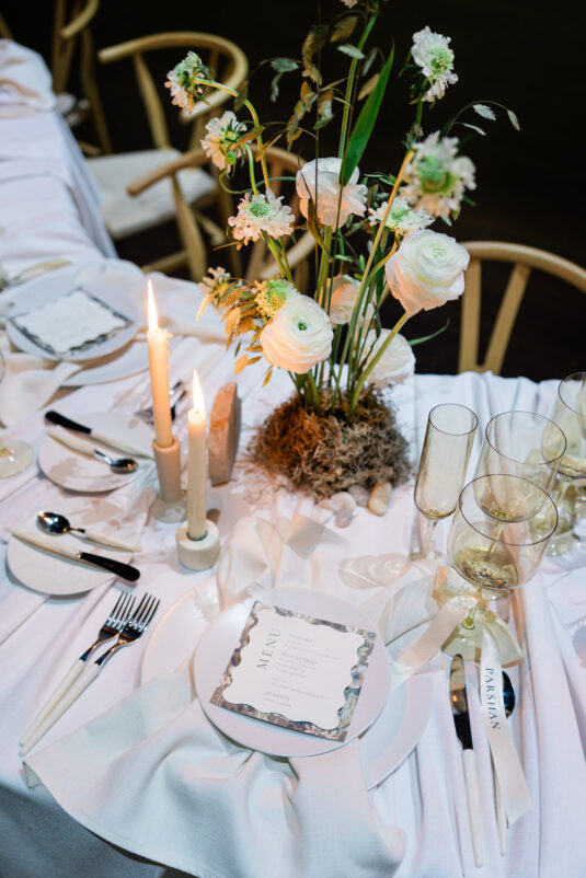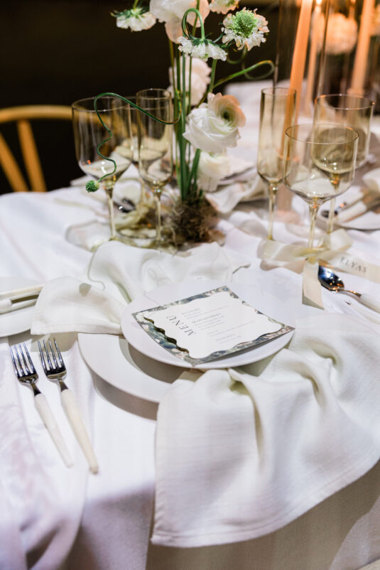 Downstairs, the mood shifted dramatically for the reception. Set in the grand Trading Floor, warm-toned projection mapping bathed the venue in abstract desert imagery, evoking the richness of arid landscapes while maintaining an inviting glow. Stone-inspired textures and richly layered tablescapes were accented with personalized ribbon-tied place cards, adding an intimate, tactile touch.