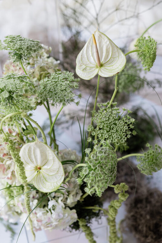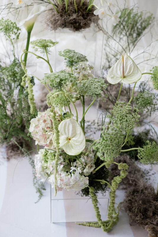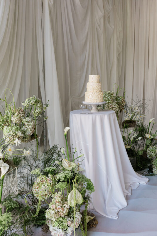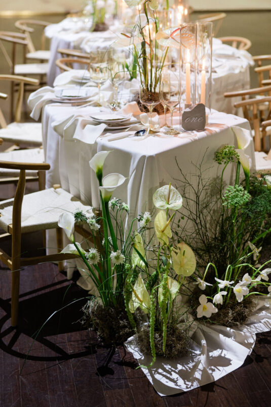 The ceremony, hosted in the luminous Gallery Room, invited guests into a dreamy vignette of soft draping, moss-lined florals, and neutral hues. A custom vinyl aisle runner guided the eye toward a natural installation that looked as though it had grown organically from the floor itself. As the light poured in, the space felt weightless—an intentional nod to the editorial’s grounding theme.
