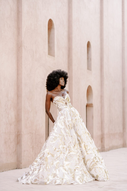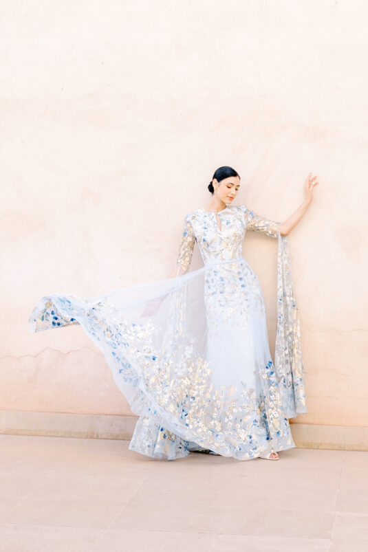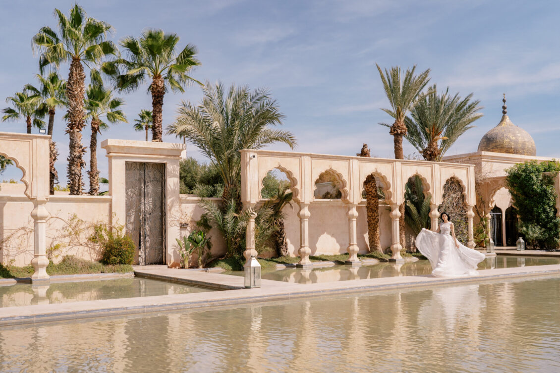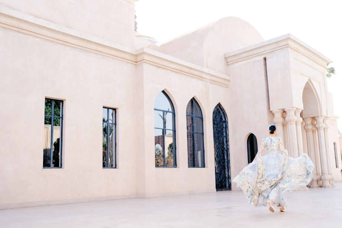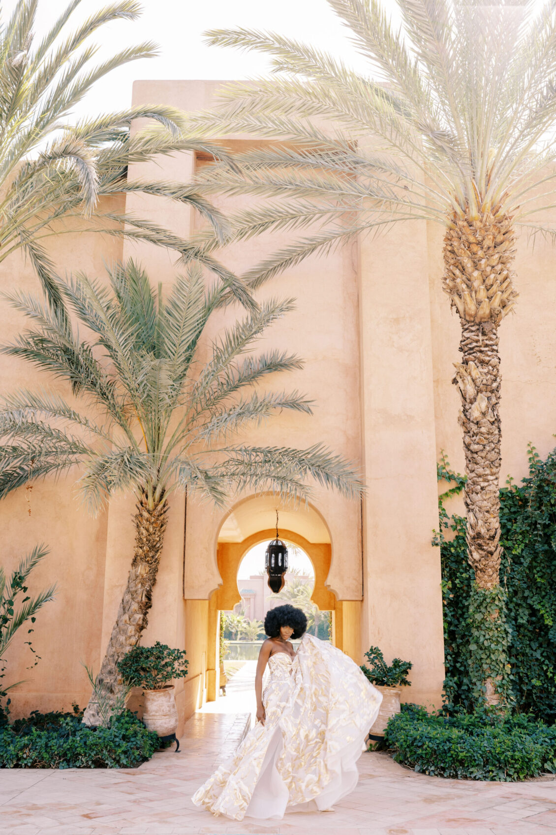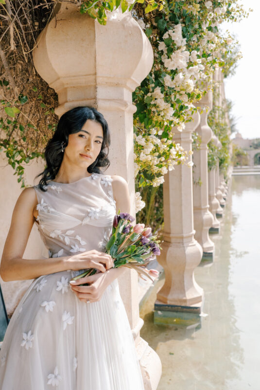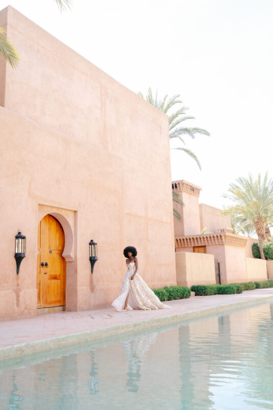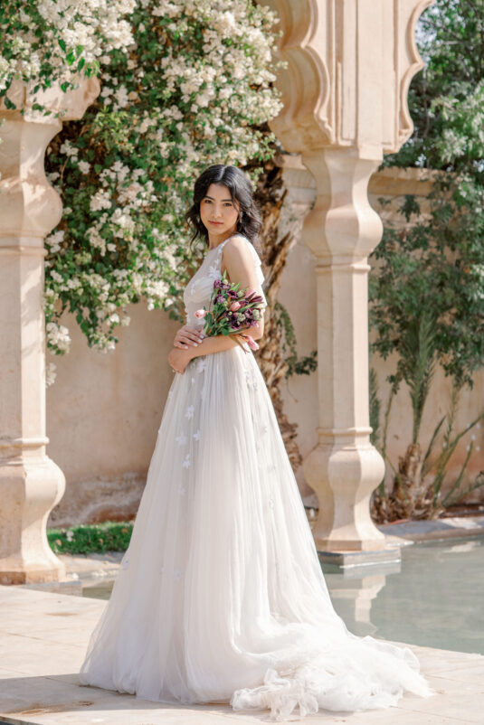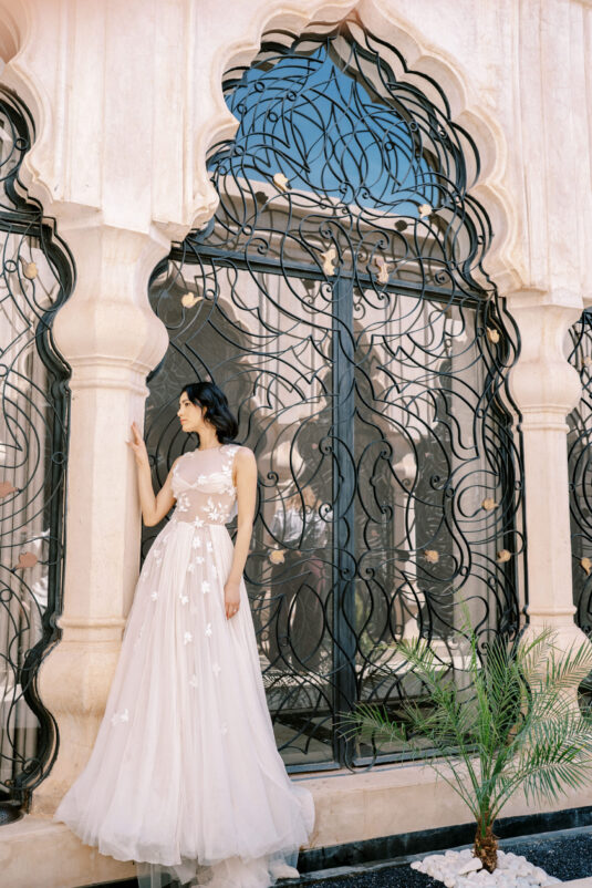Each of the three styled shoots, photographed by Amy Mulder, explores a different visual language—uniting editorial fashion with cultural context in a way that speaks to today’s luxury-minded bride and groom. From lush palace settings to sunlit courtyards and the golden glow of the Agafay Desert, every scene tells its own captivating story.