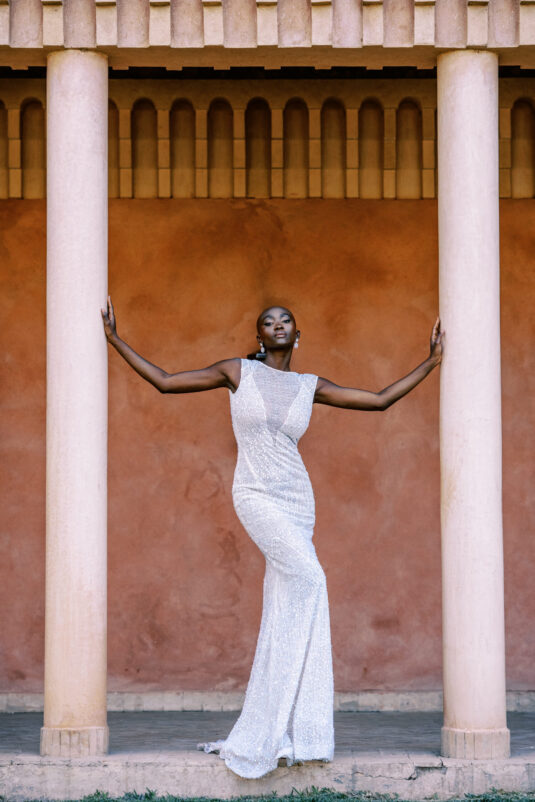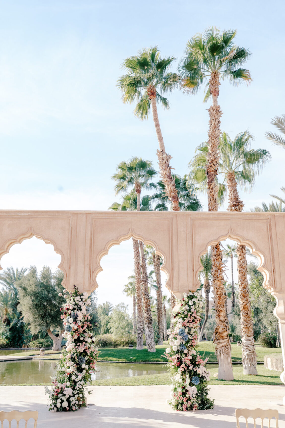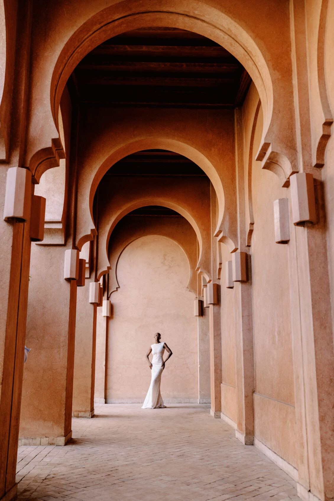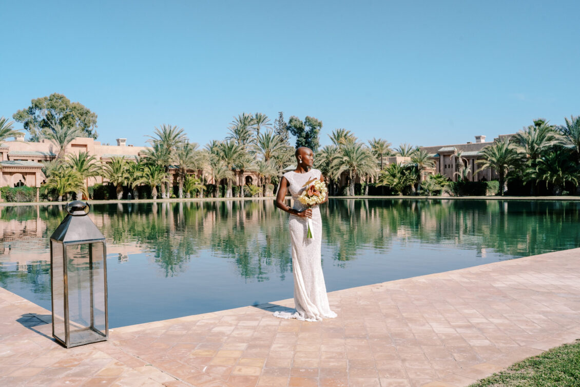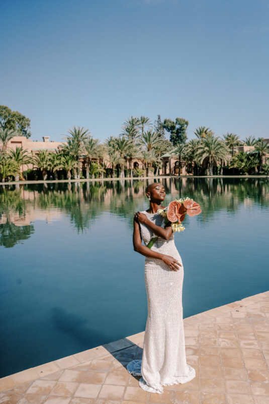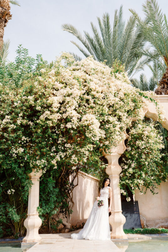 Nestled just outside Marrakech, Palais Namaskar was the picture of serene luxury. Its grand archways and mirrored pools offered the perfect backdrop for an intimate-yet-opulent wedding setting. Here, Amy Mulder captured a ceremony scene that celebrated destination wedding elegance with exquisite attention to detail. A couture wedding gown with intricate patterning echoed the architectural motifs, while a sculptural floral arch brought softness and romance to the moment. Even the cake display was a work of art—mirroring the ceremony florals to create a seamless design narrative. This editorial effortlessly blended Moroccan heritage with elevated bridal style, making it ideal inspiration for a destination wedding steeped in grandeur.