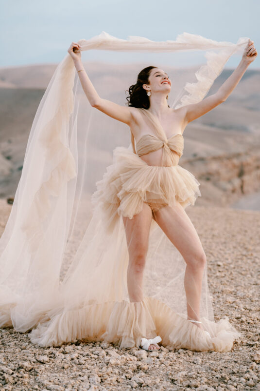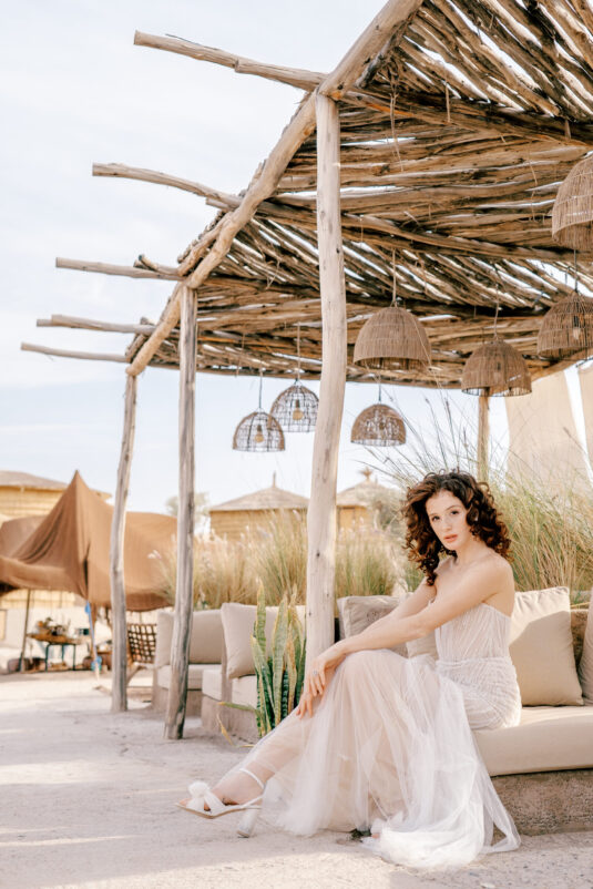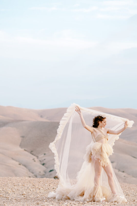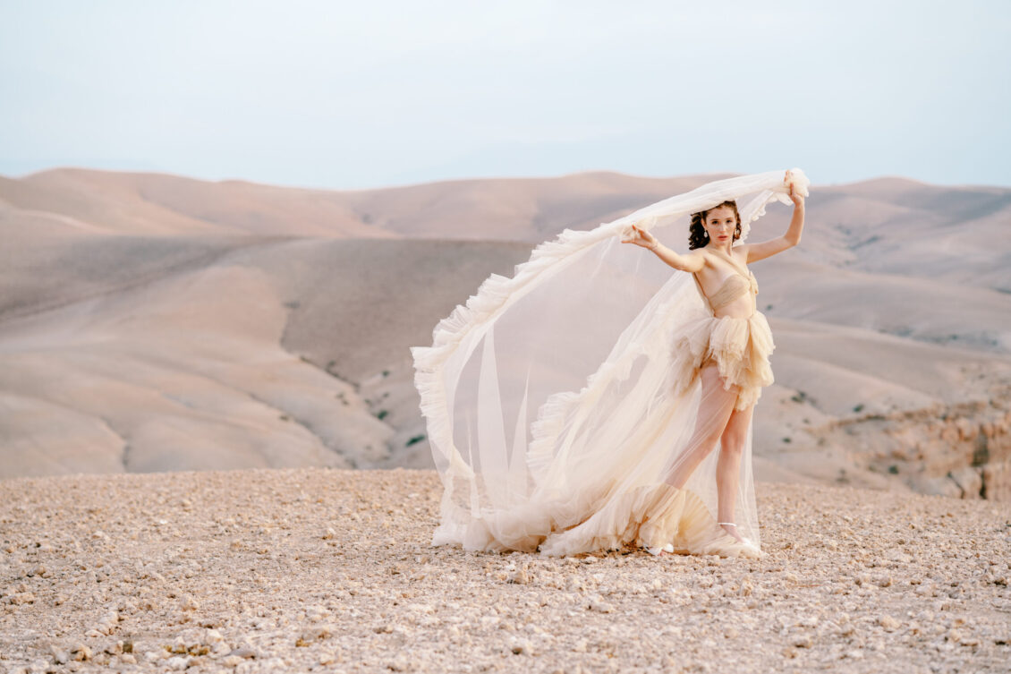 The final shoot took place in the breathtaking Agafay Desert, where the celebration of Moroccan tradition came to life in full technicolor. Against a minimalist desert backdrop of sand and sky, this destination wedding editorial highlighted the beauty of cultural ceremony. The bride dazzled in gold, the couple was lifted in jubilation, and musicians wove through the crowd with drums and melody. Every frame radiated joy, especially as the sun set and cast a golden haze across the mountaintop reception. With laughter in the air and music in every moment, this shoot showcased the power of immersive celebration—one where cultural roots meet editorial brilliance. It was a reminder that the best destination weddings don’t just take place in beautiful locations—they live within the energy of the people, the place, and the moment.