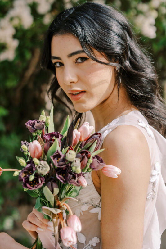 The terracotta tones and palm-filled courtyards of Amanjena provided a rich canvas for a destination wedding shoot that felt both grounded and ethereal. Here, modern luxury met earthy elegance. Reception tables were dressed with natural elements—think stone fruit, almonds, figs, and woven textures—while towering floral installations brought movement and life to the design. The bride wore a long-sleeved gown adorned in delicate embroidery, her cathedral-length veil billowing in the Moroccan breeze. The ceremony space embraced texture and asymmetry, with layered blooms creating a soft, organic altar. As golden hour approached, sunlight danced across the architecture, transforming the space into a dreamlike scene captured perfectly by Amy Mulder’s lens.