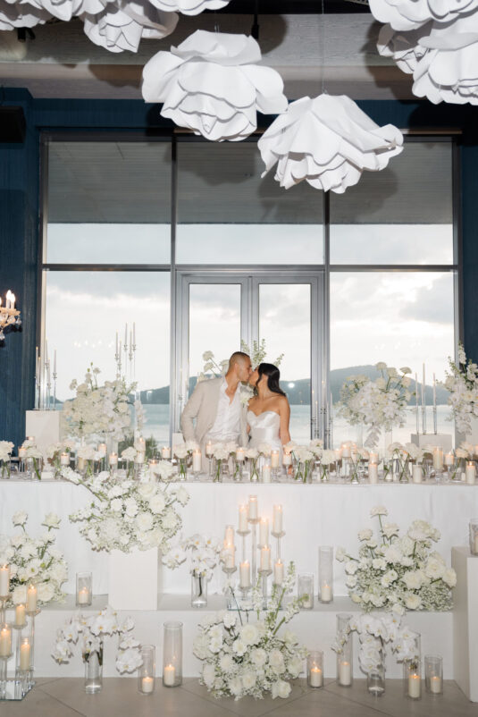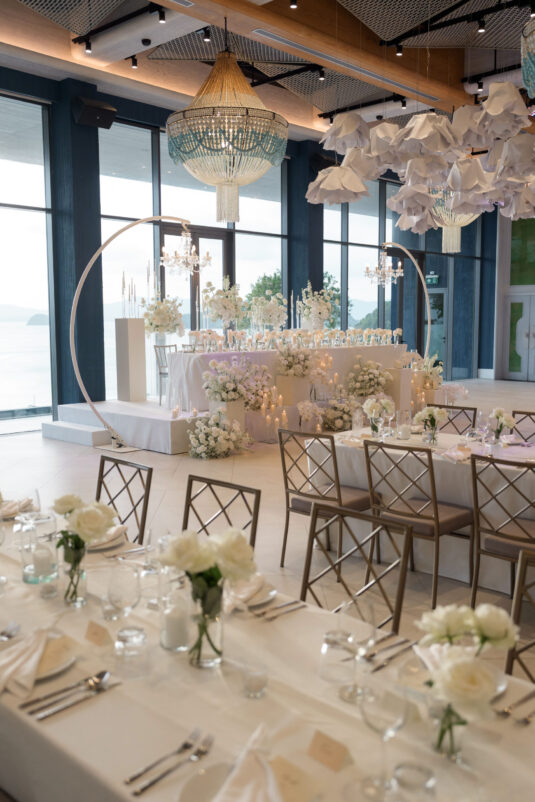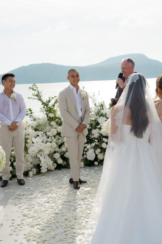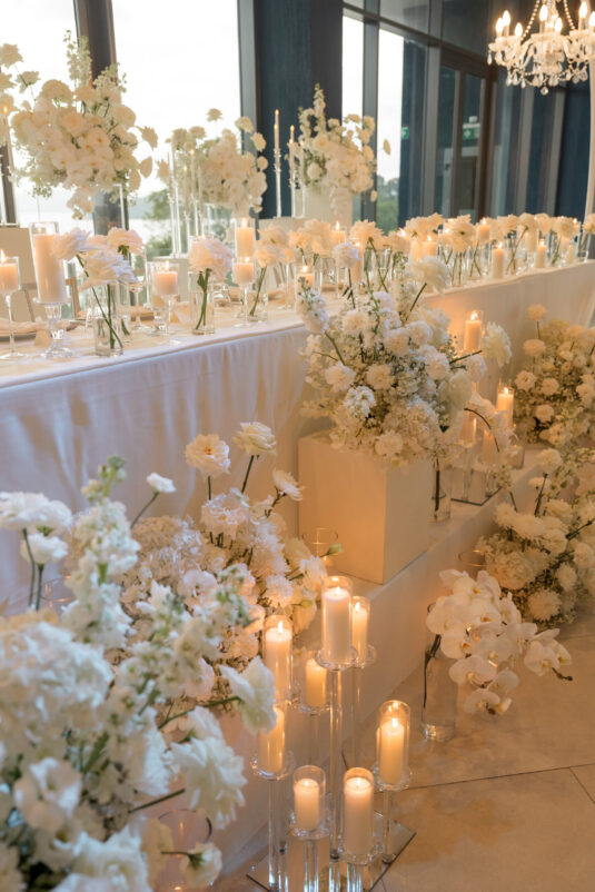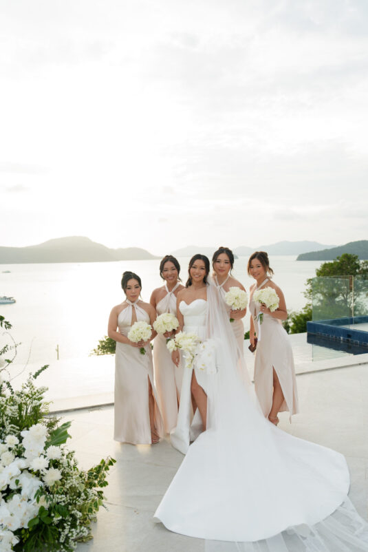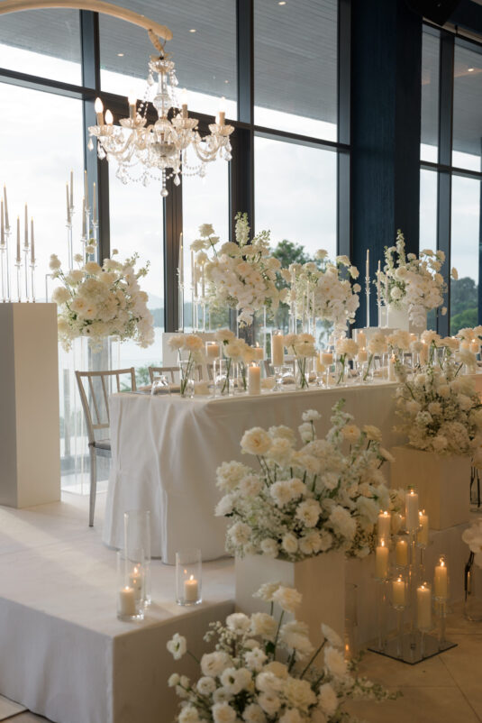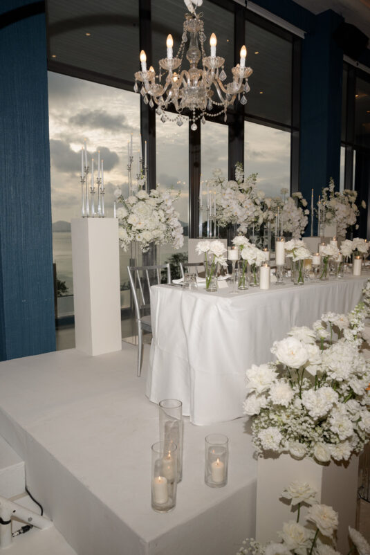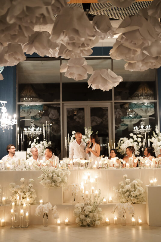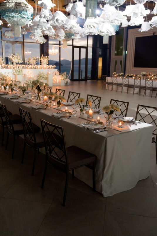 One of the standout moments of the evening was the bridal party’s head table, which served as both focal point and fairytale. Cascading chandeliers floated above arrangements of lush white florals, while soft candlelight added an intimate glow that echoed the warmth of the celebration. From start to finish, this luxury destination wedding in Phuket was designed with intentionality, beauty, and a deep sense of place—proof that modern minimalism can still feel utterly magical when in the right hands.