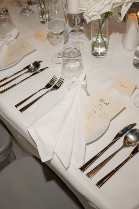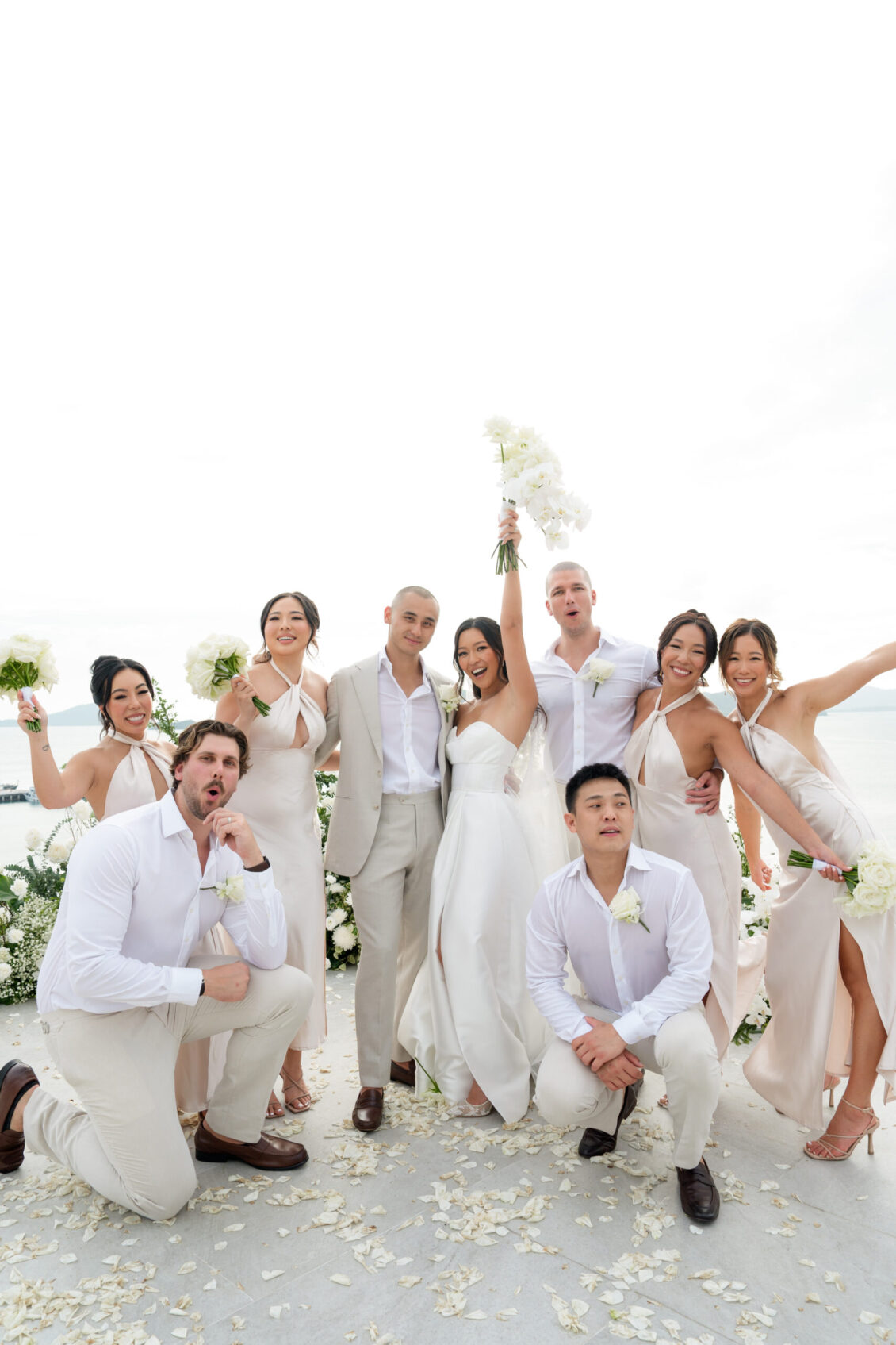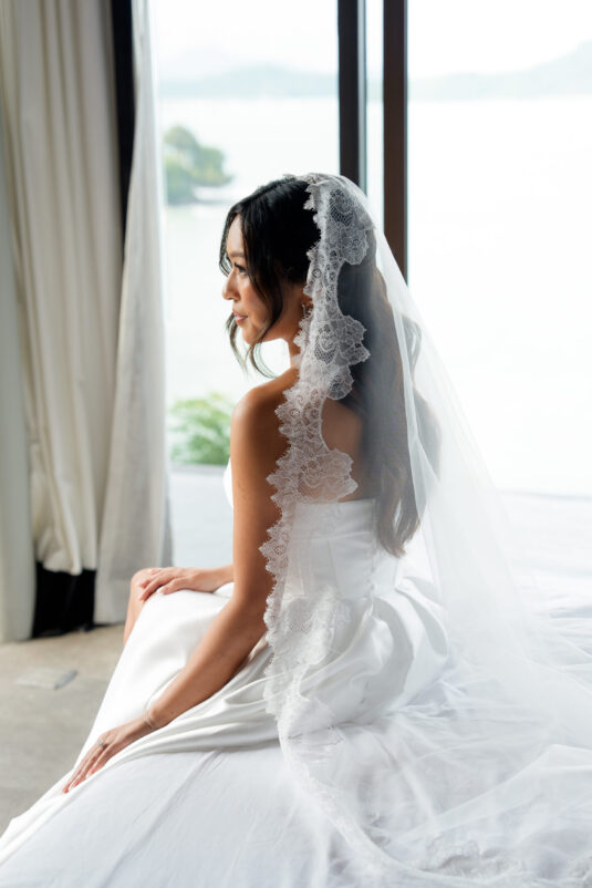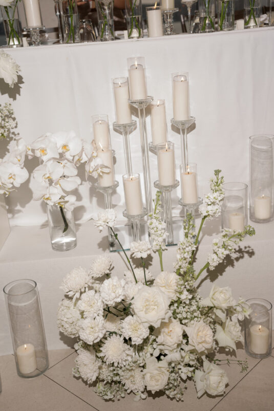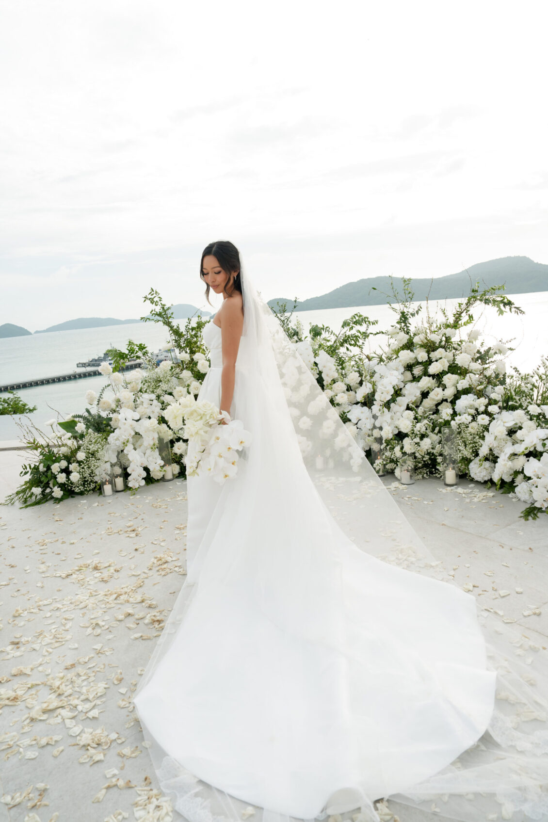 One of the standout moments of the evening was the bridal party’s head table, which served as both focal point and fairytale. Cascading chandeliers floated above arrangements of lush white florals, while soft candlelight added an intimate glow that echoed the warmth of the celebration. From start to finish, this luxury destination wedding in Phuket was designed with intentionality, beauty, and a deep sense of place—proof that modern minimalism can still feel utterly magical when in the right hands.