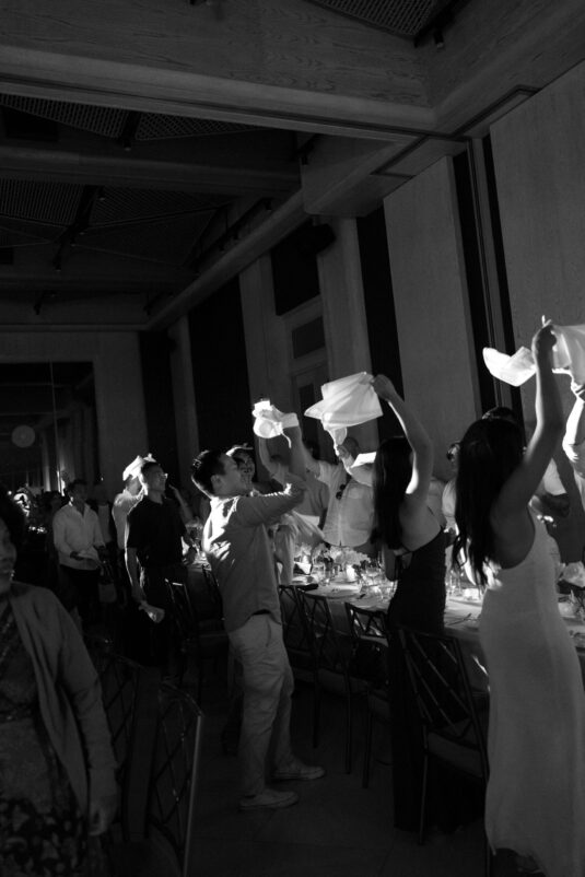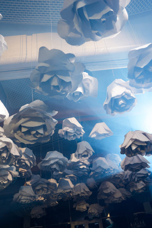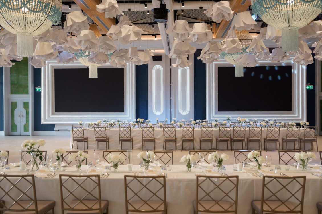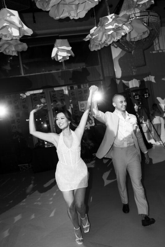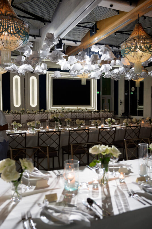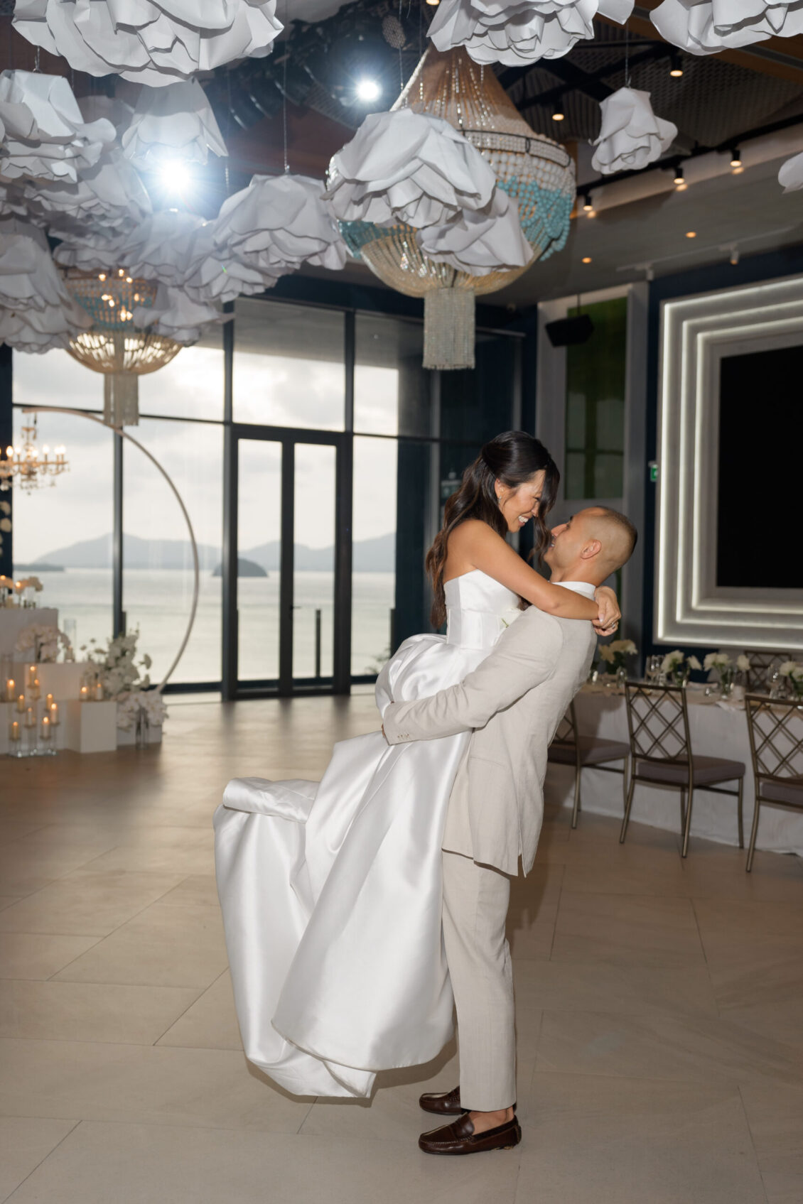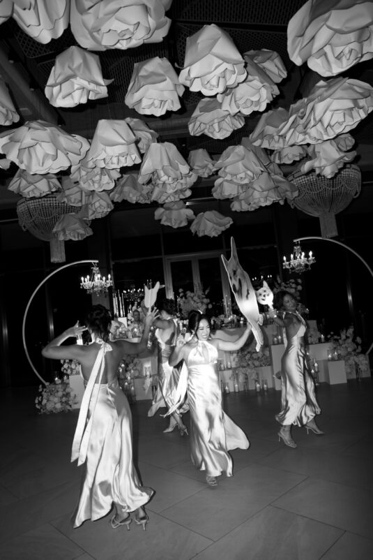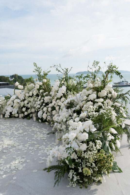 From the very first moment, the luxury destination wedding in Phuket impressed with its curated aesthetic. White florals framed the ceremony space with organic ease, adding a softness to the sleek lines of the architecture. As the sun dipped below the horizon, the scene transitioned seamlessly from serene to striking. Suspended above the dance floor was a dramatic, oversized paper installation—a bold artistic gesture that set the tone for the evening’s revelry. The juxtaposition of this sculptural centerpiece with delicate white blooms created a sense of balance: bold yet romantic, architectural yet ethereal.