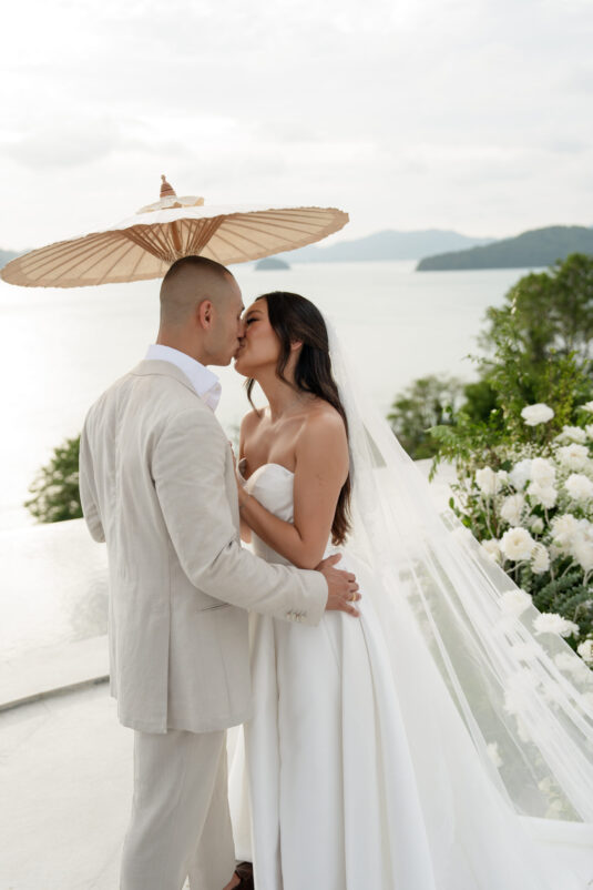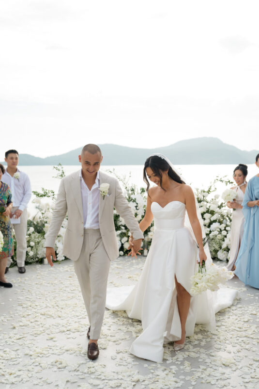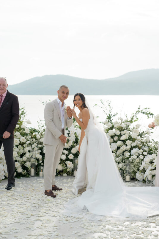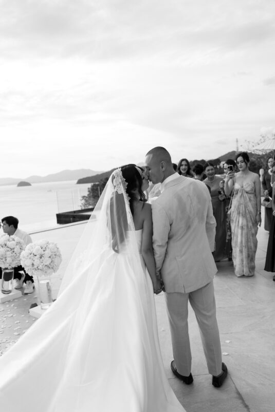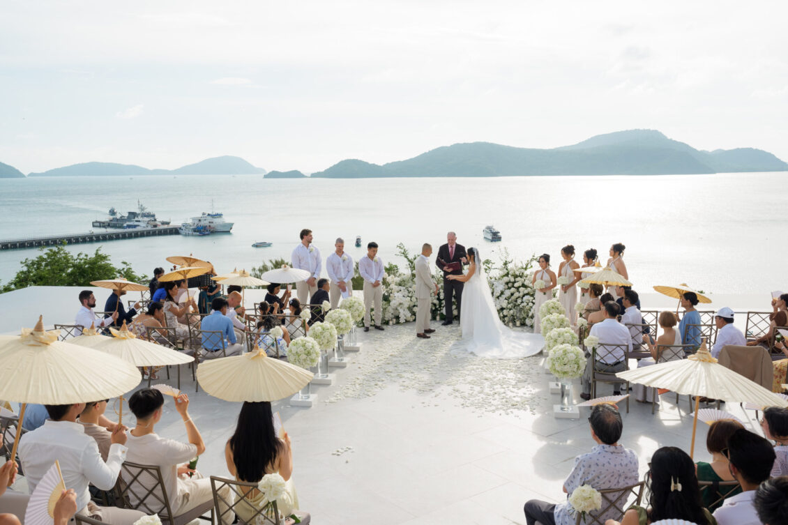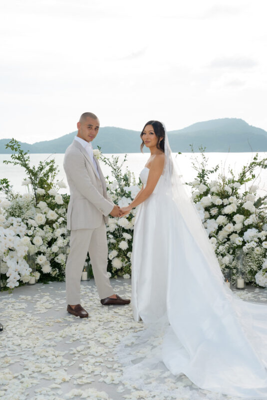 . Set against the breathtaking backdrop of a golden Phuket sunset, the couple exchanged vows at the iconic TU Bar under a minimalist arch that radiated contemporary elegance. This design-forward celebration was the perfect balance of form and feeling, where art met intimacy in one of Thailand’s most exclusive wedding destinations.