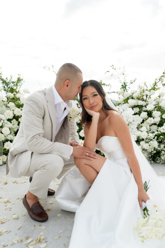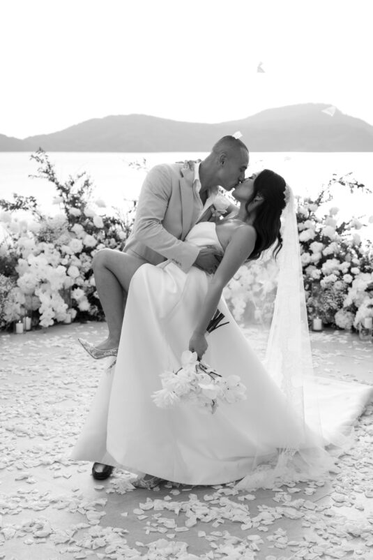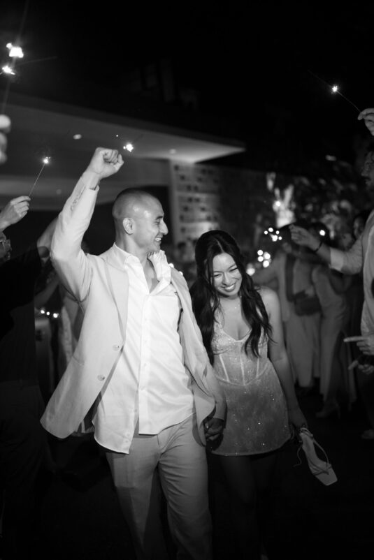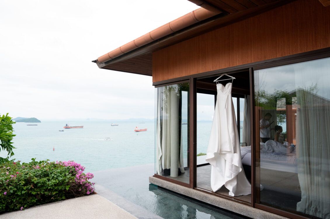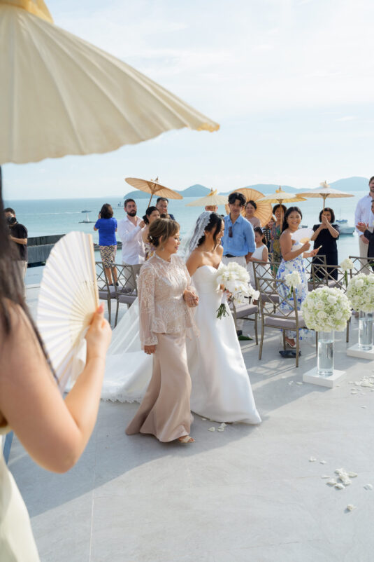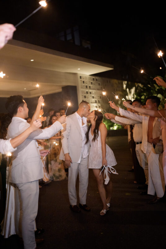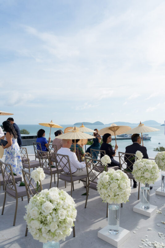 . Set against the breathtaking backdrop of a golden Phuket sunset, the couple exchanged vows at the iconic TU Bar under a minimalist arch that radiated contemporary elegance. This design-forward celebration was the perfect balance of form and feeling, where art met intimacy in one of Thailand’s most exclusive wedding destinations.