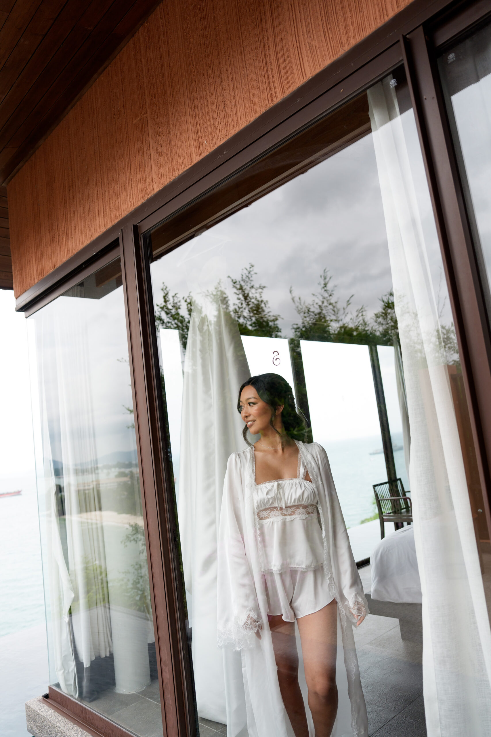 A woman in light, elegant sleepwear stands next to a large window, gazing outside. Behind her is a serene bedroom with white bedding and sheer curtains—outside, the cloudy skies hint at a picturesque destination wedding in Phuket.