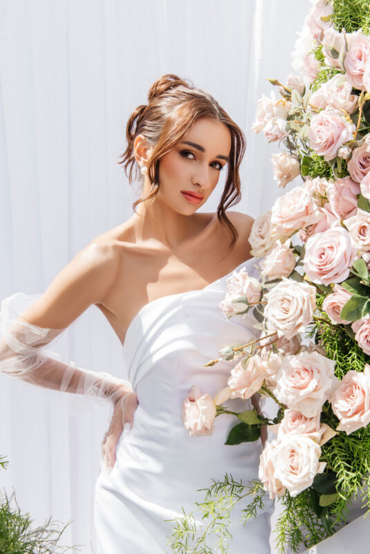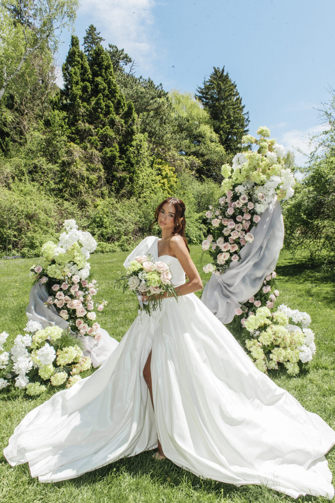 Surrounded by a floral installation that evokes the feel of a secret garden in full bloom, the bride appears as if caught in a dream. With styling by