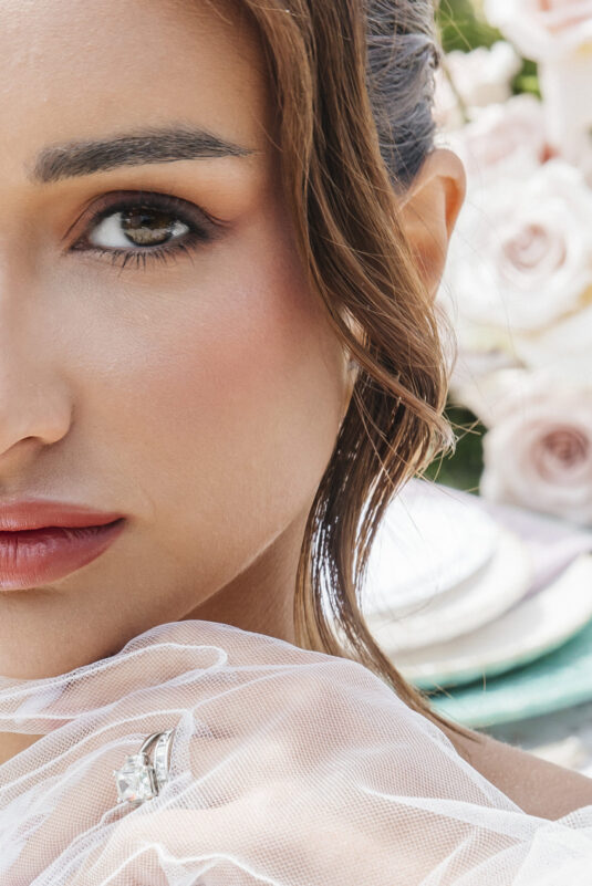 complement the overall aesthetic with glowing skin, soft texture, and romantic detailing. Shot through the graceful lens of