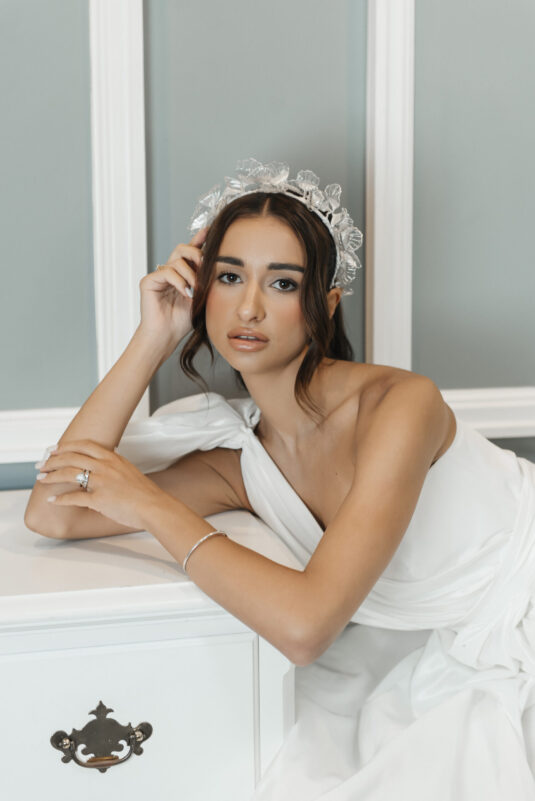 , features soft white organza gowns paired with accessories that echo the effortless elegance of the setting. Hair and makeup by