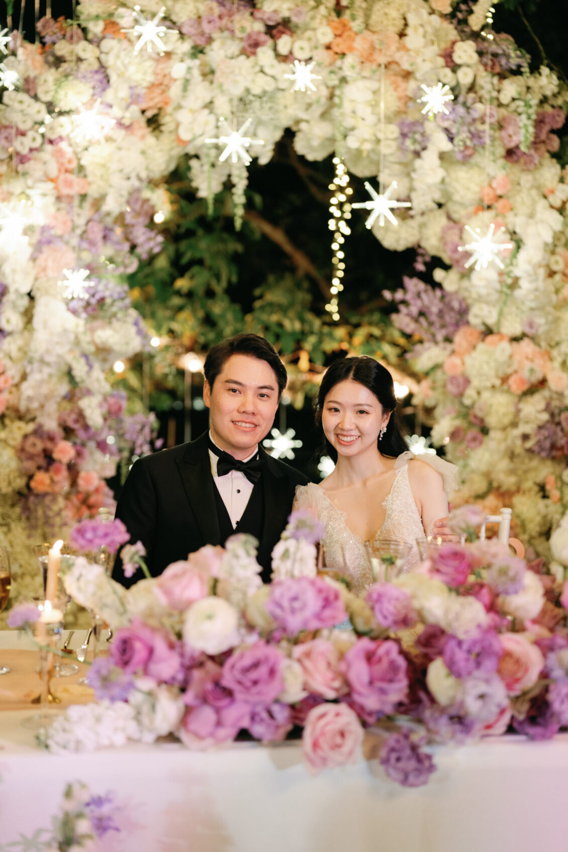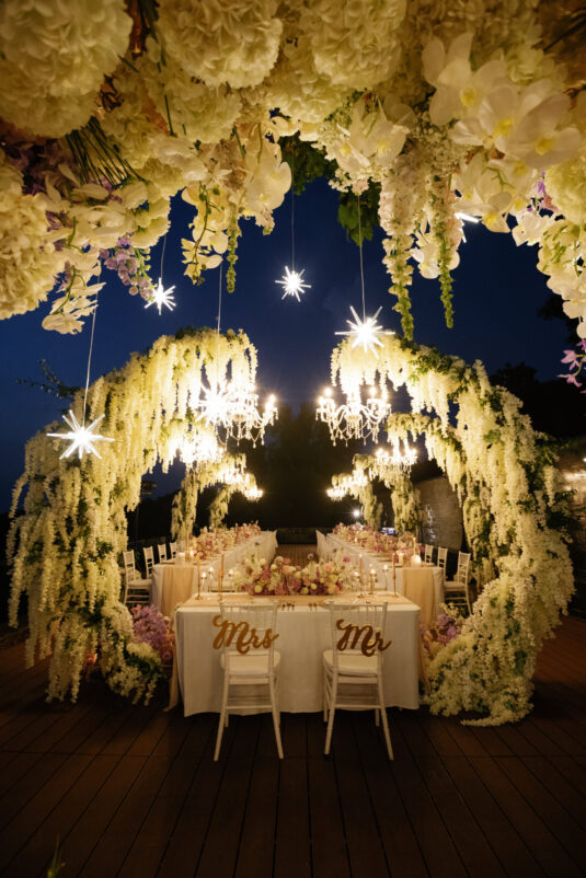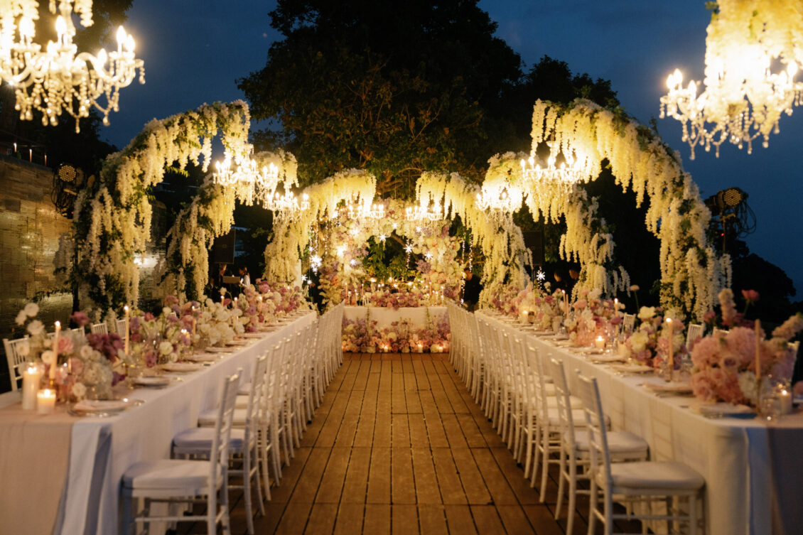 . Beneath a canopy of cascading blooms and sparkling chandeliers, guests dined at long tables filled with soft florals, flickering candles, and laughter that echoed through the night. The sweetheart table, framed by yet another enchanting floral arch, was the perfect setting for heartfelt toasts and unforgettable speeches.