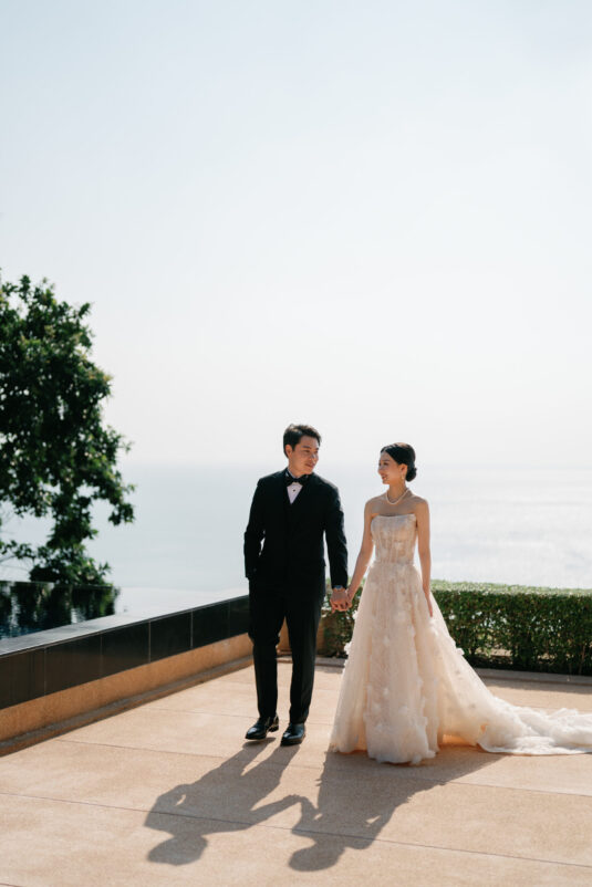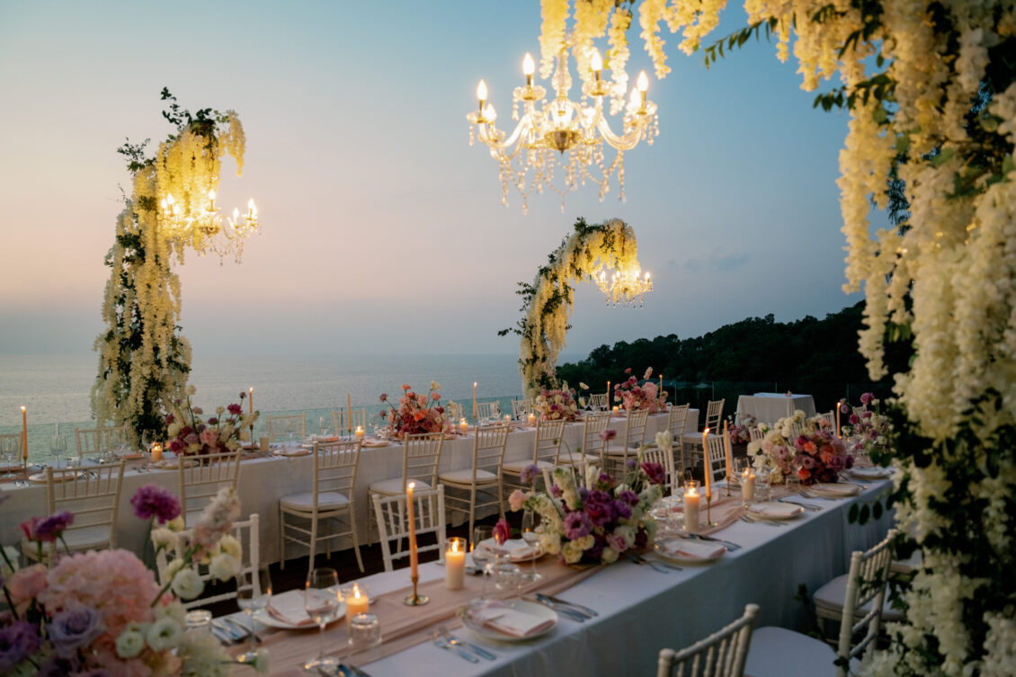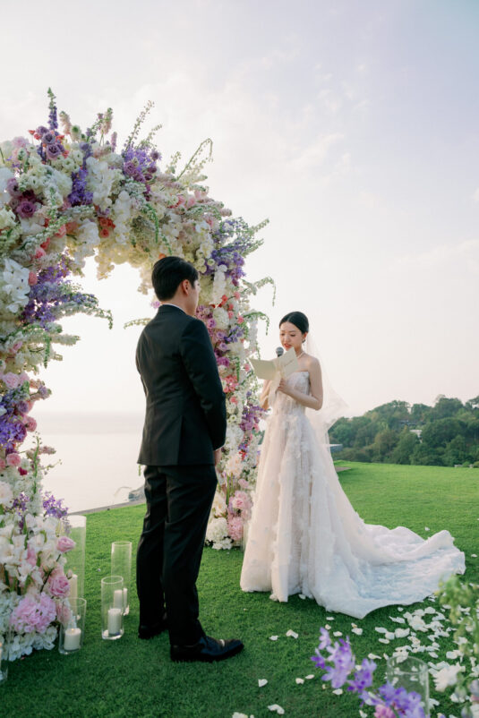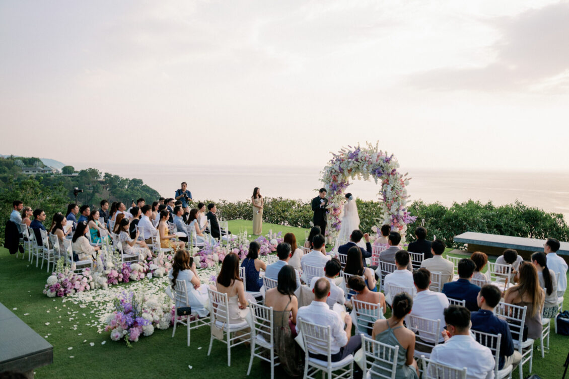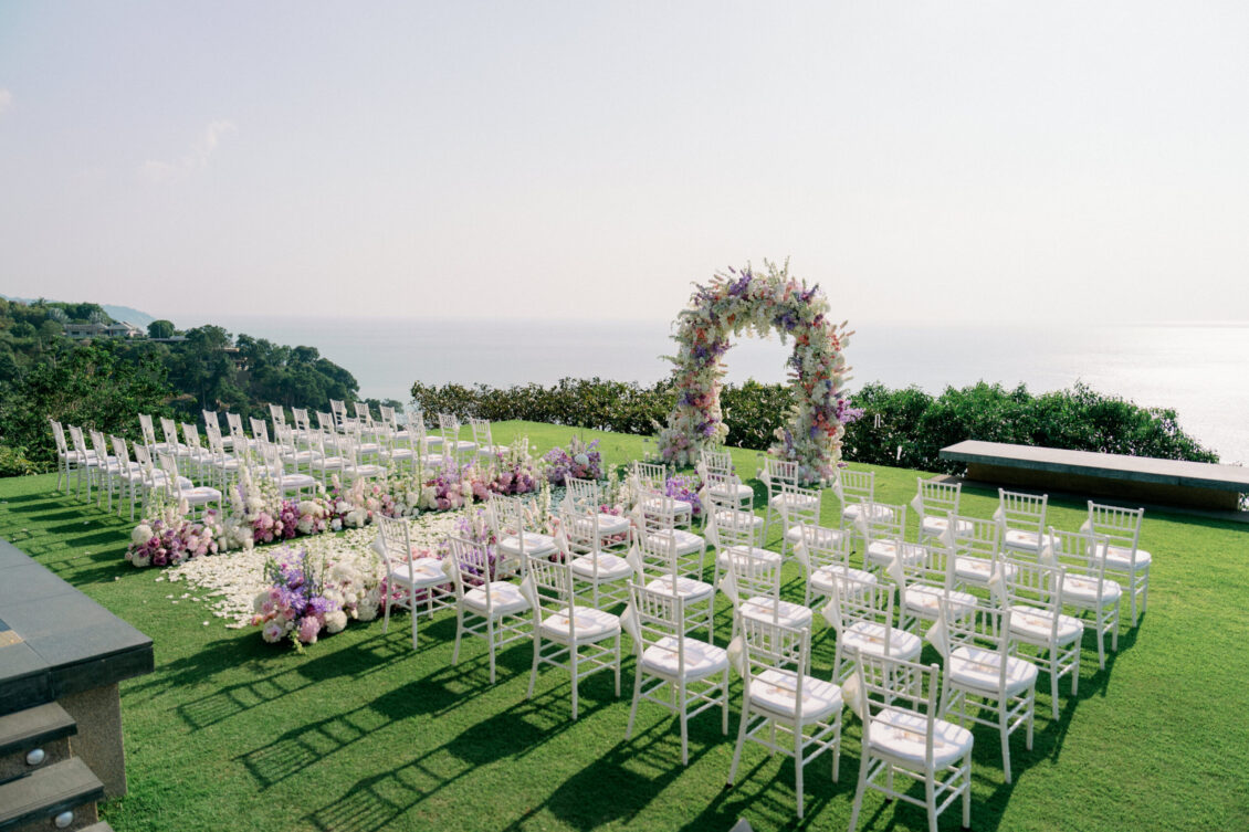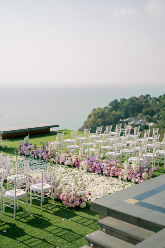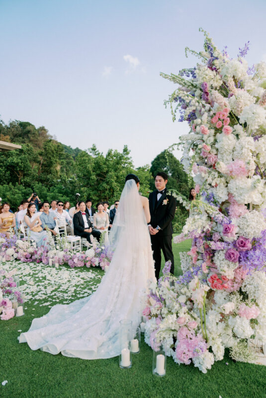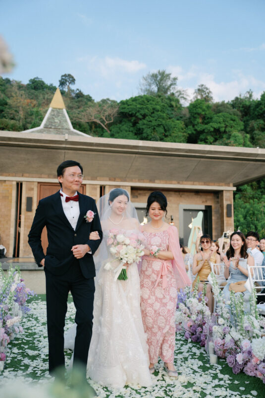 Cheryle and Johnnie’s destination wedding at Paresa Resort Phuket was the epitome of effortless elegance in Phuket. Surrounded by panoramic ocean views and kissed by a soft sea breeze, their seaside ceremony felt like a scene from a cinematic love story. Set against the turquoise horizon, the couple exchanged vows beneath a pastel-hued floral arch, where roses and orchids bloomed in delicate shades of pink, lilac, and ivory. The aisle, blanketed with white rose petals and flanked by lush floral clusters, struck a beautiful balance between luxurious and understated—proof that effortless elegance in Phuket comes down to thoughtful details and impeccable styling.