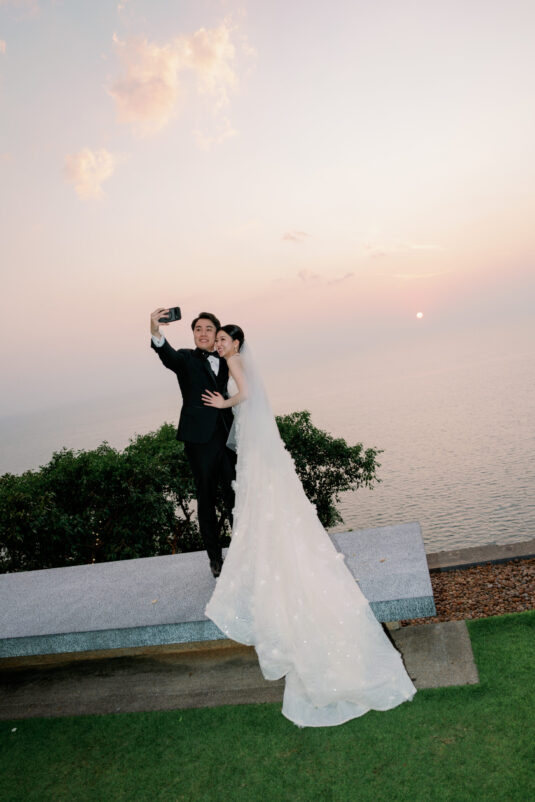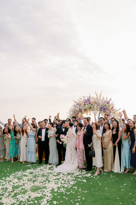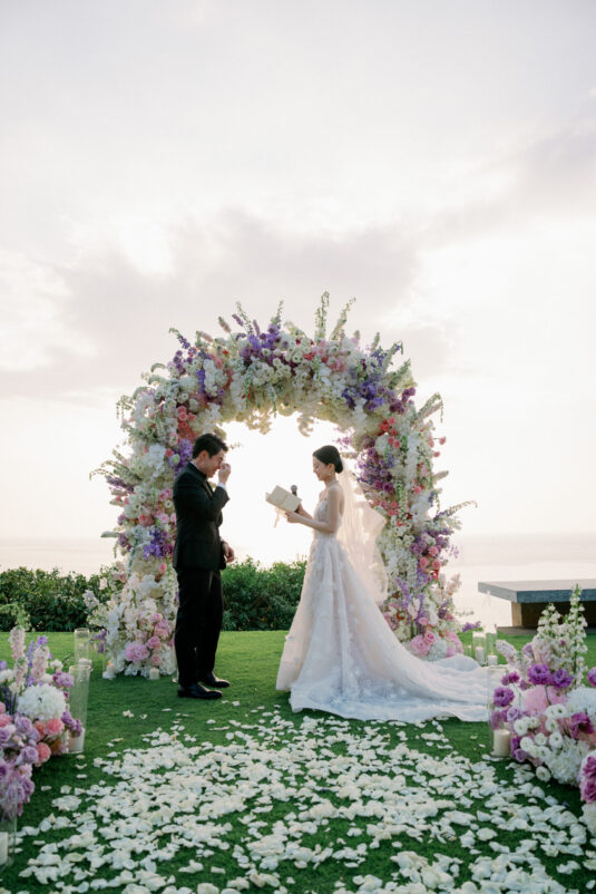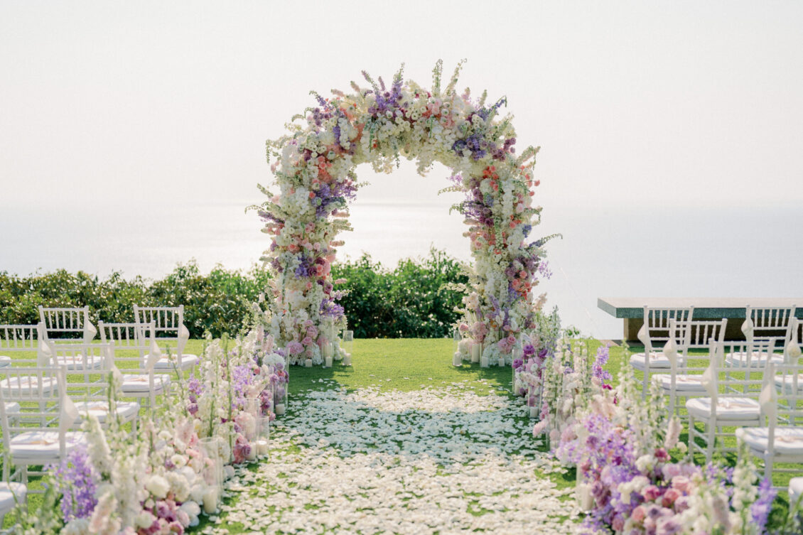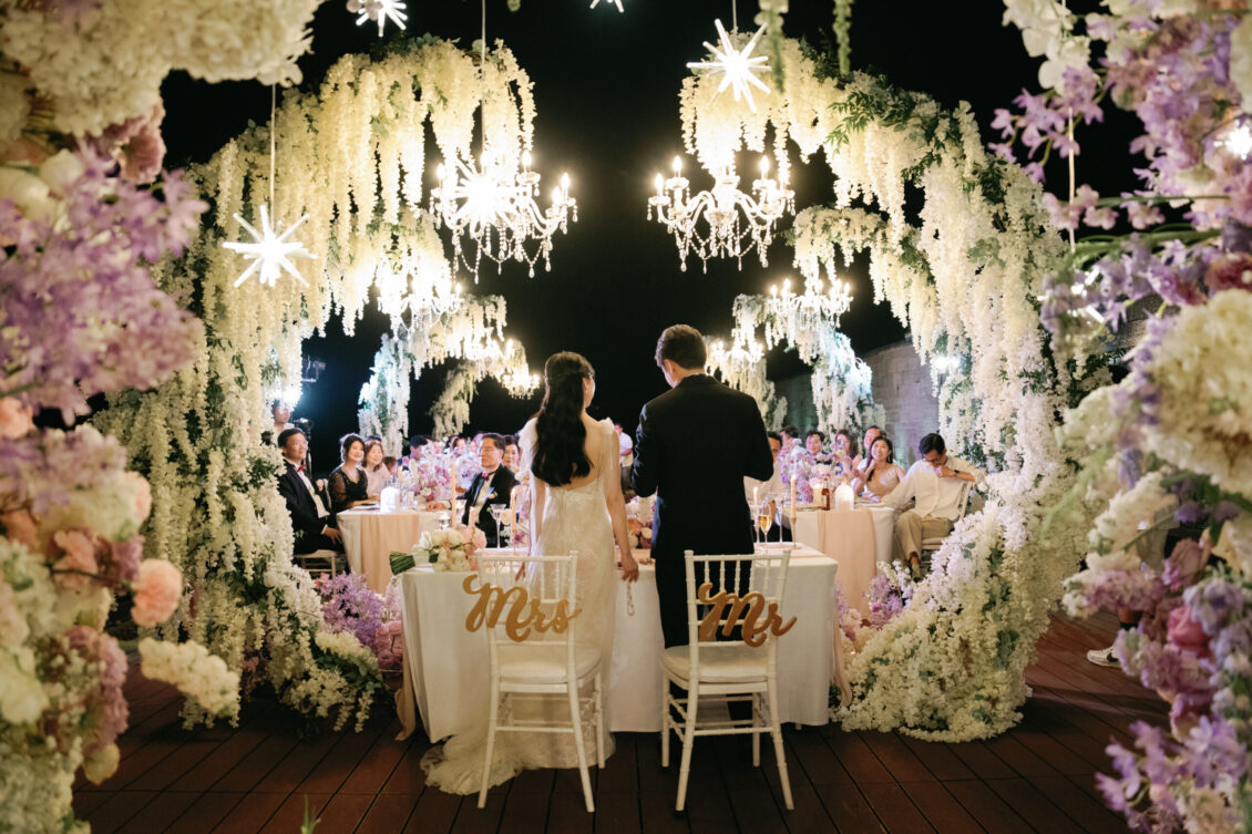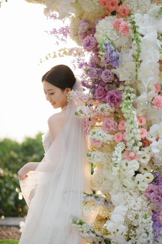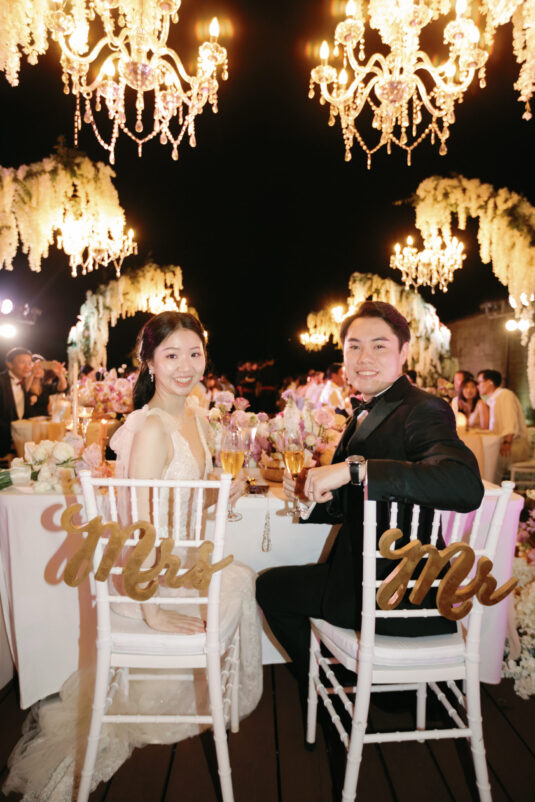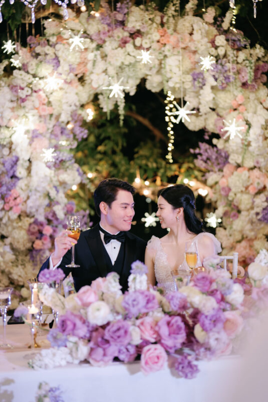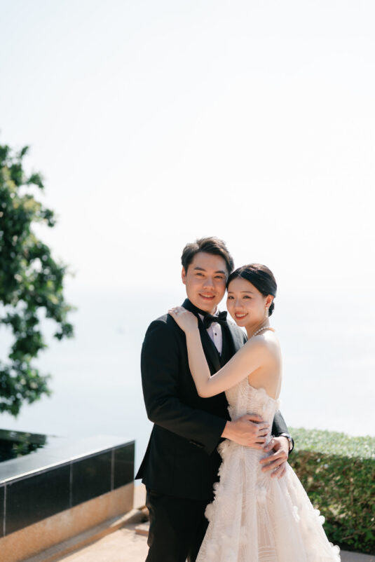 Cheryle and Johnnie’s destination wedding at Paresa Resort Phuket was the epitome of effortless elegance in Phuket. Surrounded by panoramic ocean views and kissed by a soft sea breeze, their seaside ceremony felt like a scene from a cinematic love story. Set against the turquoise horizon, the couple exchanged vows beneath a pastel-hued floral arch, where roses and orchids bloomed in delicate shades of pink, lilac, and ivory. The aisle, blanketed with white rose petals and flanked by lush floral clusters, struck a beautiful balance between luxurious and understated—proof that effortless elegance in Phuket comes down to thoughtful details and impeccable styling.