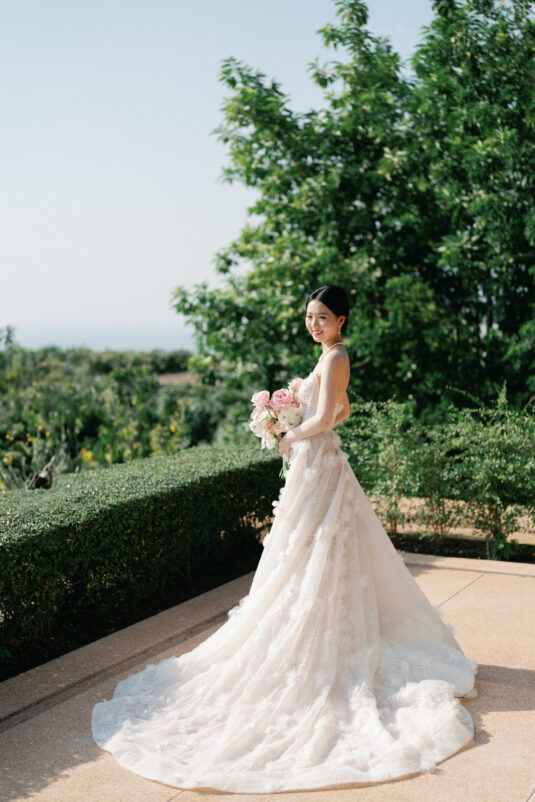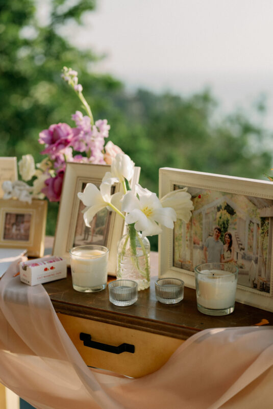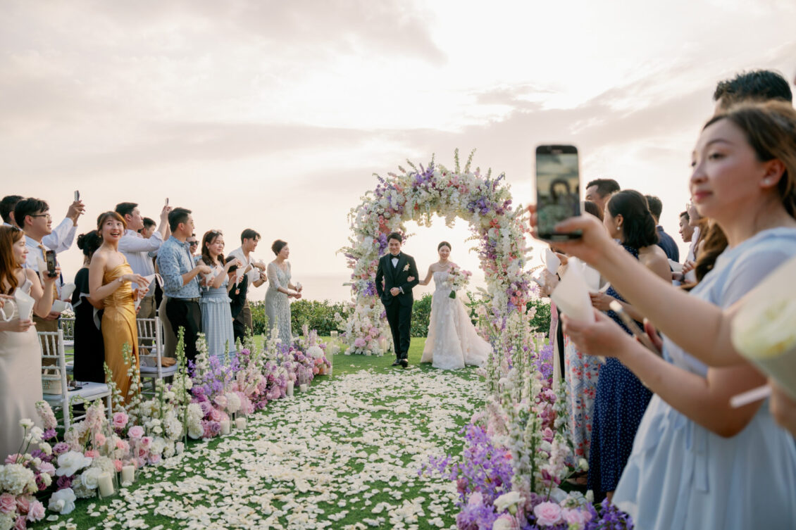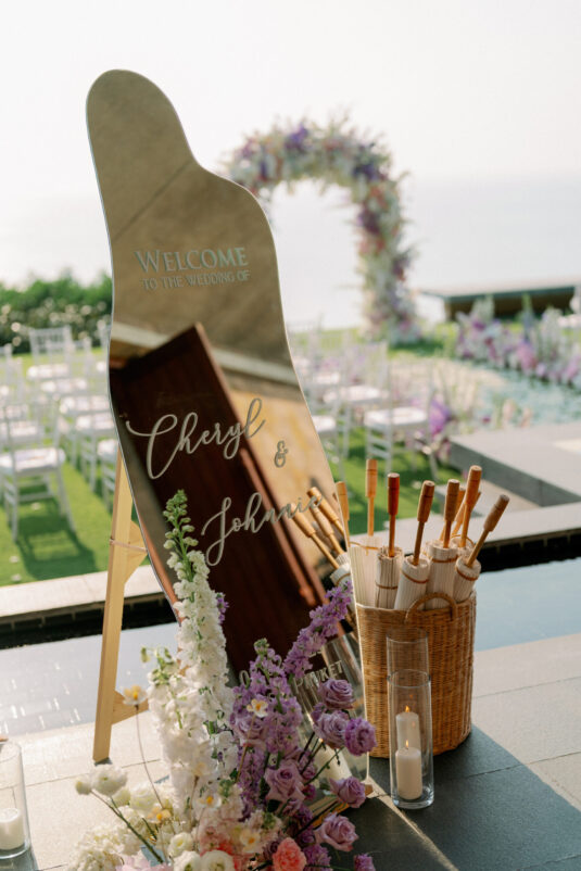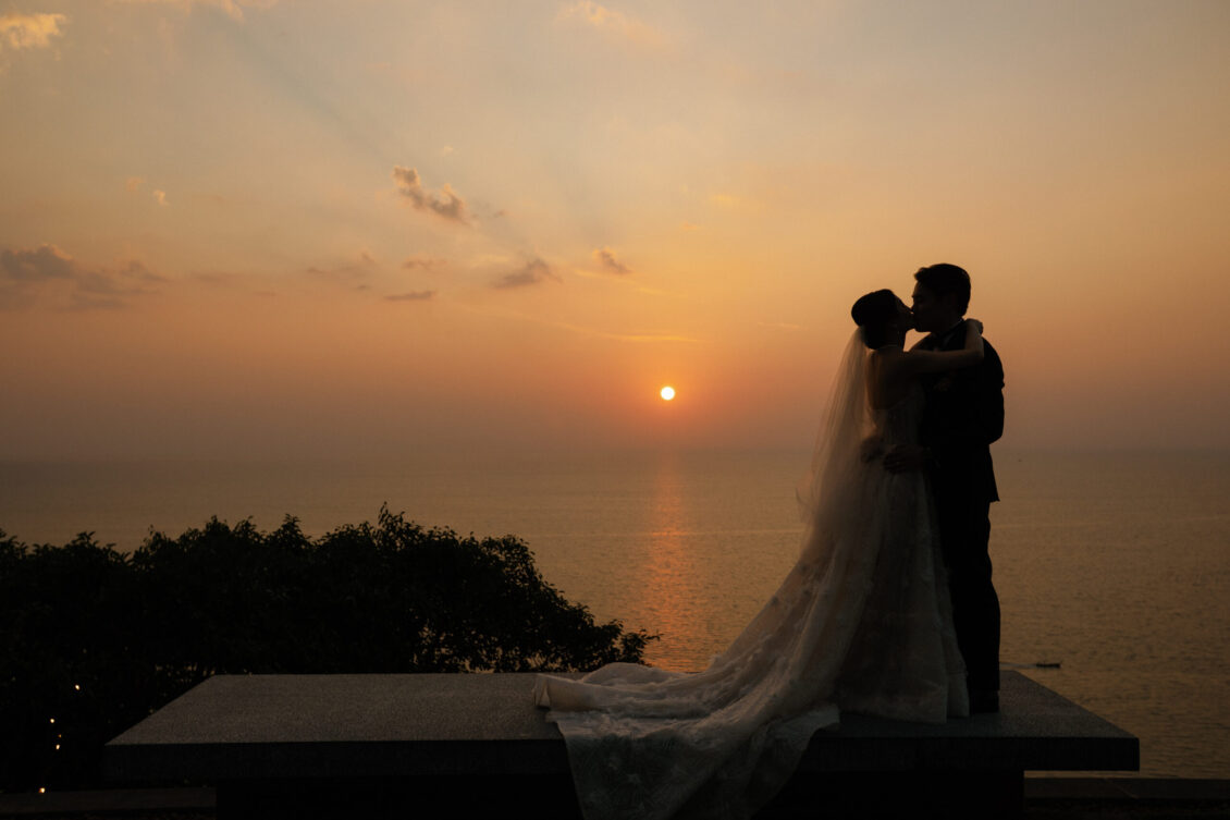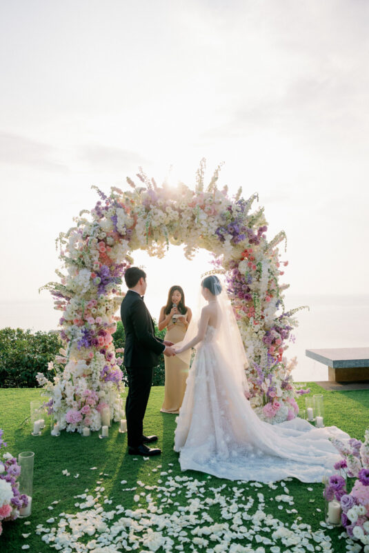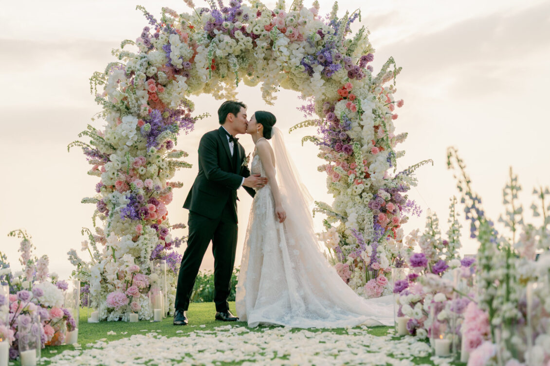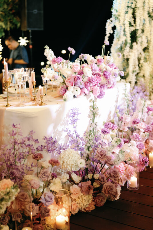 Cheryle and Johnnie’s destination wedding at Paresa Resort Phuket was the epitome of effortless elegance in Phuket. Surrounded by panoramic ocean views and kissed by a soft sea breeze, their seaside ceremony felt like a scene from a cinematic love story. Set against the turquoise horizon, the couple exchanged vows beneath a pastel-hued floral arch, where roses and orchids bloomed in delicate shades of pink, lilac, and ivory. The aisle, blanketed with white rose petals and flanked by lush floral clusters, struck a beautiful balance between luxurious and understated—proof that effortless elegance in Phuket comes down to thoughtful details and impeccable styling.