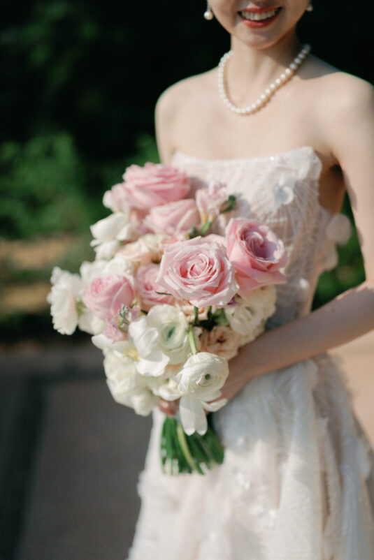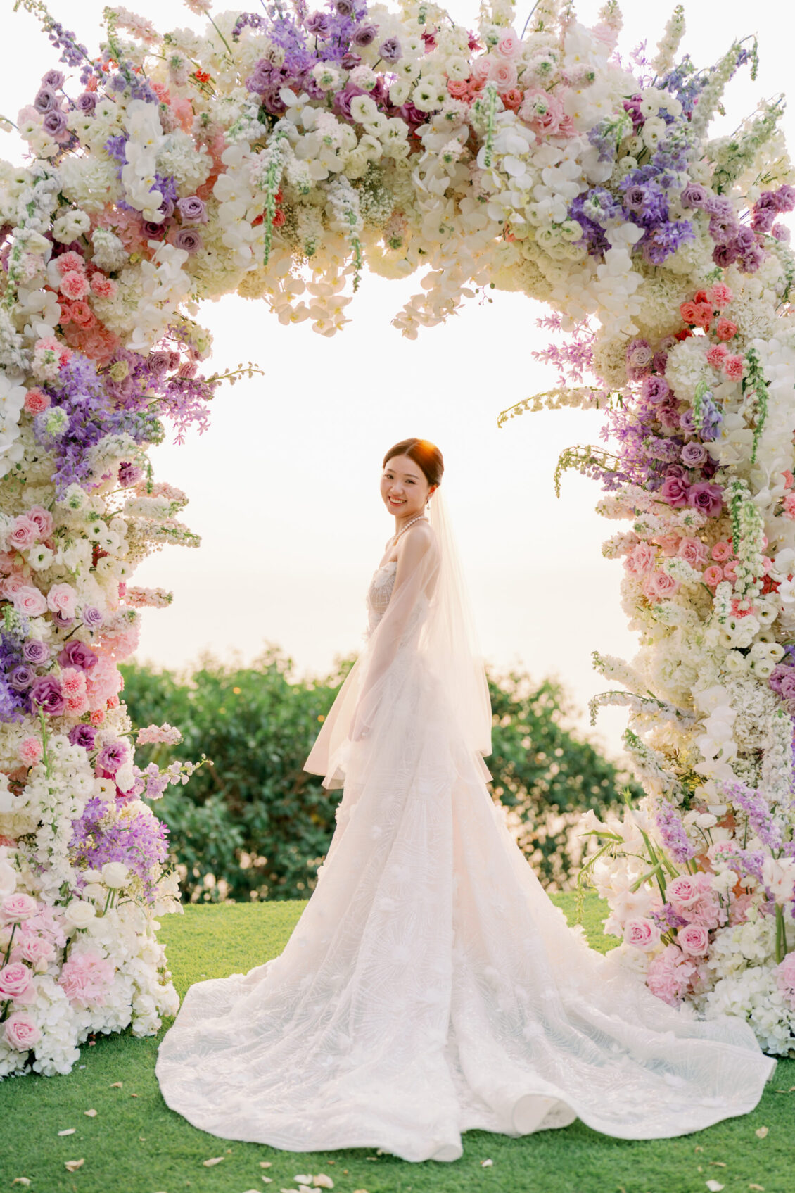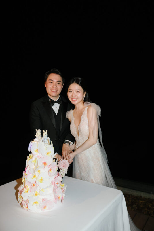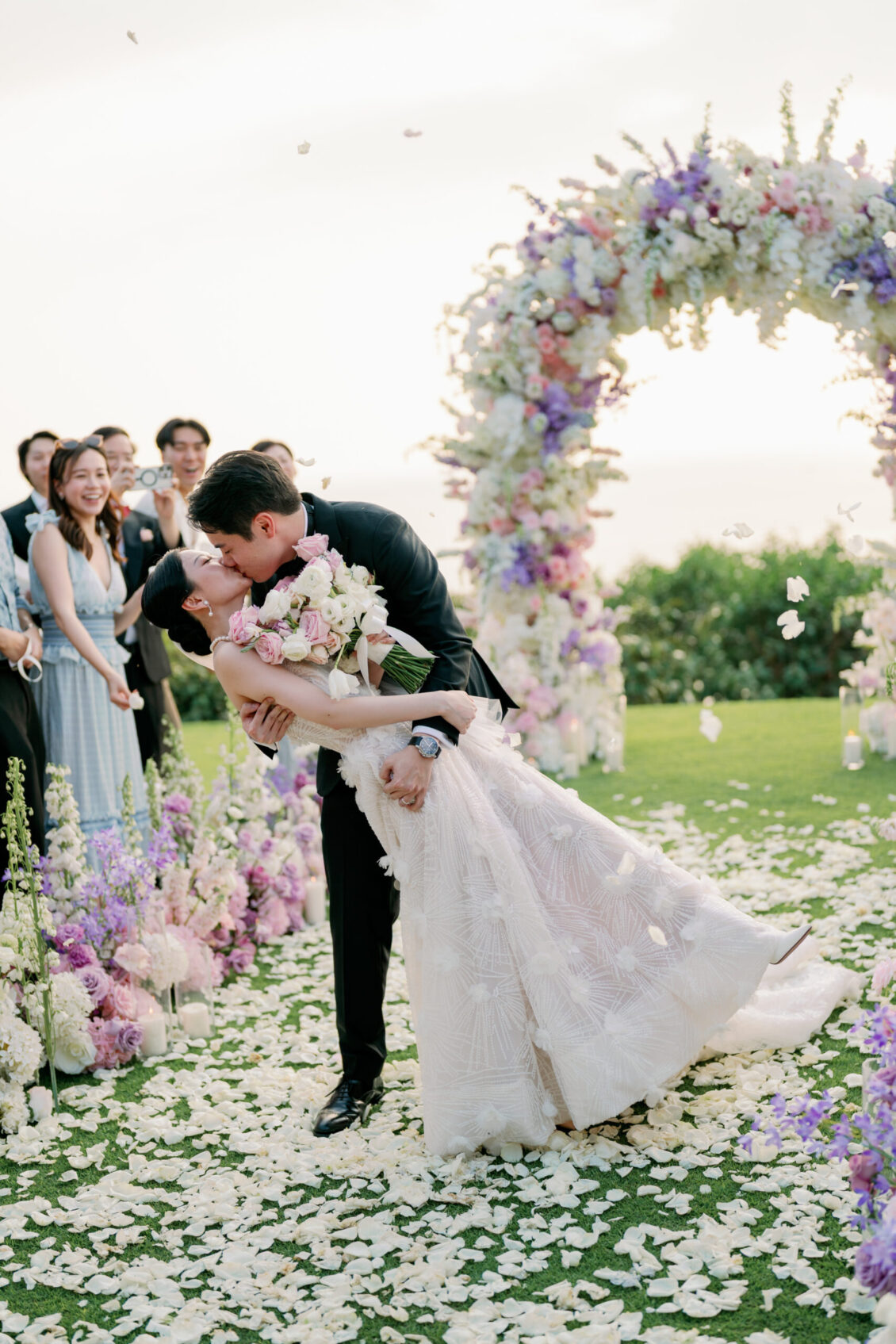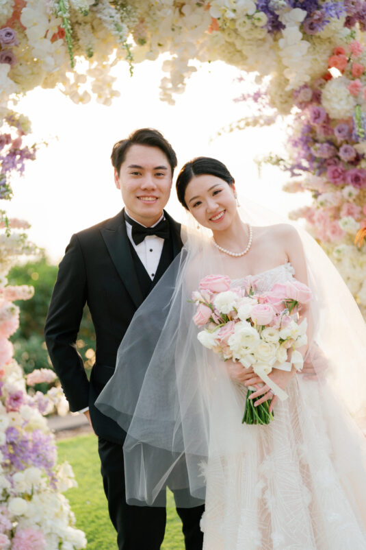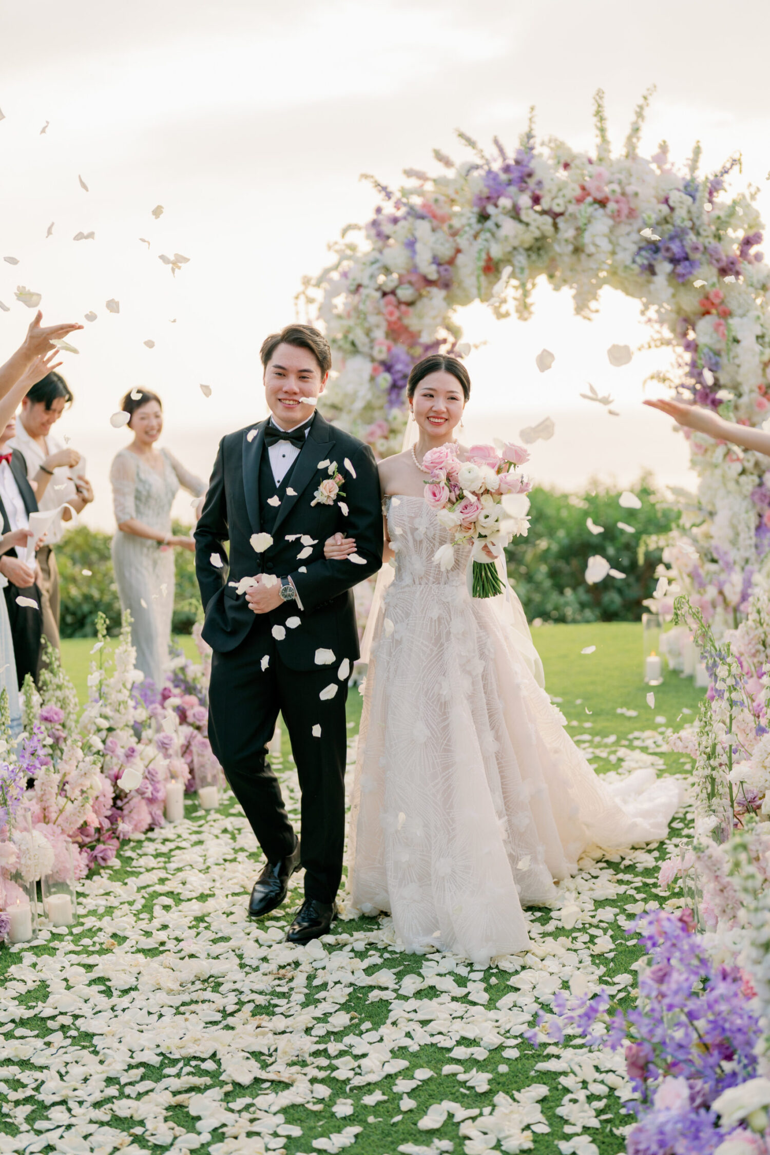 Cheryle and Johnnie’s destination wedding at Paresa Resort Phuket was the epitome of effortless elegance in Phuket. Surrounded by panoramic ocean views and kissed by a soft sea breeze, their seaside ceremony felt like a scene from a cinematic love story. Set against the turquoise horizon, the couple exchanged vows beneath a pastel-hued floral arch, where roses and orchids bloomed in delicate shades of pink, lilac, and ivory. The aisle, blanketed with white rose petals and flanked by lush floral clusters, struck a beautiful balance between luxurious and understated—proof that effortless elegance in Phuket comes down to thoughtful details and impeccable styling.