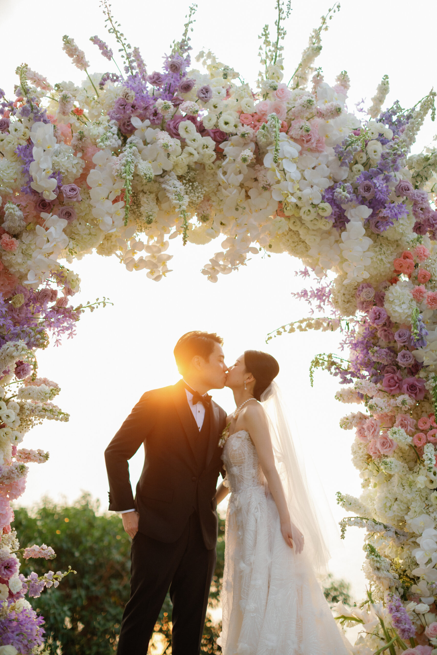 A bride and groom share a kiss beneath a large pastel floral arch during an outdoor wedding at Paresa Resort Phuket, with sunlight shining through behind them.