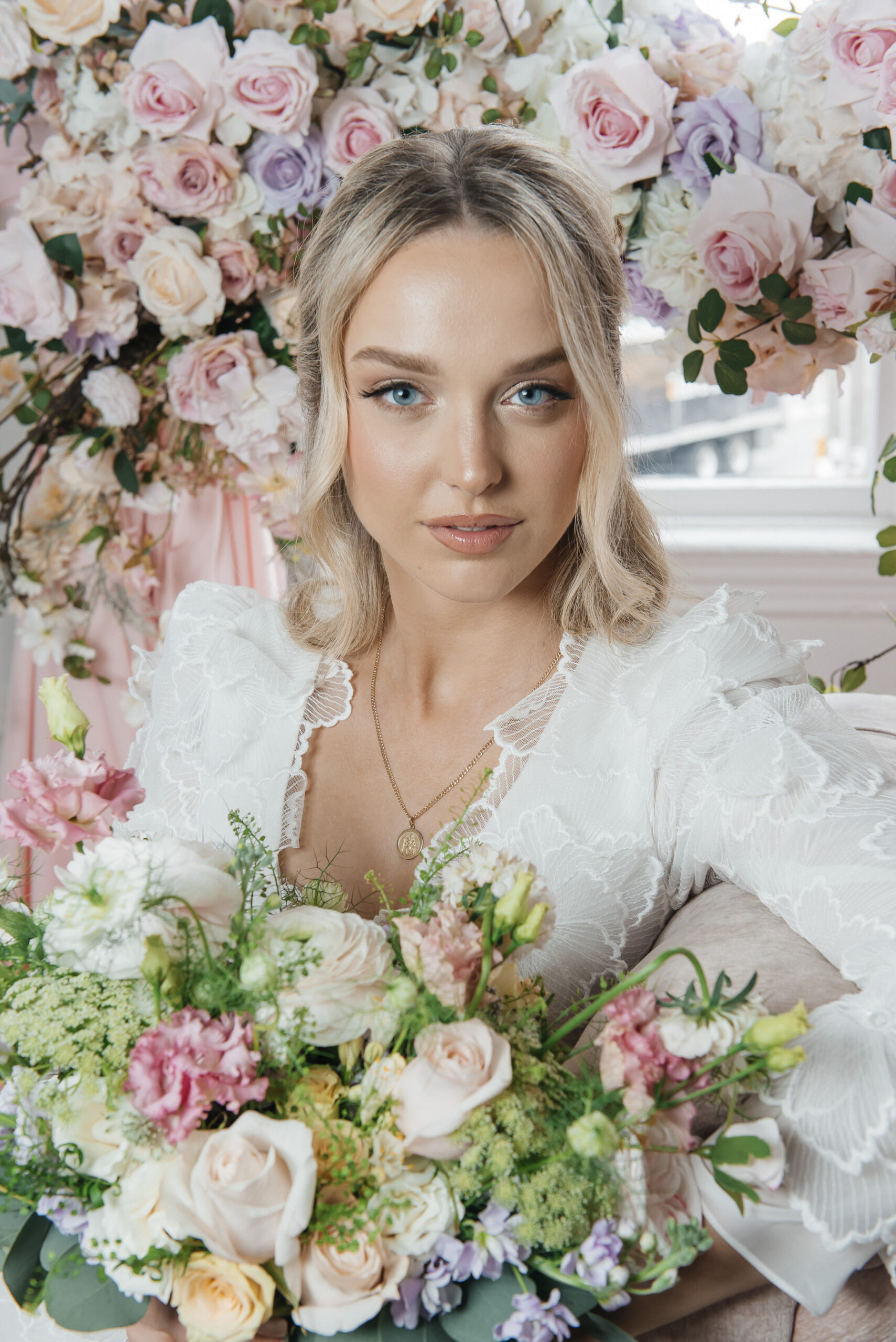 A woman in a white lace dress holds a bouquet of pastel flowers, surrounded by lush floral arrangements. With blonde hair in loose waves, she embodies Serenity in Bloom wedding inspiration as she gazes softly at the camera.