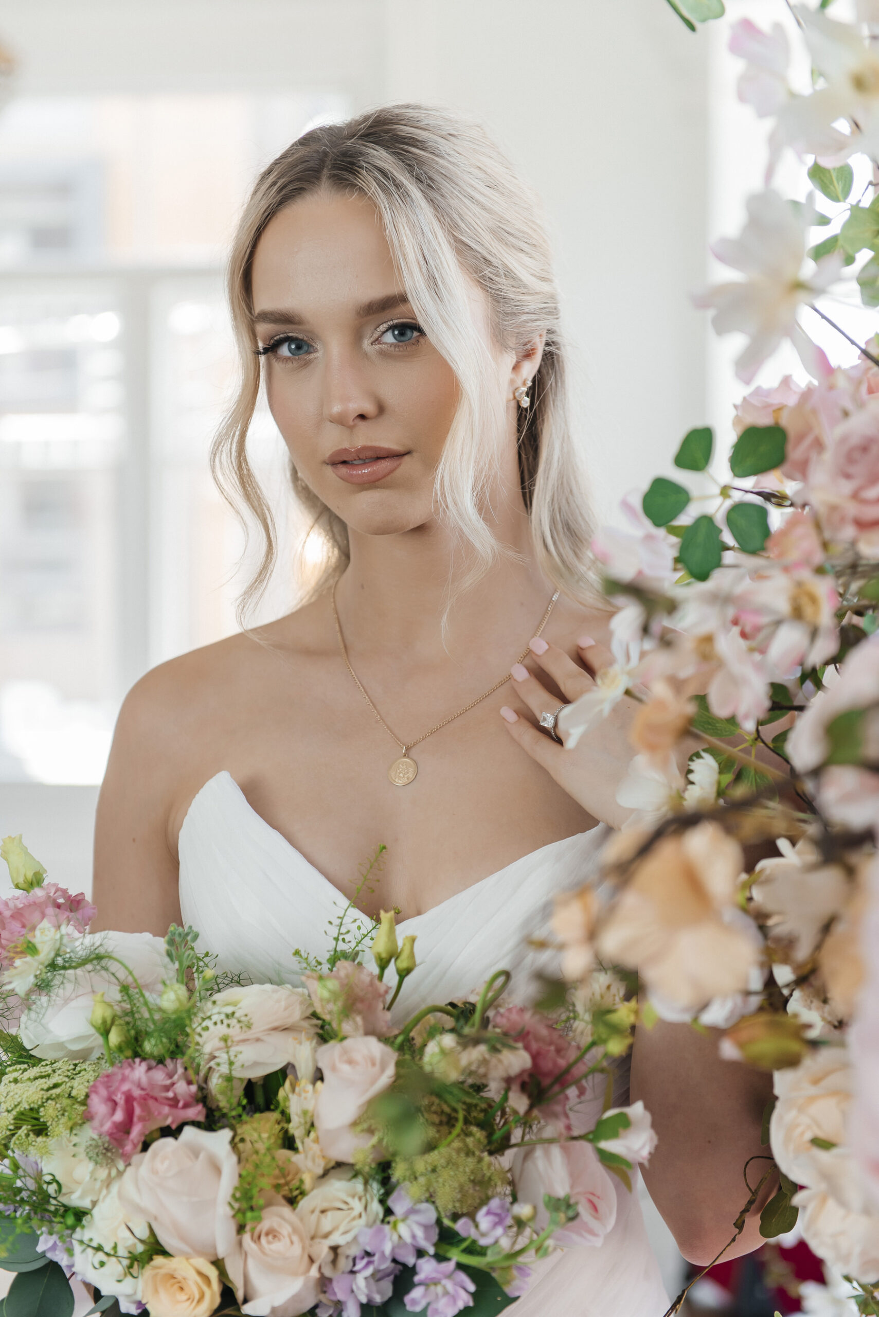 A bride with long blonde hair styled in loose waves wears a white strapless dress and gold necklace, holding a bouquet of pastel flowers. She radiates Serenity in Bloom wedding inspiration, standing near a floral arrangement in a bright room.