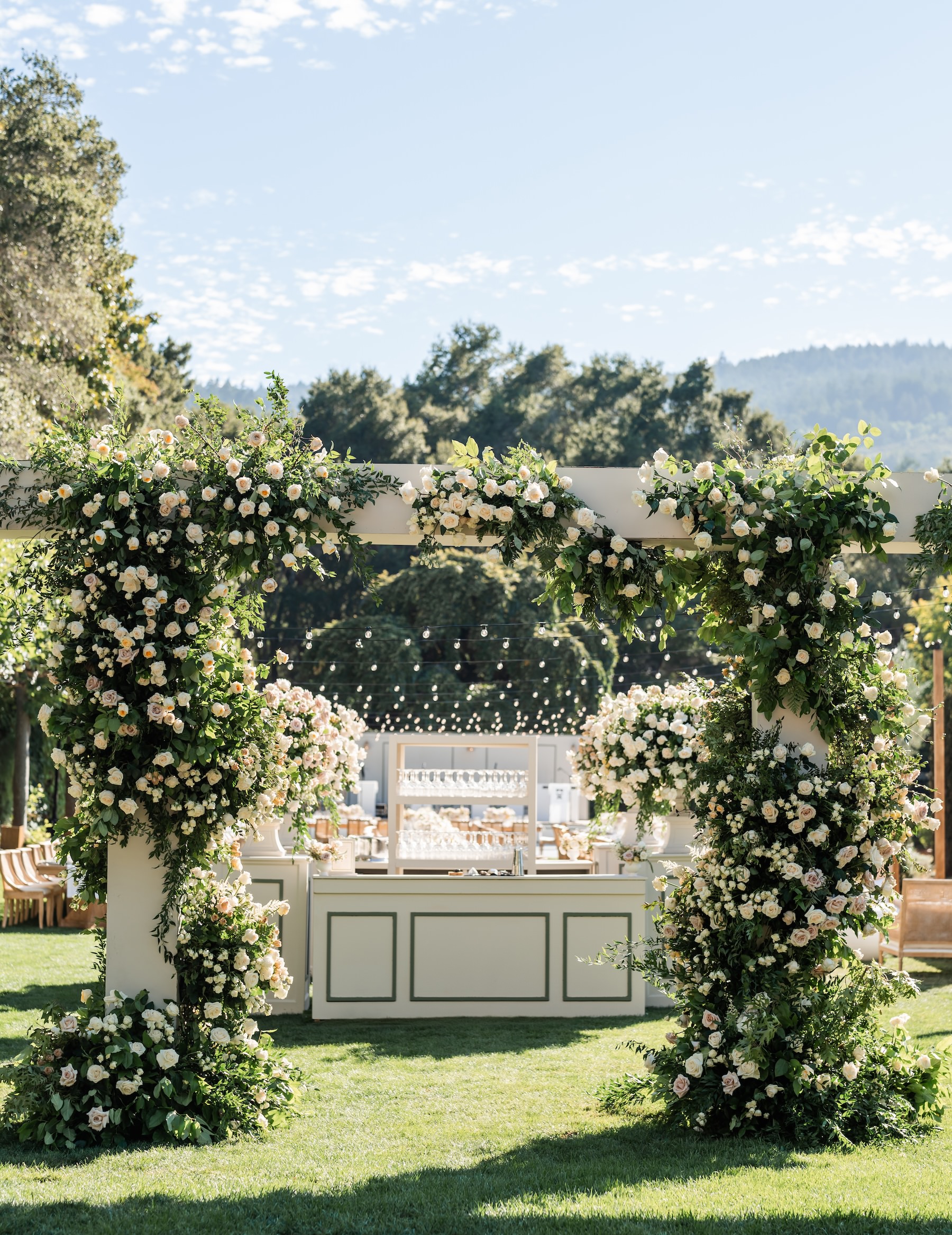 Elegant outdoor wedding reception setup at Filoli Gardens, featuring a floral archway, abundant white and blush roses, greenery, and a light-colored decorated bar. String lights and trees enhance this luxury garden wedding on a sunny day.