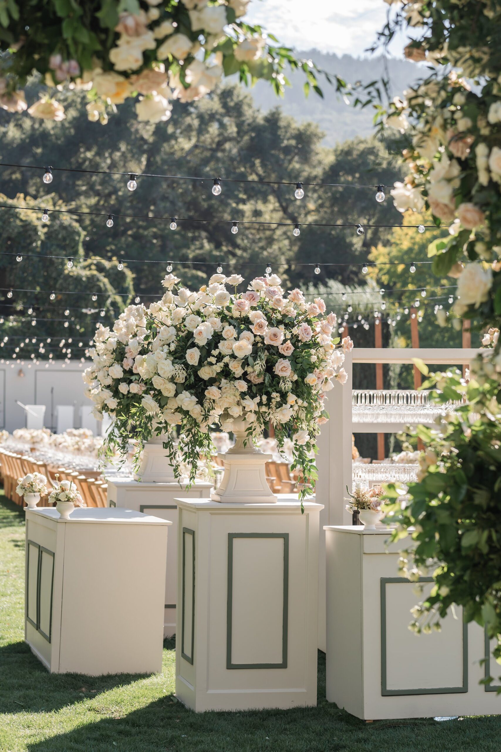 Elegant outdoor wedding setup with large white and blush flower arrangements on white pedestals, surrounded by greenery and string lights, evokes a luxury garden wedding at Filoli Gardens, with tables and chairs artfully arranged in the background.