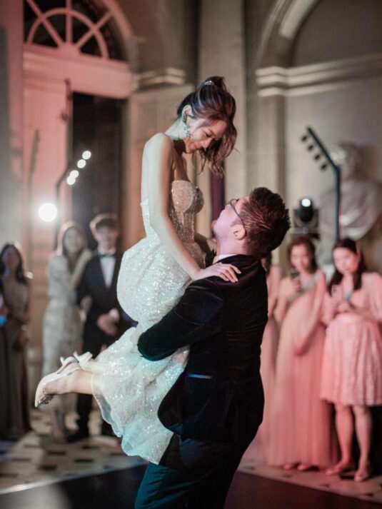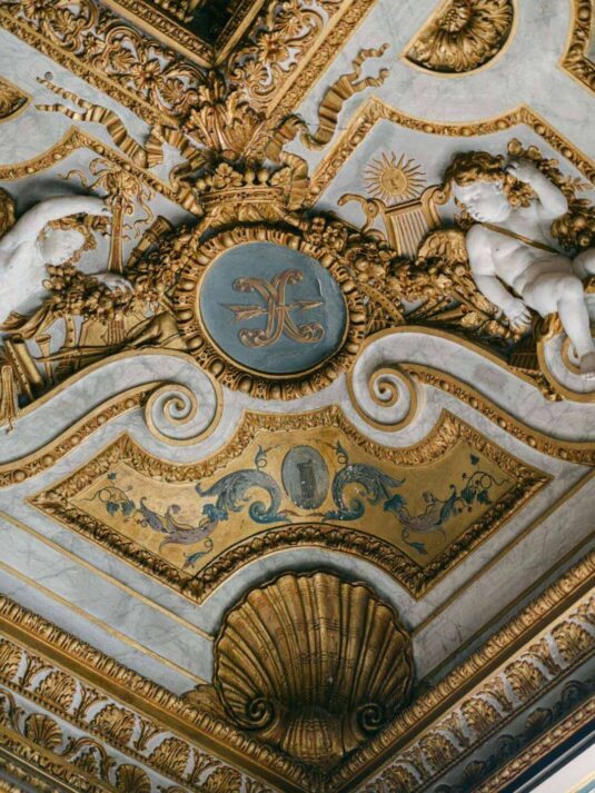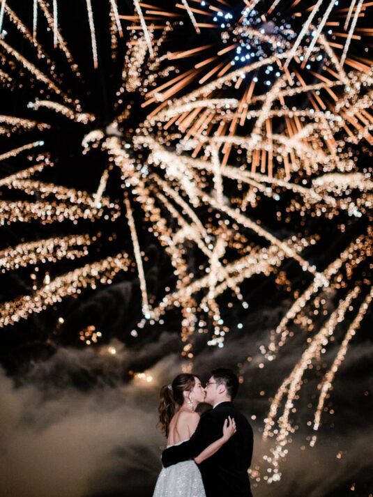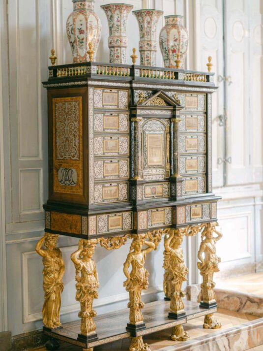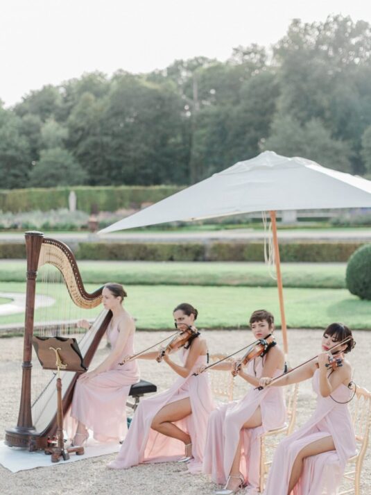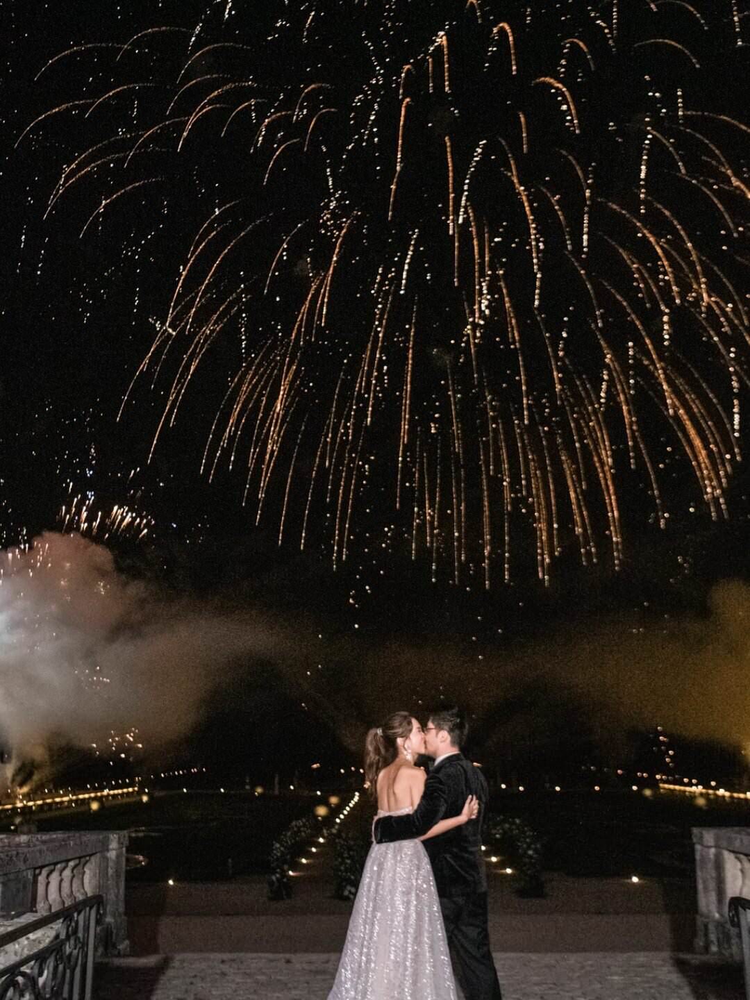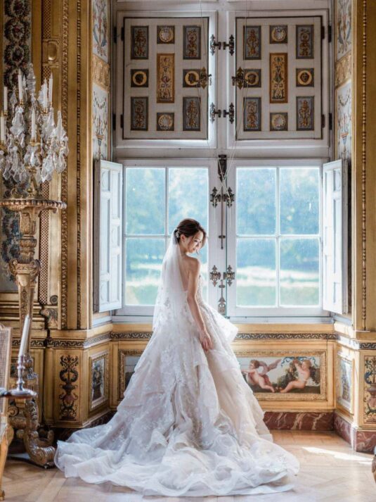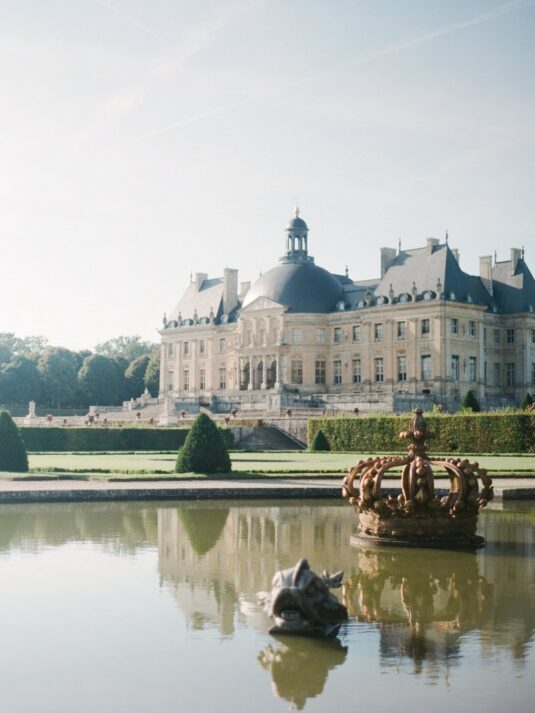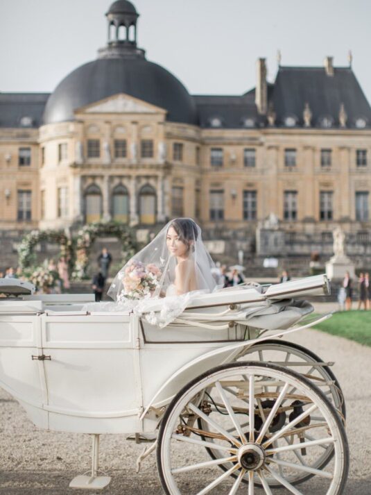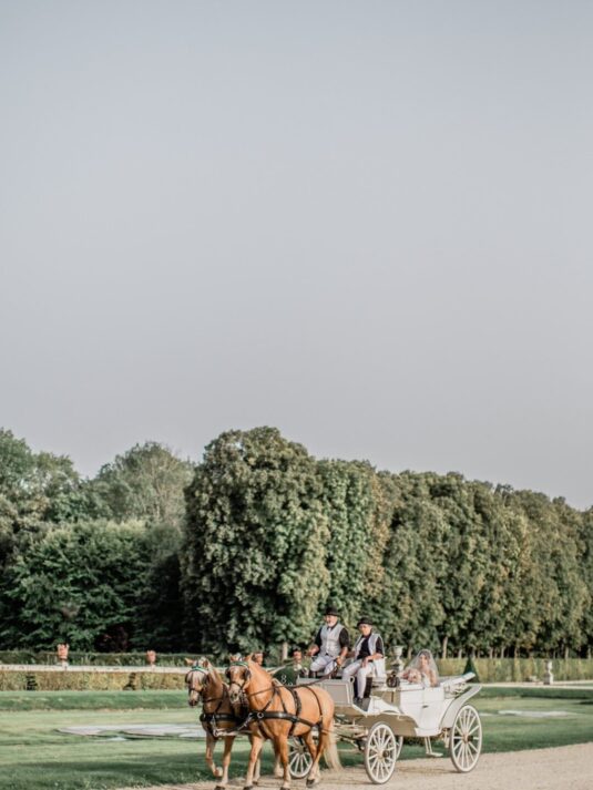 The château’s Grand Salon served as the stage for a glamorous reception complete with a horse-drawn carriage, fireworks, and immersive video mapping, while Lenôtre catering delivered an exquisite French menu. Guests were serenaded throughout the day by a harpist, violinist, and lively band, creating a celebratory atmosphere that balanced sophistication with joy. This Château de Vaux-le-Vicomte wedding proves how world-class planning, thoughtful design, and cultural tradition can come together to create a luxury destination wedding experience that is at once intimate, visually stunning, and utterly unforgettable.