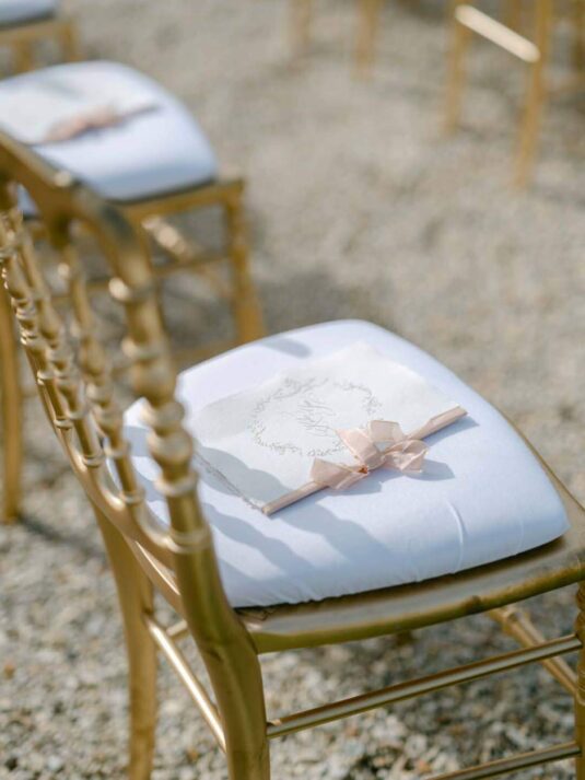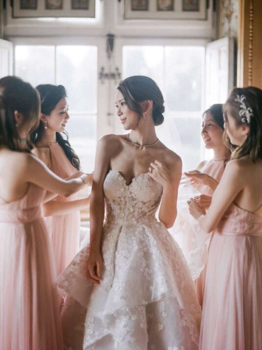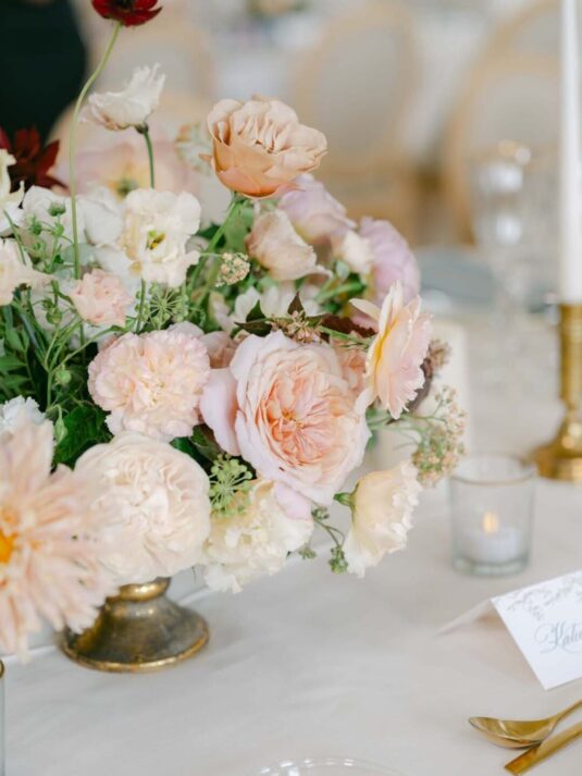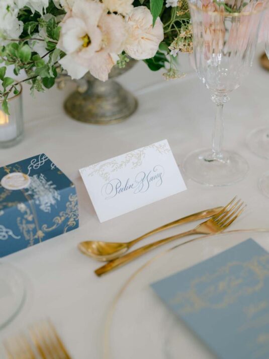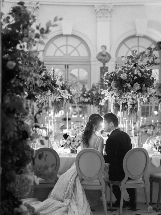 , whose meticulous planning and expert coordination ensured a seamless experience despite the complexities of hosting an event in a historic museum. Every element of this Château de Vaux-le-Vicomte wedding—from the blush-toned floral designs by Floraison to the French calligraphy invitations and custom napkins—was carefully curated to reflect Katie and Jim’s style. The couple’s attire elevated the celebration further, with Jim in Tom Ford and Katie in three show-stopping gowns, including a Monique Lhuillier masterpiece.