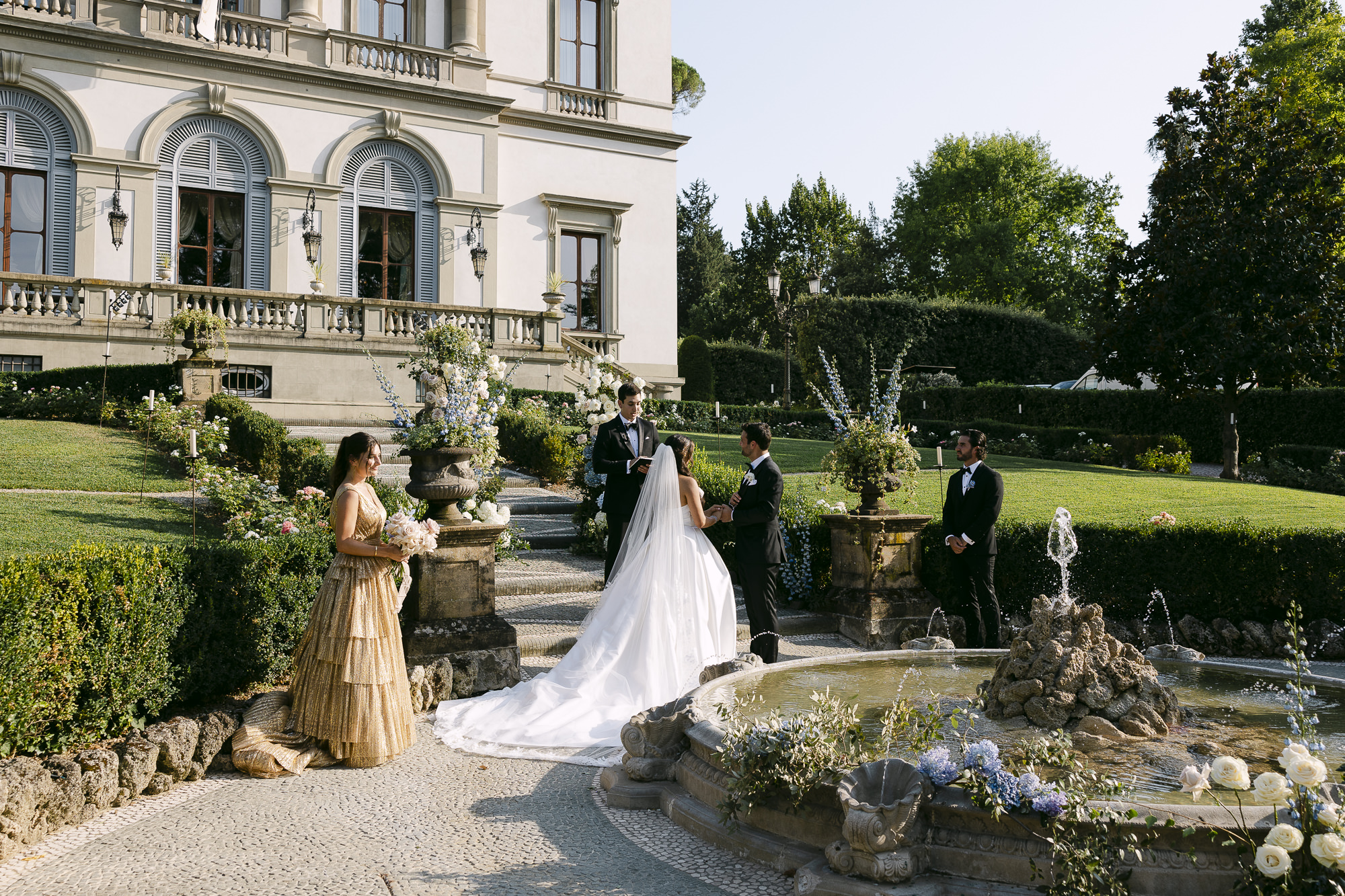 A bride and groom stand at an outdoor wedding ceremony in front of a classical building, surrounded by greenery, fountains, and a small group of elegantly dressed guests—a luxury celebration at Villa Cora.