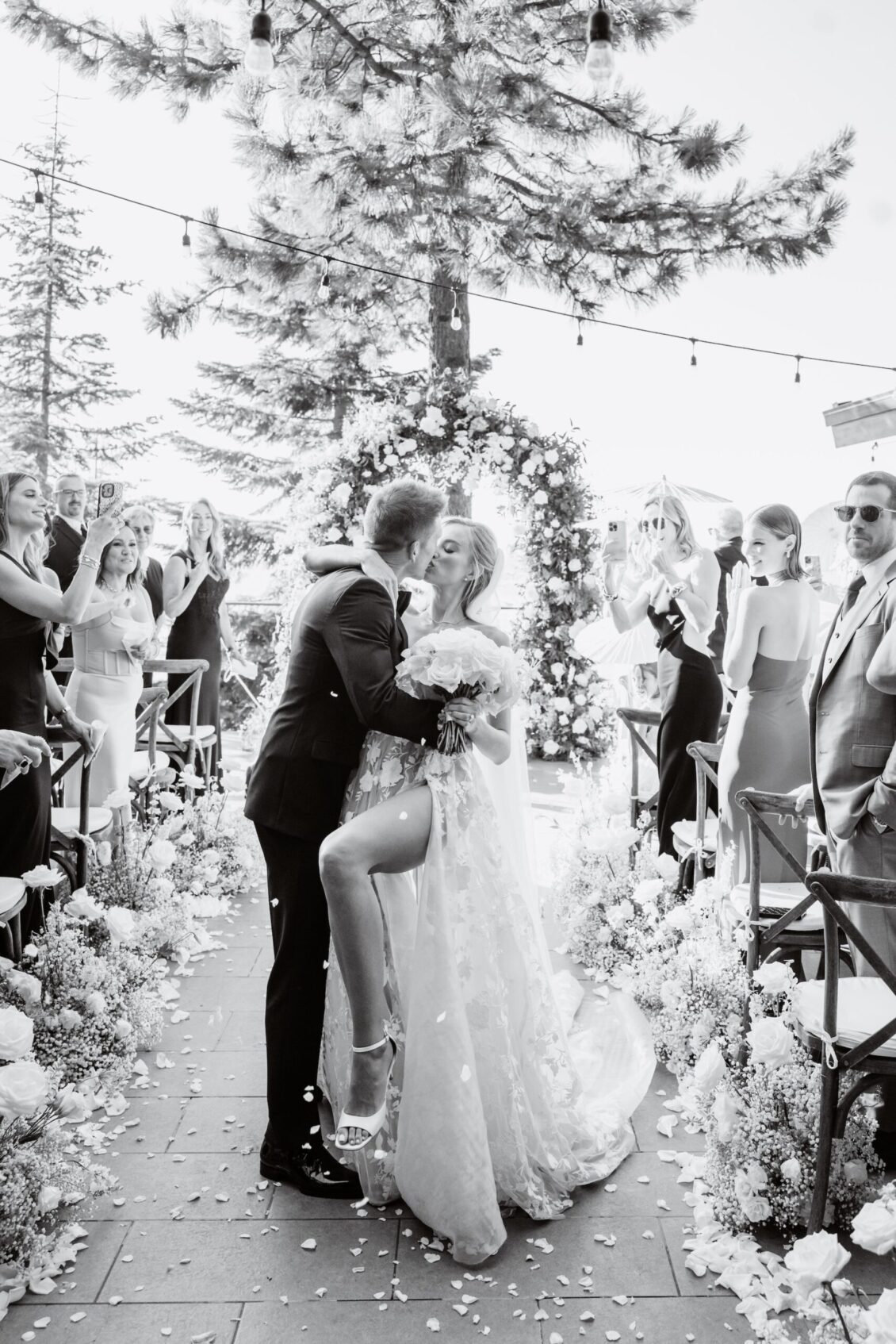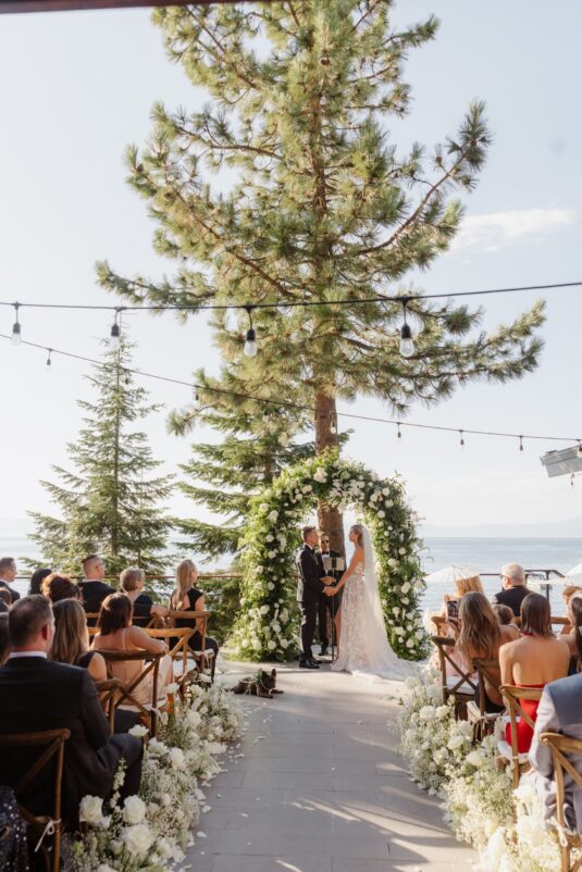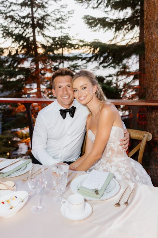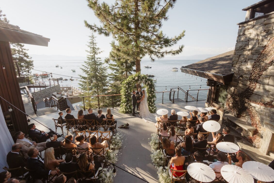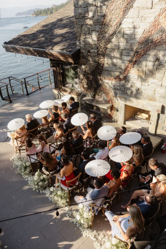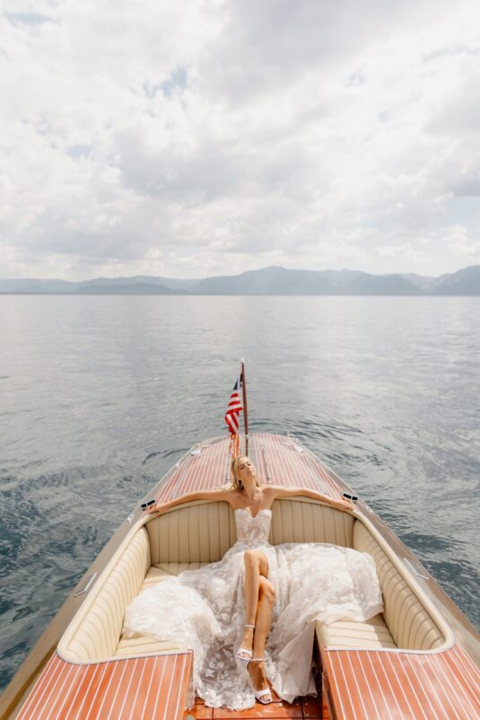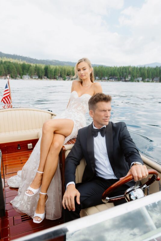 The festivities didn’t end there. Guests enjoyed a post-wedding beach BBQ with their favorite OC butcher, Aperol spritzes, and leisurely boat cruises across the lake—a perfect balance of luxury and laid-back charm. From the groom’s hilarious stint as MC to the poignant moment a hummingbird appeared during the bride’s walk down the aisle in honor of her late grandfather, every detail of this luxury destination wedding in Lake Tahoe was layered with meaning. It was not just a wedding—it was a once-in-a-lifetime celebration of love, style, and soul.